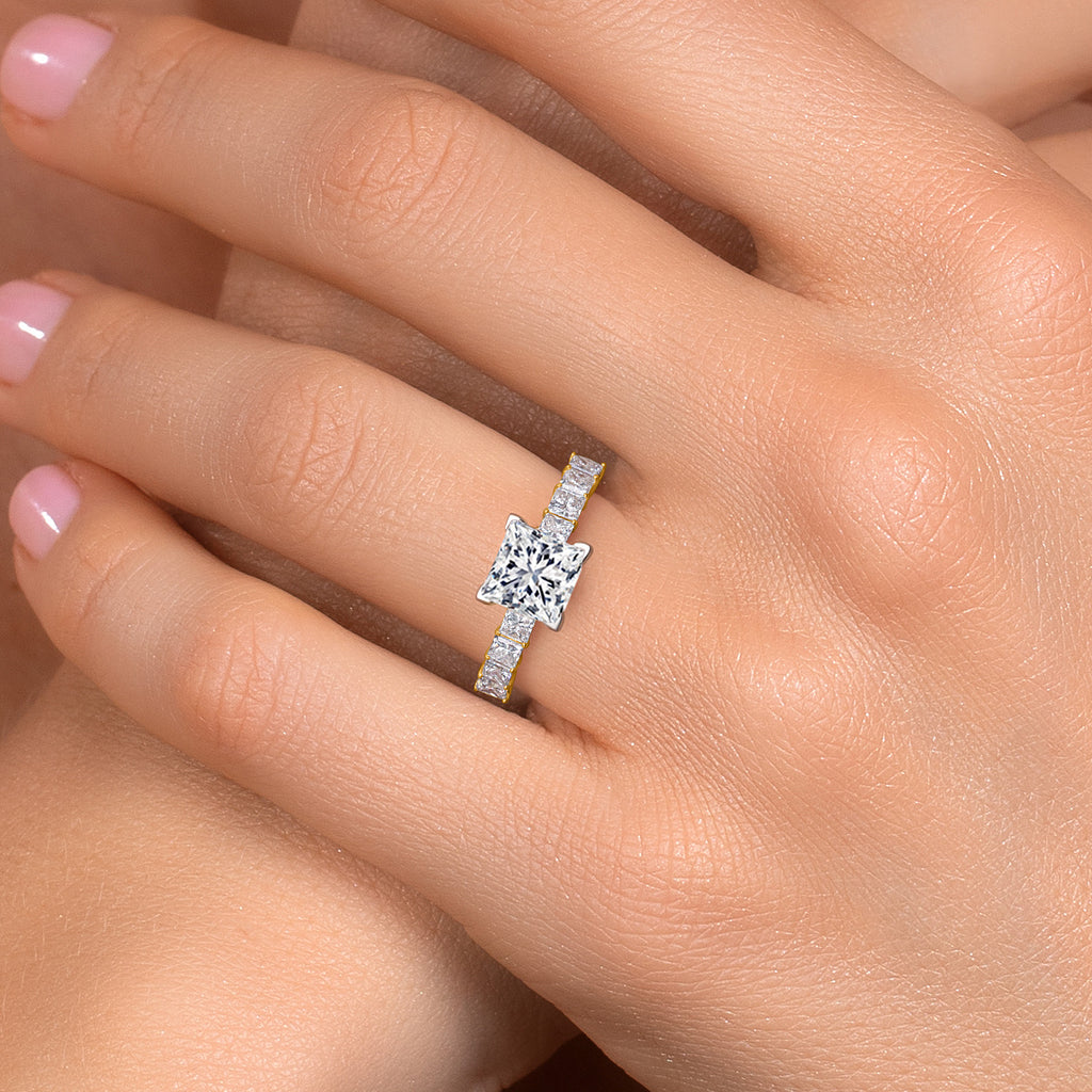 PRINCESS CUT LAB GROWN DIAMOND: This exquisite engagement ring features an IGI certified 2.00 carat princess-cut lab-grown diamond, totaling 2.96 carats. With E-F color and VS1-VS2 clarity, it radiates brilliance, purity, and timeless sophistication.