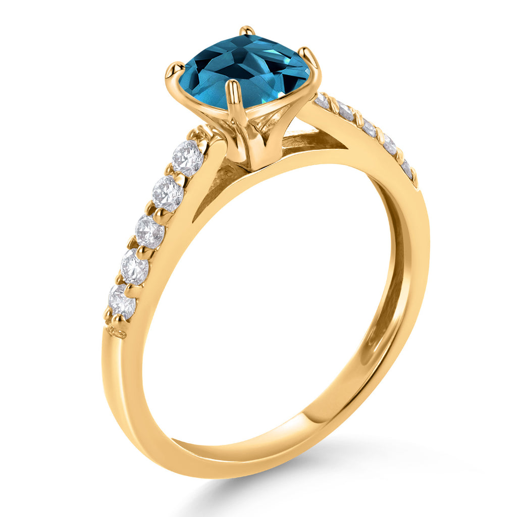MEASUREMENTS: 8x8mm Cushion Irradiated London Blue Topaz, 1.7x1.7mm Round E - F Lab Grown Diamond. Total Carat Weight is 3 cttw