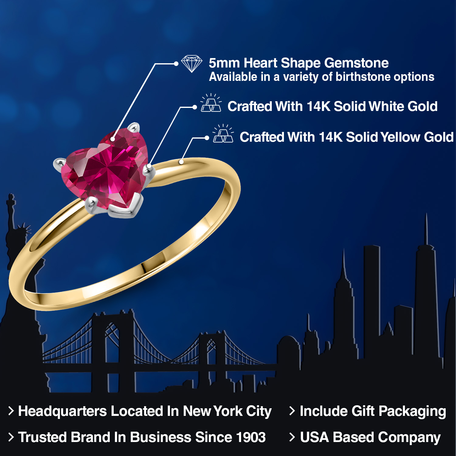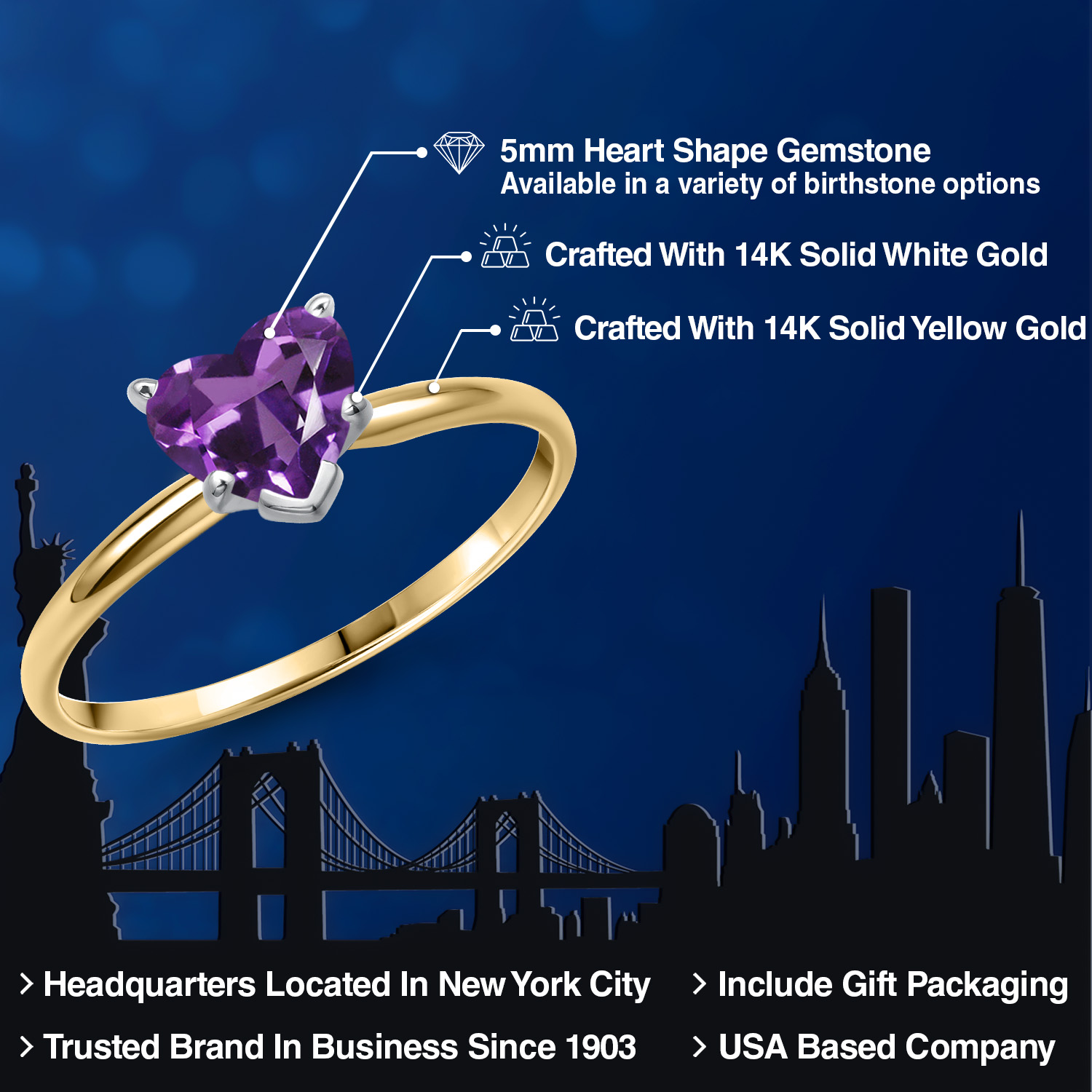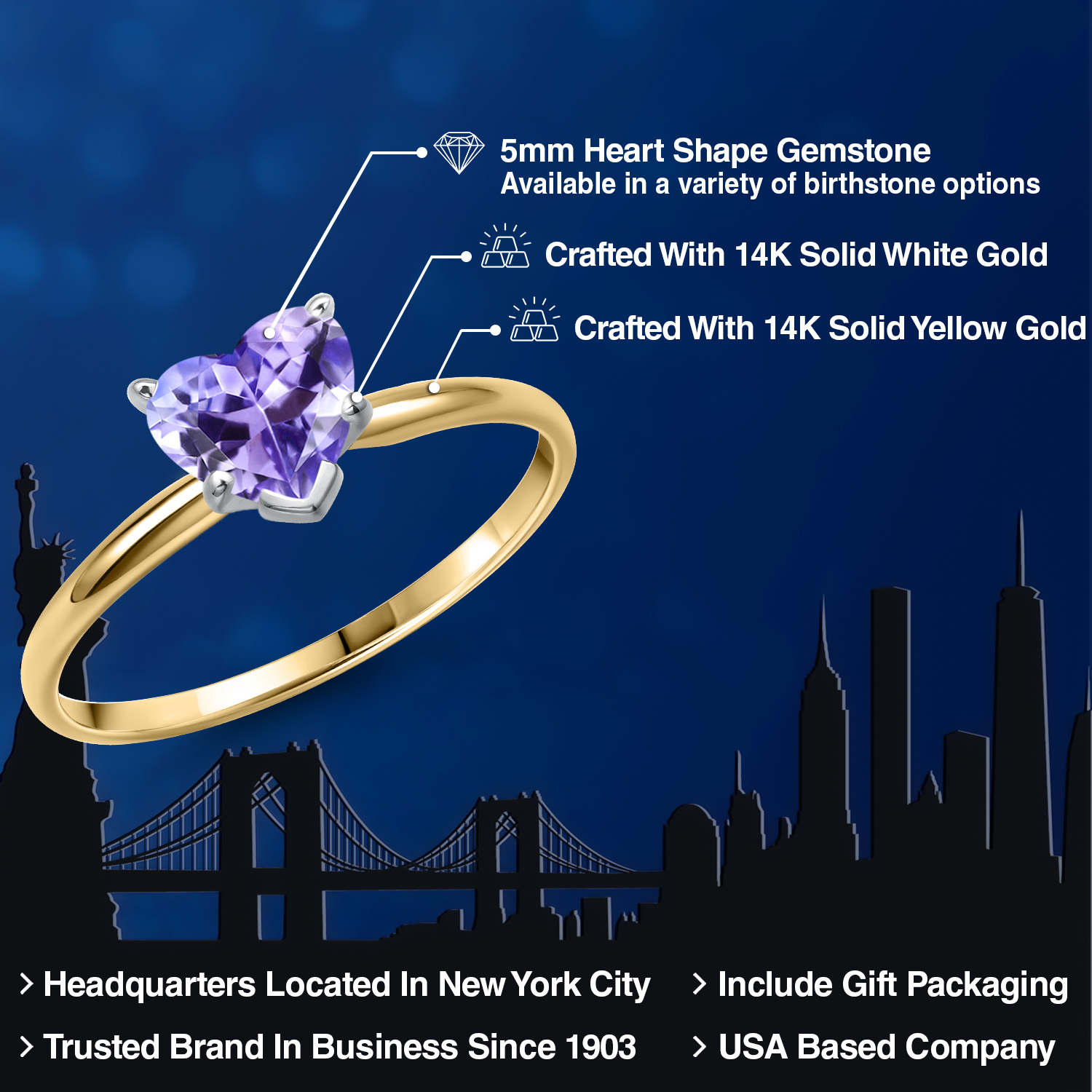 MAJESTIC 5MM HEART-SHAPED GEMSTONE: This elegantly crafted ring features a heart-shaped gemstone, measuring 5MM , that stands as a brilliant tribute to love. Available in a range of birthstone options, this solitaire engagement ring's gemstone boasts stunning clarity and brilliance, making it an exceptional piece of jewelry that is as unique and radiant as the woman who wears it.