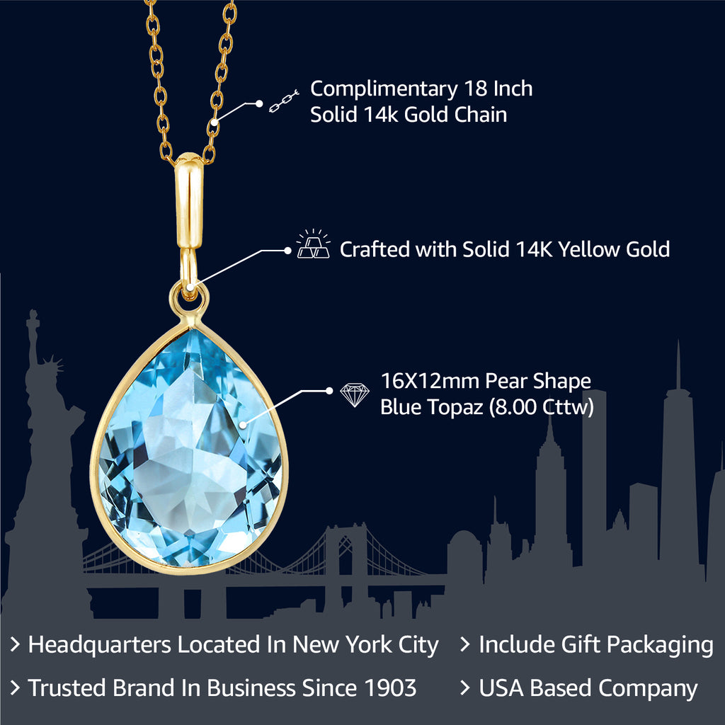 EXQUISITE BLUE TOPAZ PENDANT: This pendant necklace features a stunning pear-shaped blue topaz gemstone, measuring 16X12MM and totaling 8.00 Ct, elegantly set in 14K yellow gold, creating a captivating and sophisticated look.