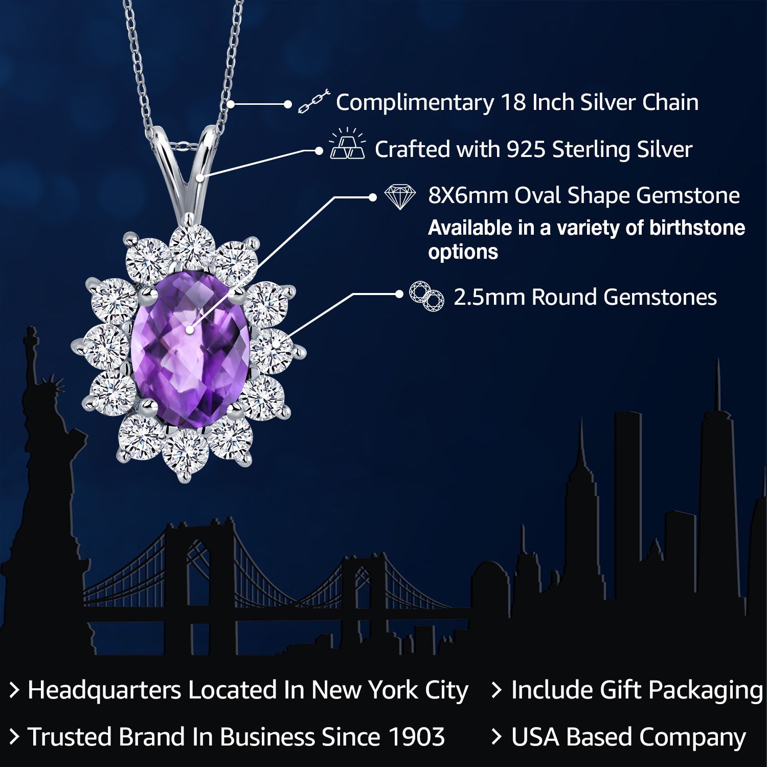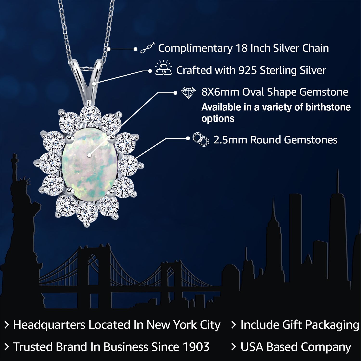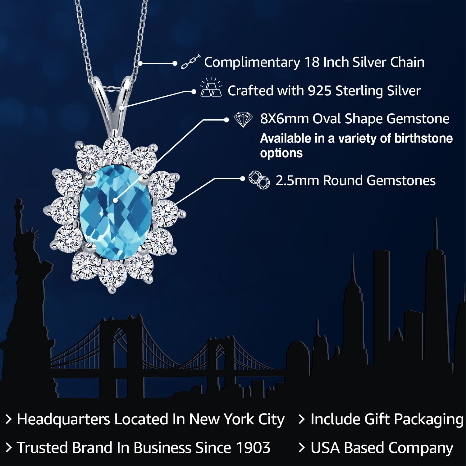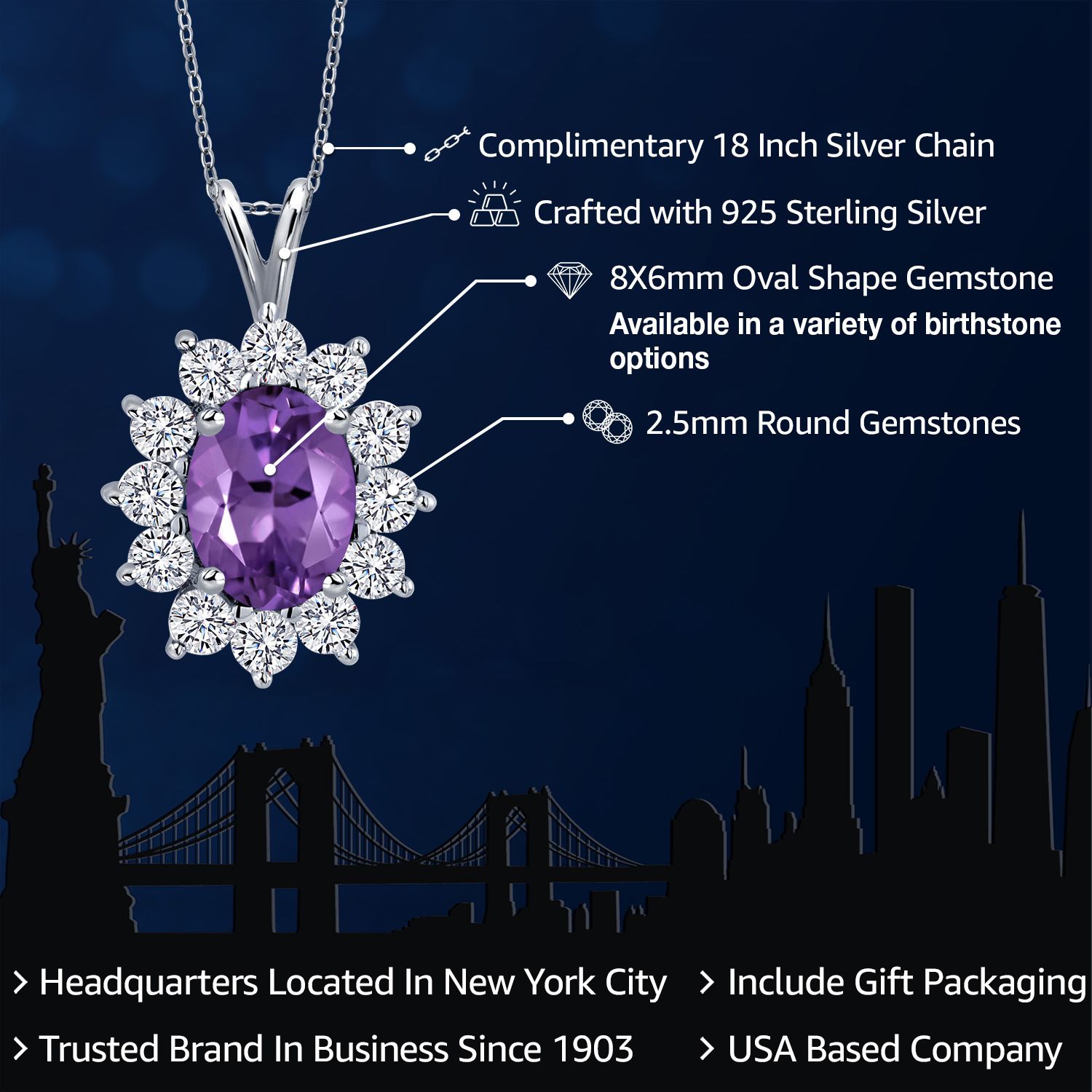 EXQUISITE GEMSTONE PENDANT: This pendant features a captivating oval 8x6mm gemstone birthstone, chosen to symbolize the wearer's birth month or personal preference. The gemstone is securely set within a halo of sterling silver, enhancing its brilliance and creating a stunning focal point.