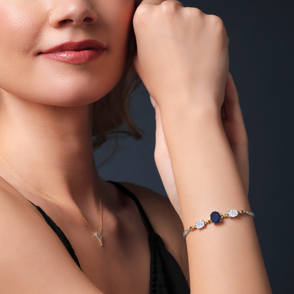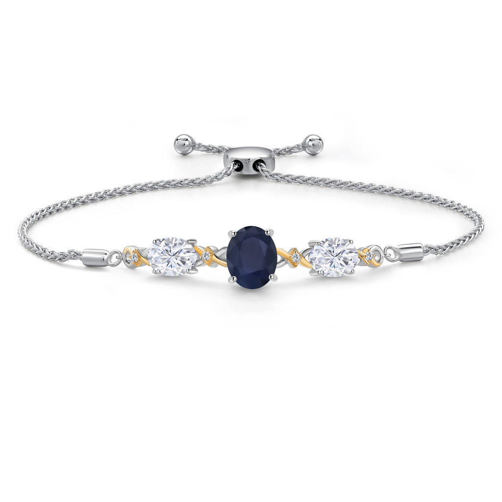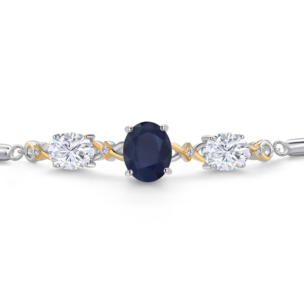 925 Silver & 10K Yellow Gold Blue Sapphire White Moissanite & Lab Grown Diamond Bracelet For Women | 6.06 Cttw | Gemstone September Birthstone | Oval 10X8MM and 8X6MM | Fully Adjustable 9 Inch
