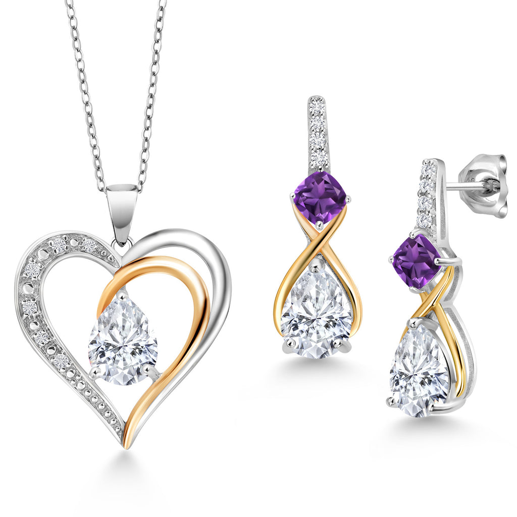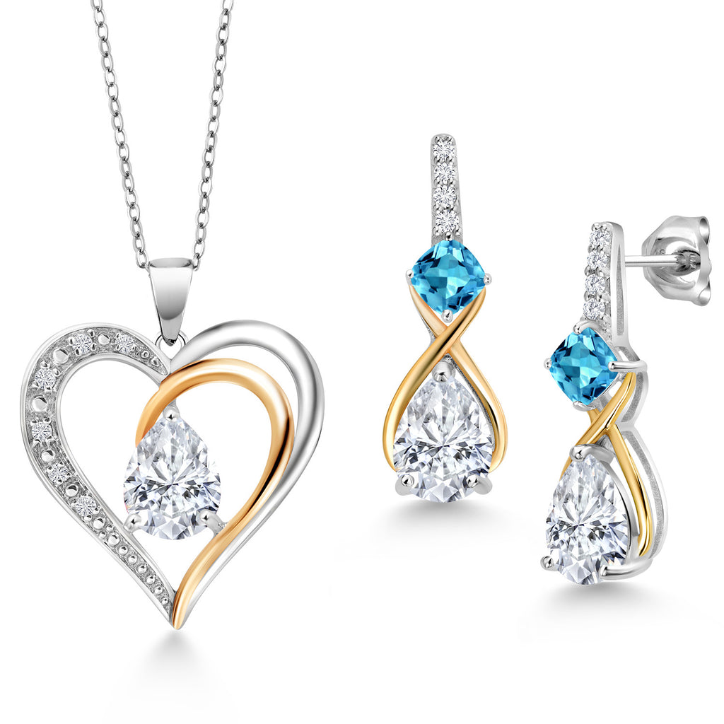 925 Silver & 10K Yellow Gold Gemstone Birthstone and Moissanite and Lab Grown Diamond Heart Pendant Necklace Earrings Set | Pear 8X6MM, Cushion 4MM | Two-Tone Jewelry for Her Mom Wife | 18 Inch Chain