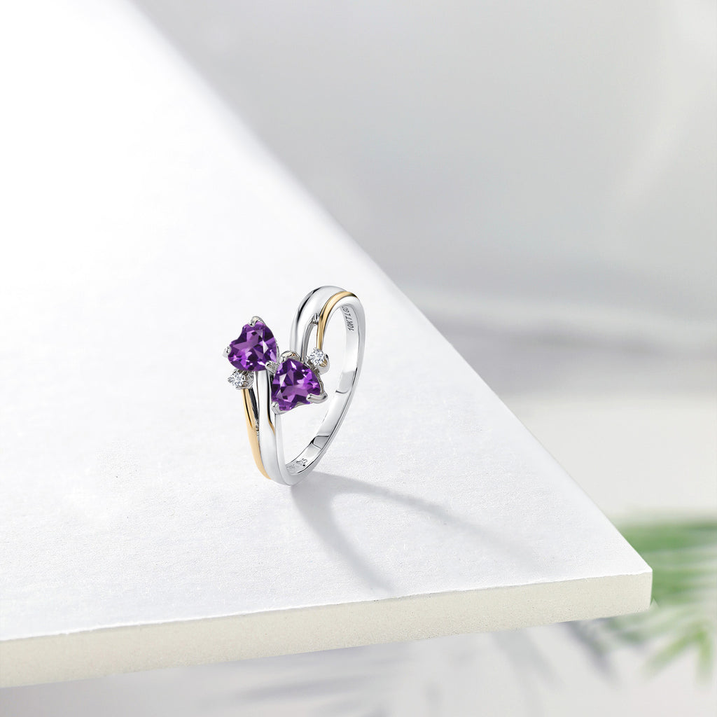 925 Silver and 10K Yellow Gold Purple Amethyst Gemstone Birthstone and White Lab Grown Diamond 2 Heart Promise Couple Engagement Mother Ring For Women 0.86 Cttw