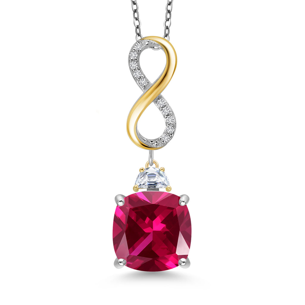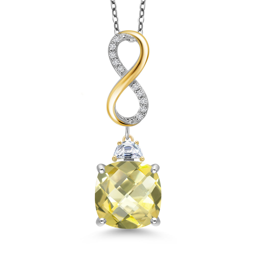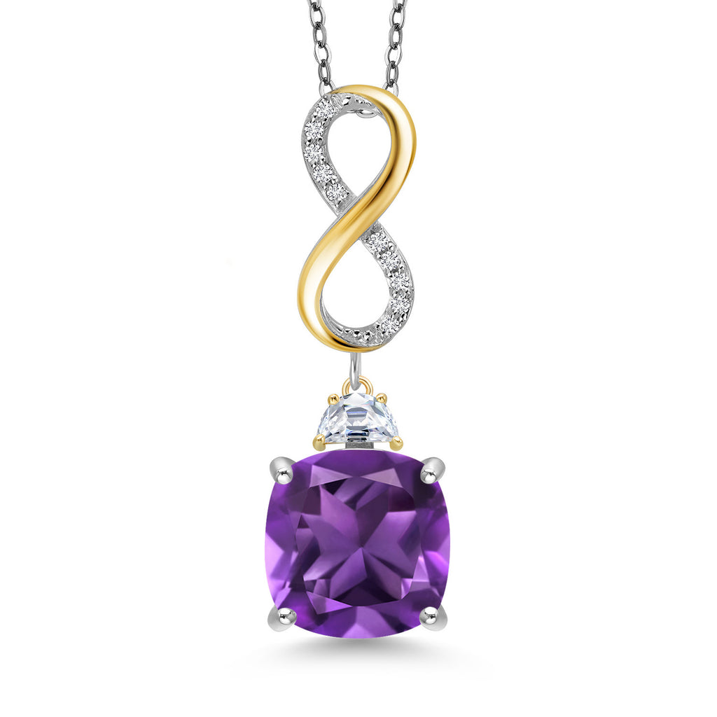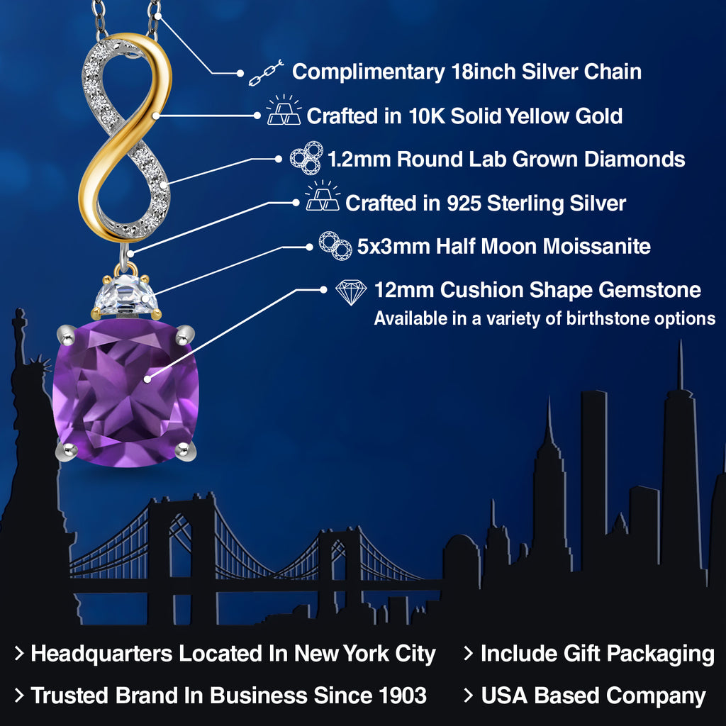 925 Silver and 10K Yellow Gold 12MM Cushion Gemstone Birthstone Drop Pendant Necklace For Women with Half Moon White Moissanite and White Lab Grown Diamond