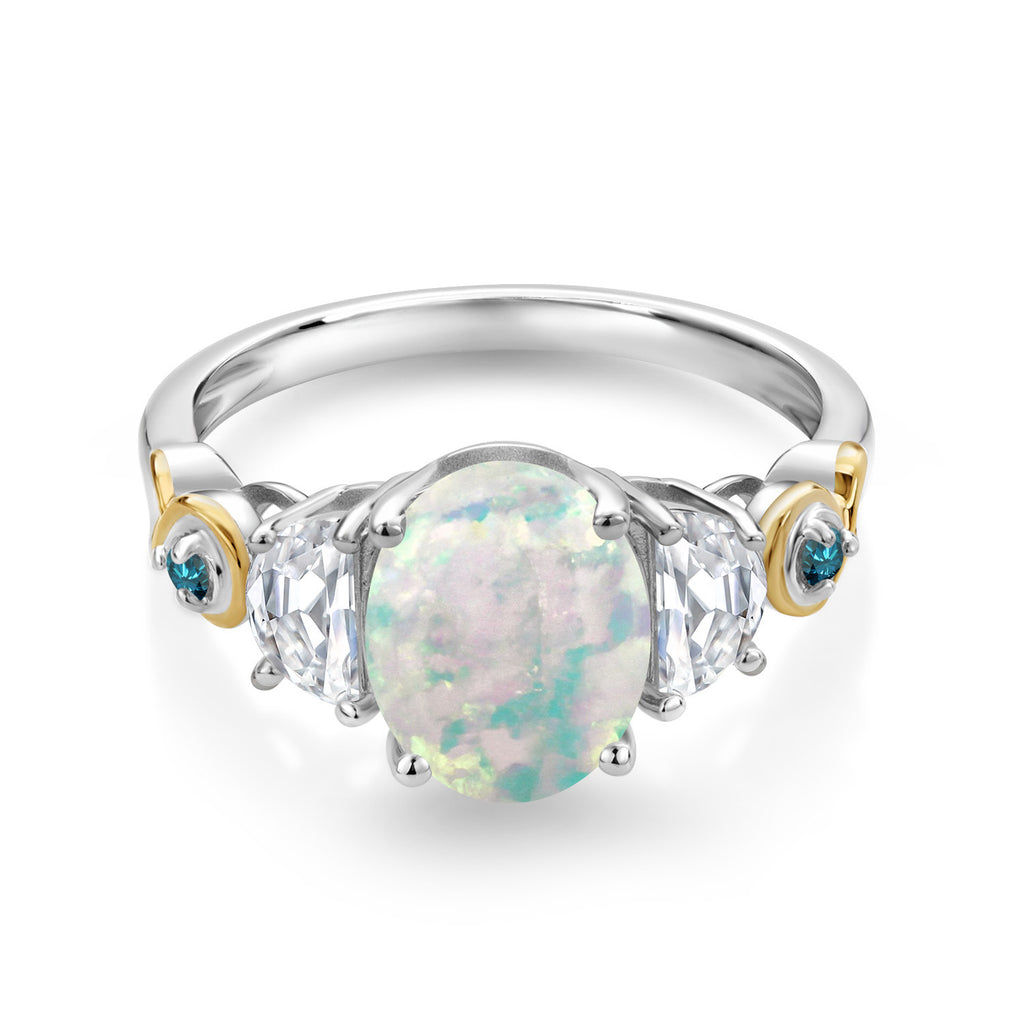 MEASUREMENTS: 9x7mm Oval Cabochon White Opal, 5x3mm Half Moon Near Colorless (GH) Moissanite1.7, x, 1.7, mm Round Irradiated Blue Diamond. Total Carat Weight is 1.51 cttw