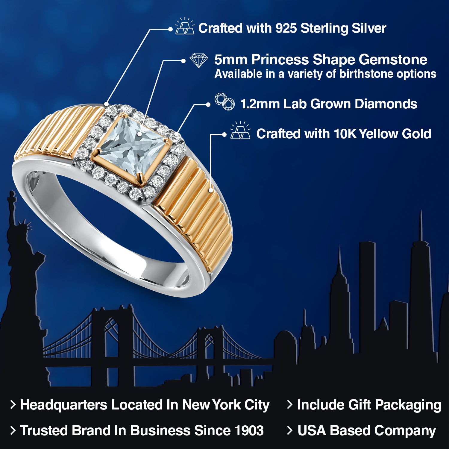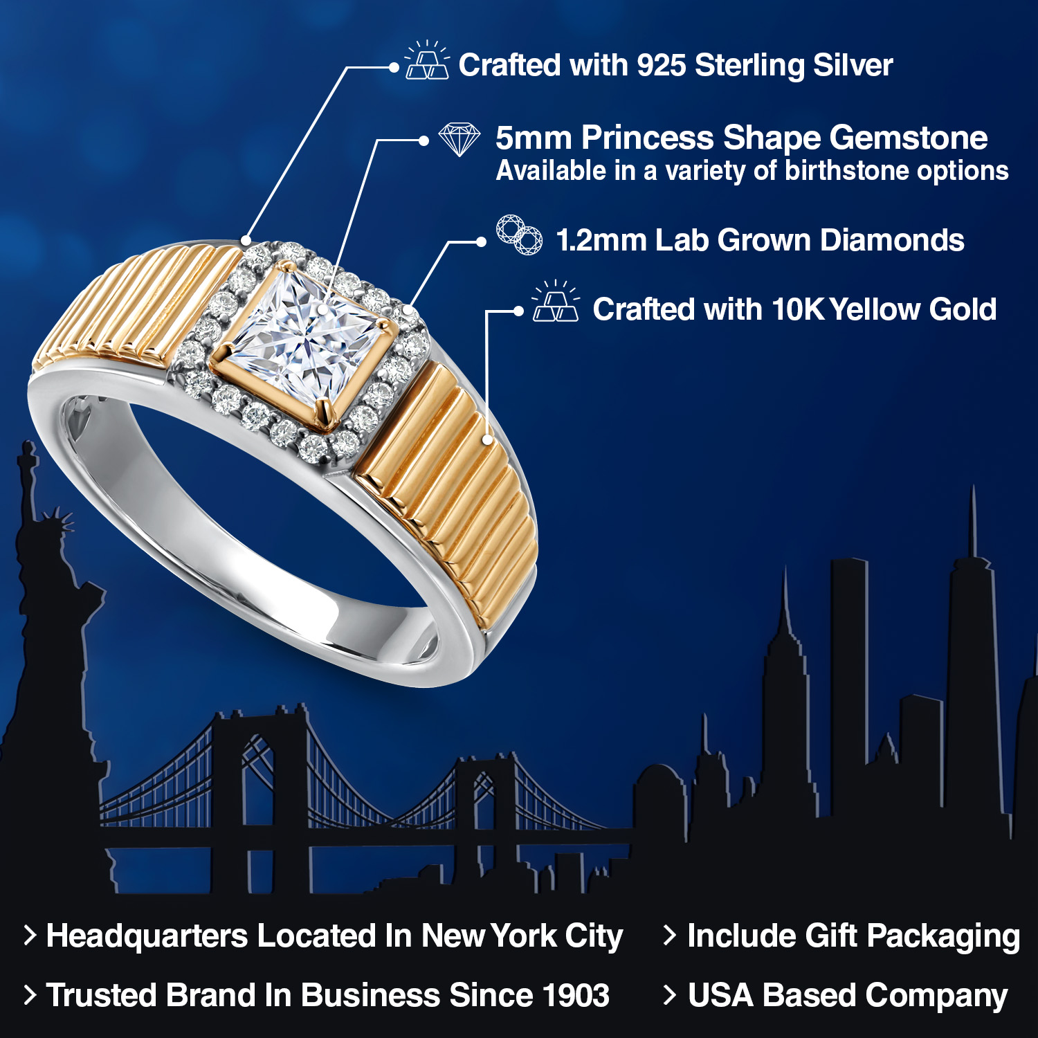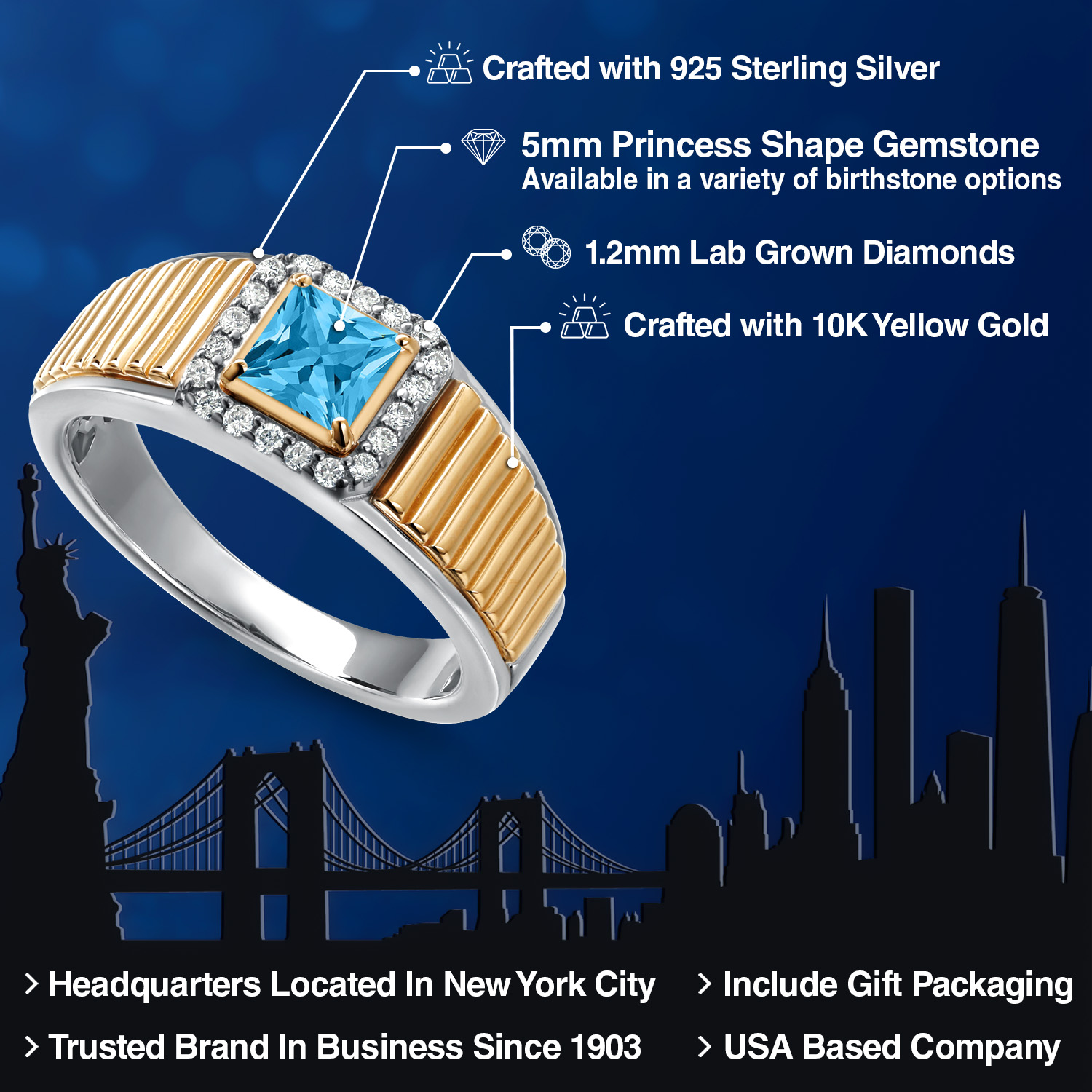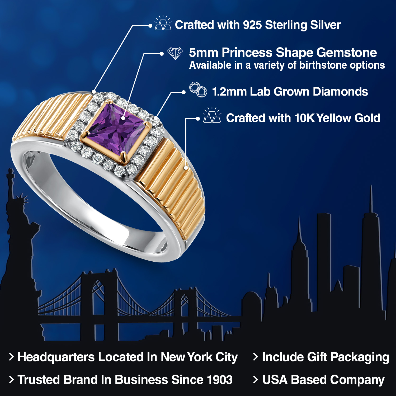 Princess Cut Ring For Men | 925 Silver and 10K Yellow Gold | 5MM Princess Cut Gemstone Birthstone and 1.2MM Round White Lab Grown Diamond | Available in Size 7-13