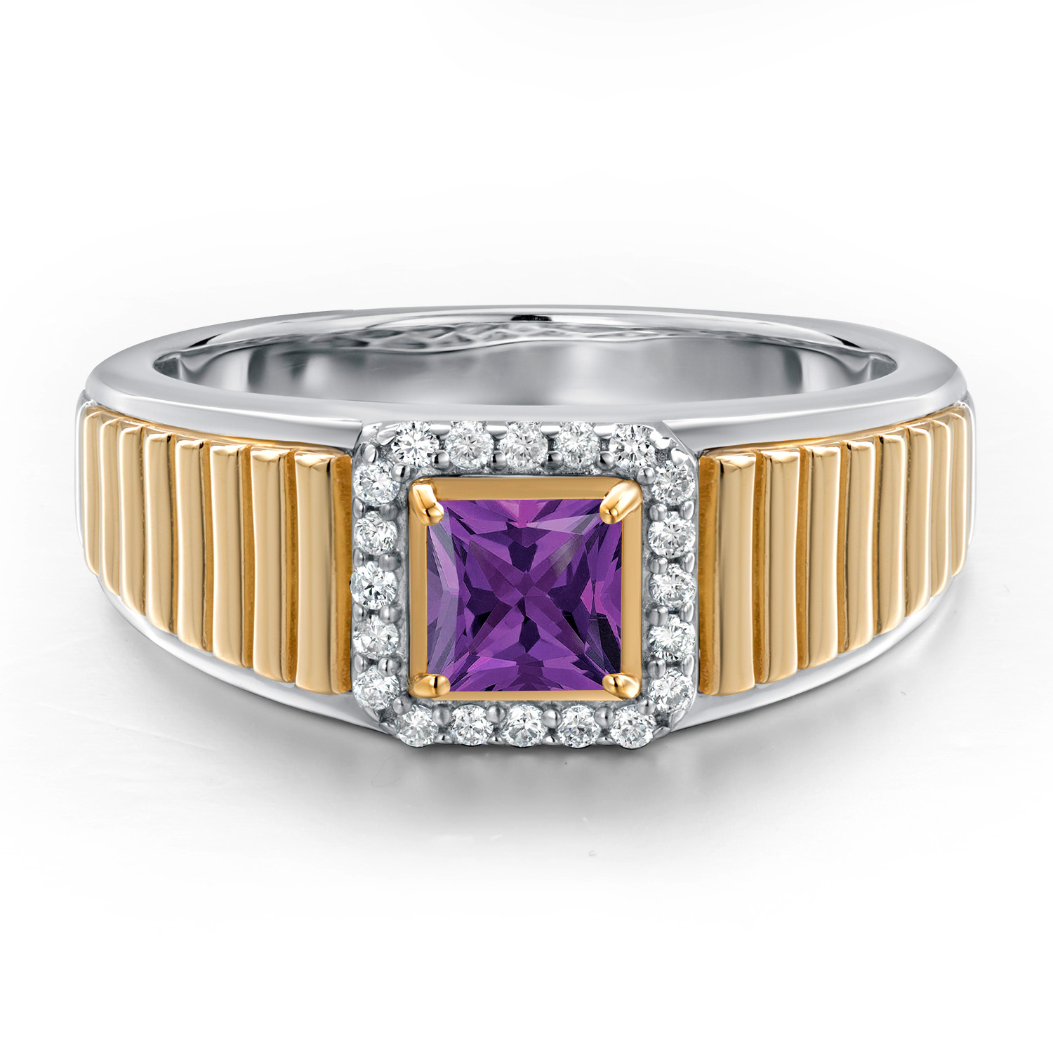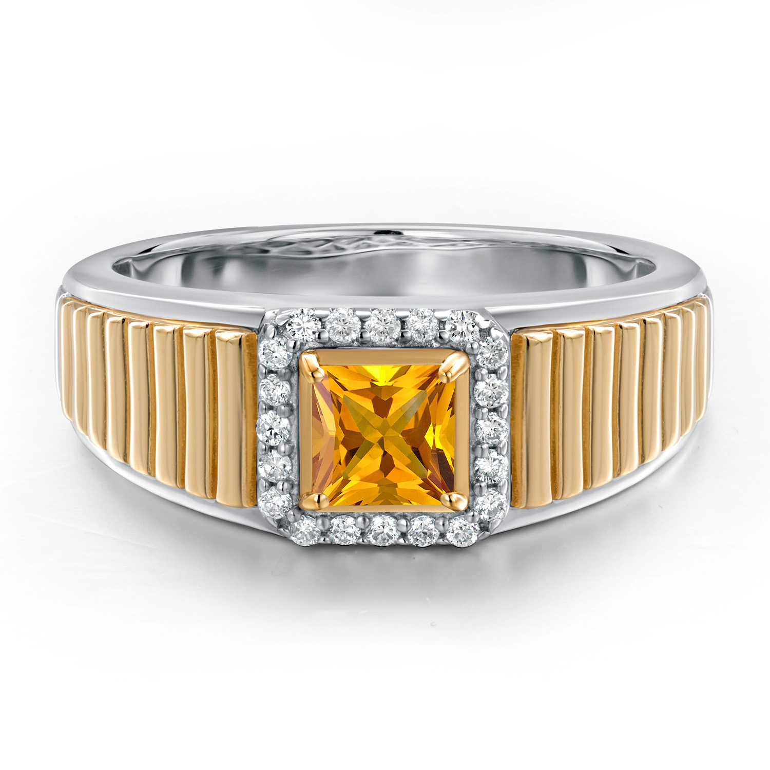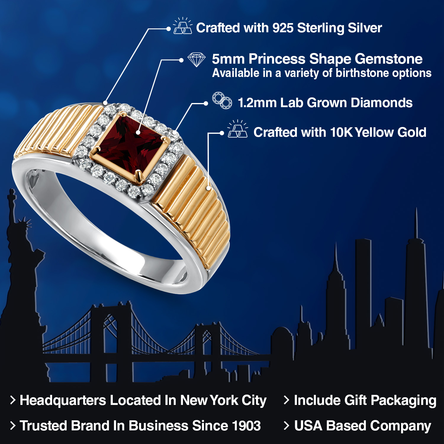 Princess Cut Ring For Men | 925 Silver and 10K Yellow Gold | 5MM Princess Cut Gemstone Birthstone and 1.2MM Round White Lab Grown Diamond | Available in Size 7-13