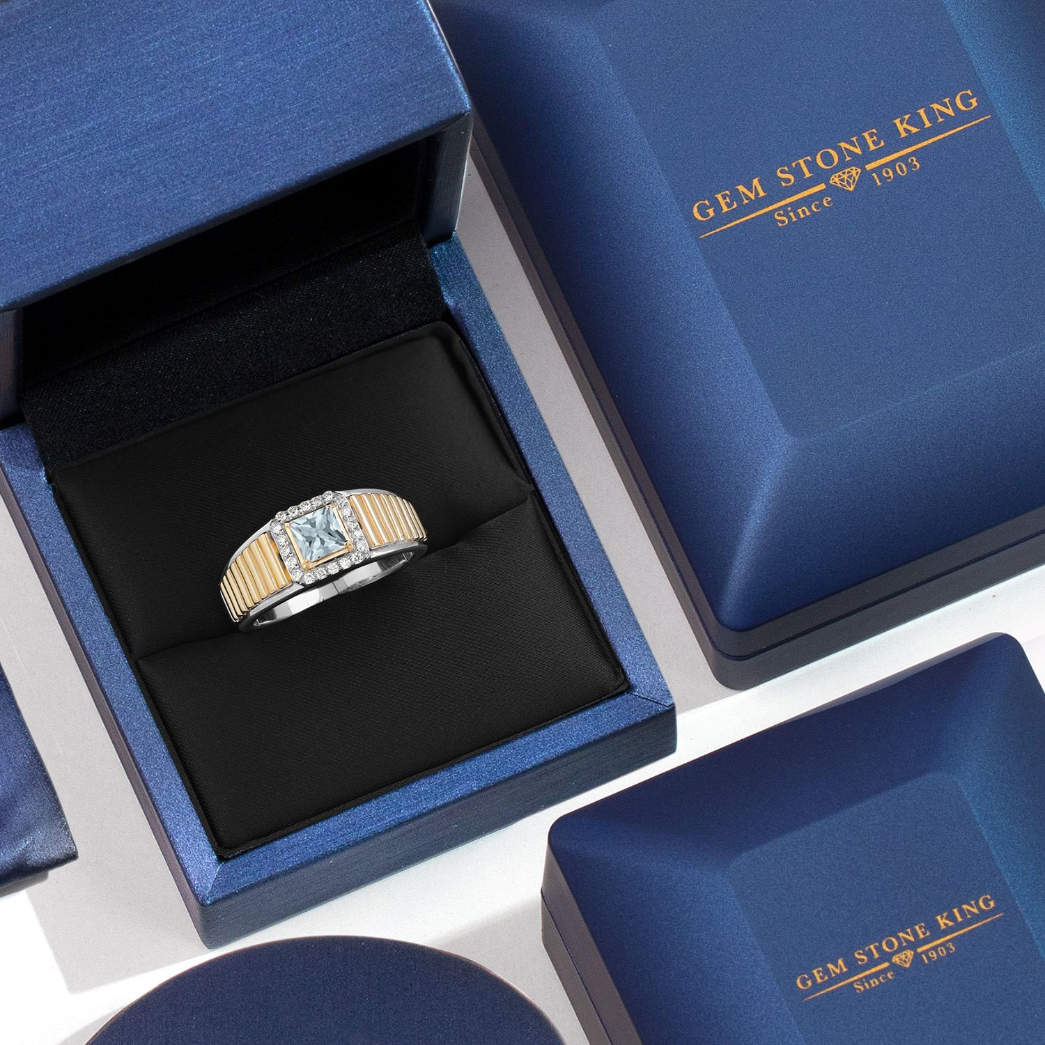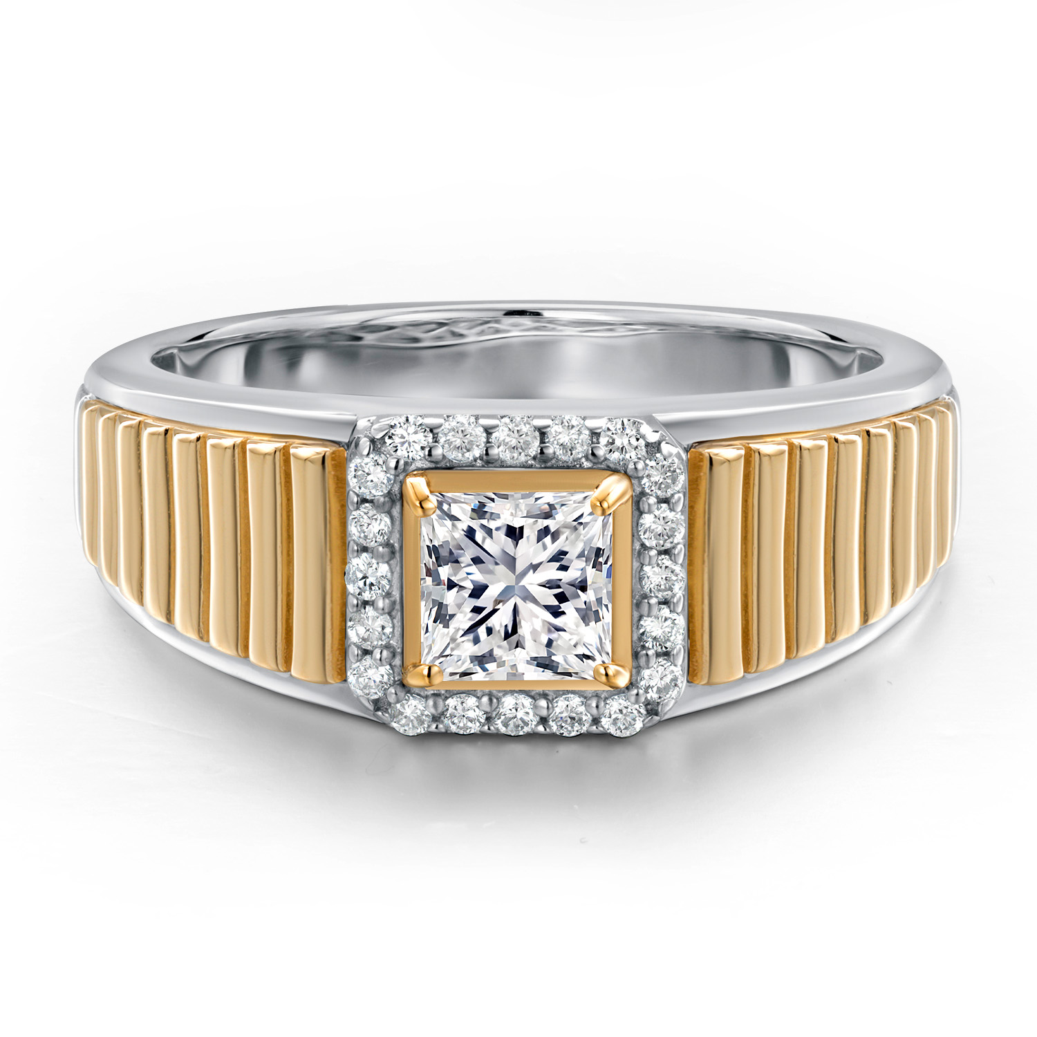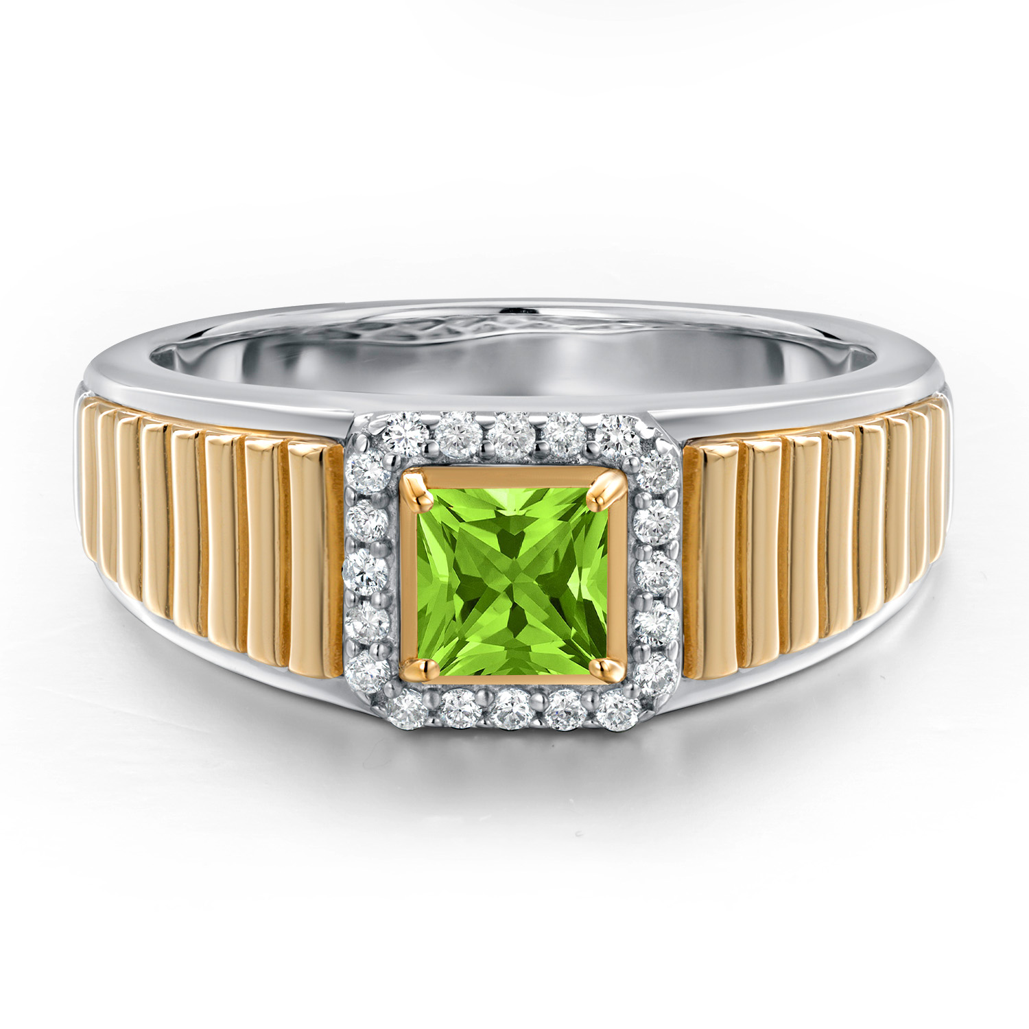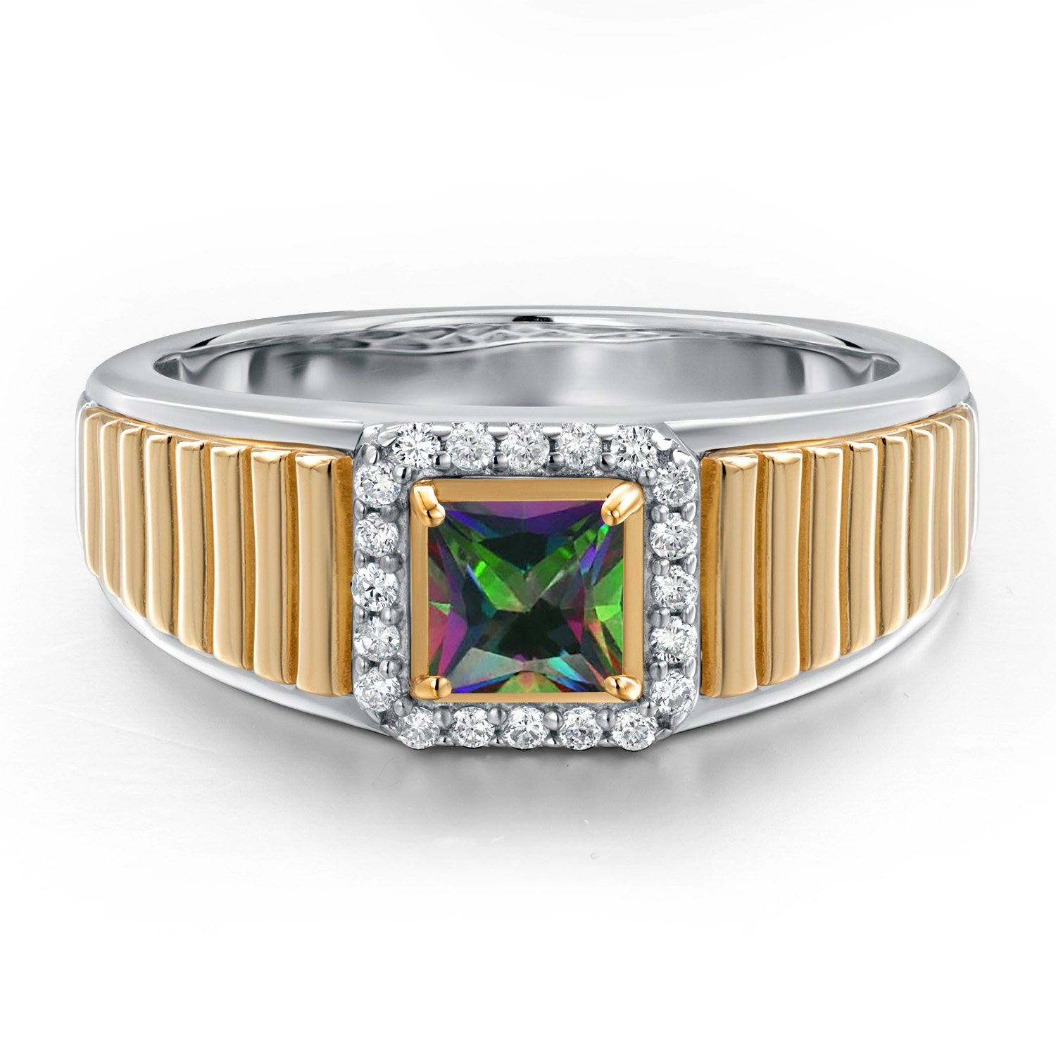 Princess Cut Ring For Men | 925 Silver and 10K Yellow Gold | 5MM Princess Cut Gemstone Birthstone and 1.2MM Round White Lab Grown Diamond | Available in Size 7-13