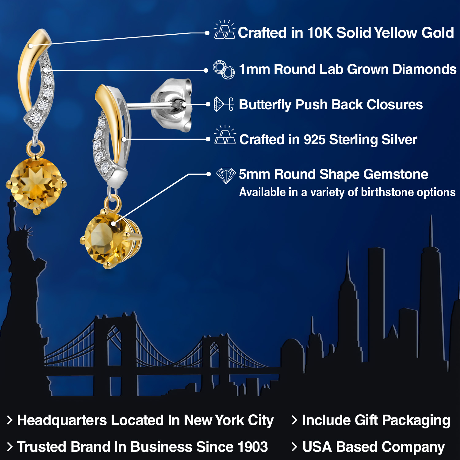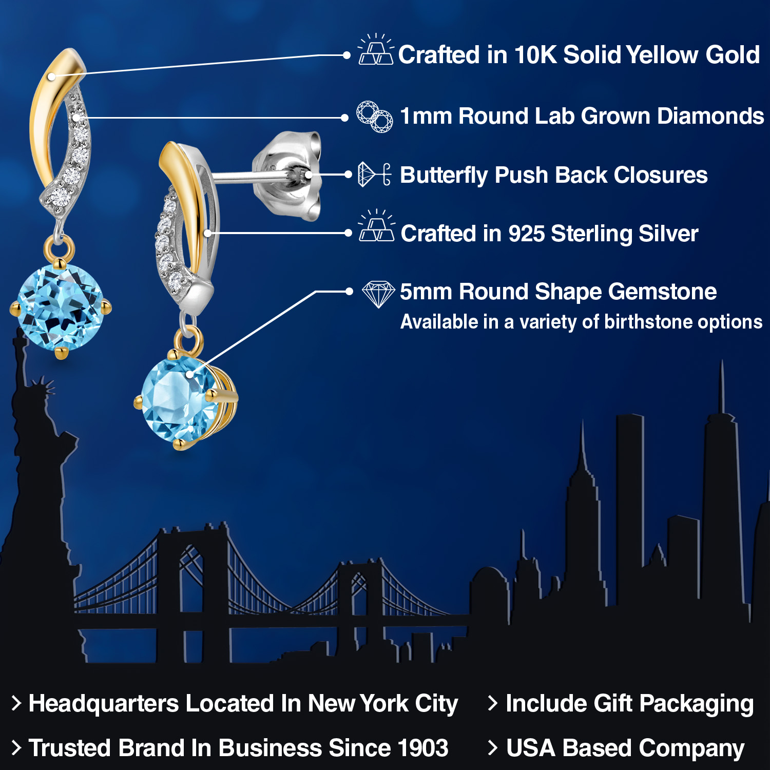ELEGANT DUAL-TONE DESIGN: These earrings feature a sleek, twisted design at the top, blending the rich warmth of 10K yellow gold with the durability of 925 sterling silver. The gold elegantly wraps around the diamonds, adding a touch of movement and sophistication to the piece. This design not only enhances durability but also gives the earrings a luxurious and timeless appeal, perfect for everyday wear or special occasions.