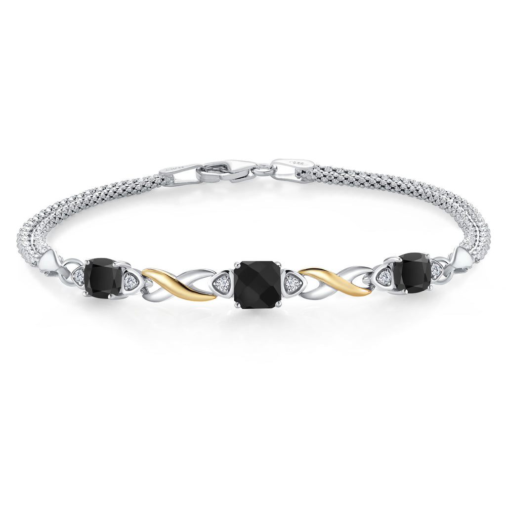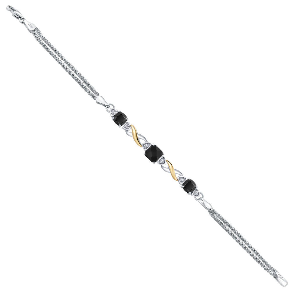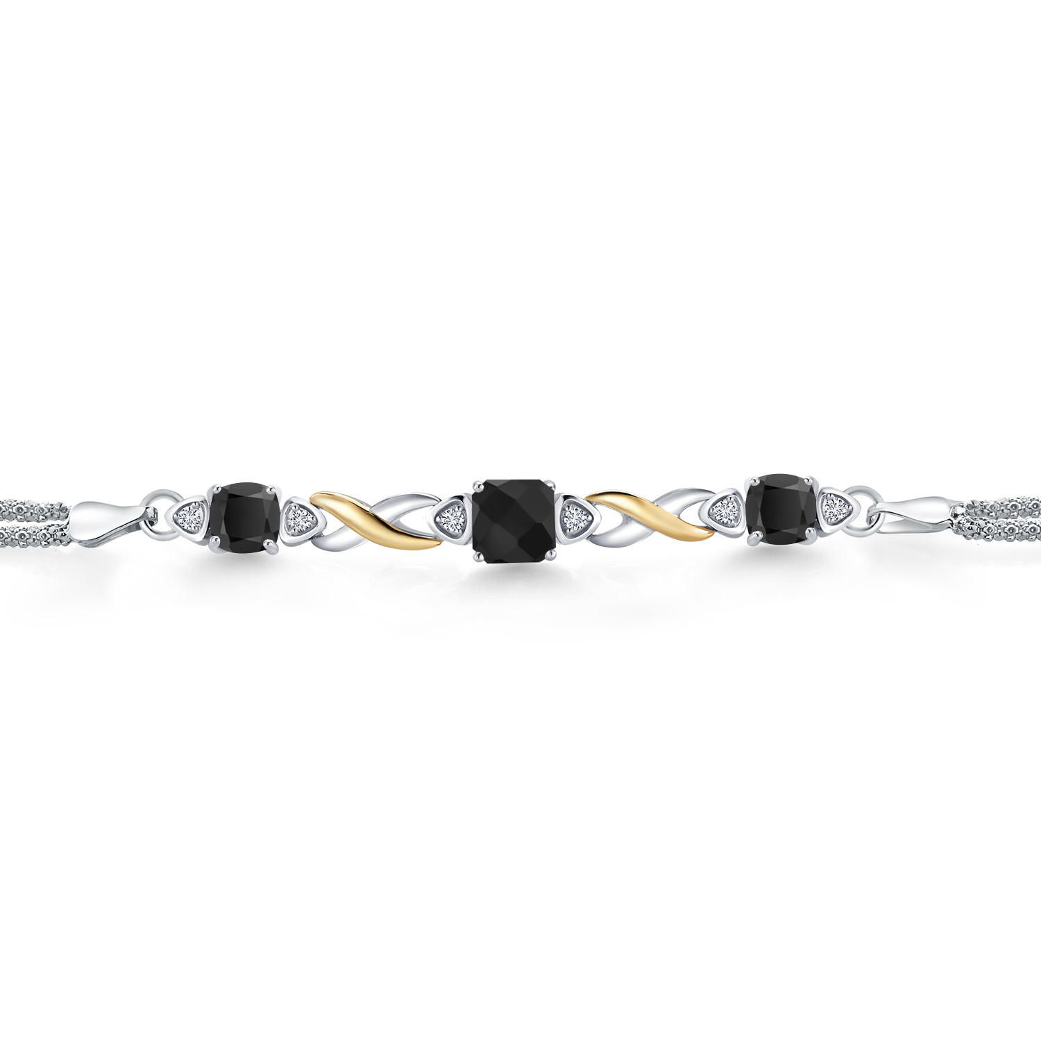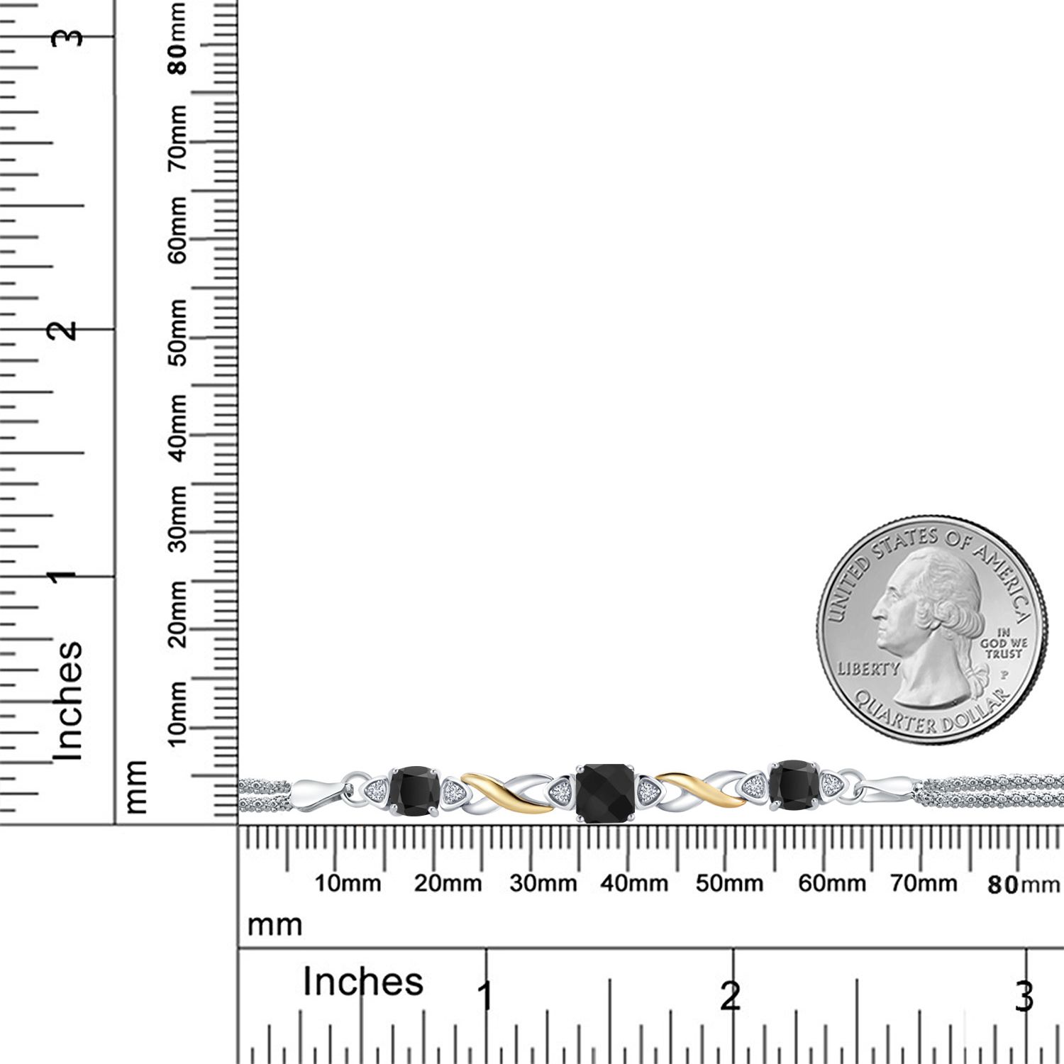 925 Silver and 10K Yellow Gold Black Onyx and White Lab Grown Diamond Bracelet For Women (2.07 Cttw, Gemstone December Birthstone, Cushion Checkerboard 6MM and 5MM, 6.5/7/7.5 Inch, Made in Italy)