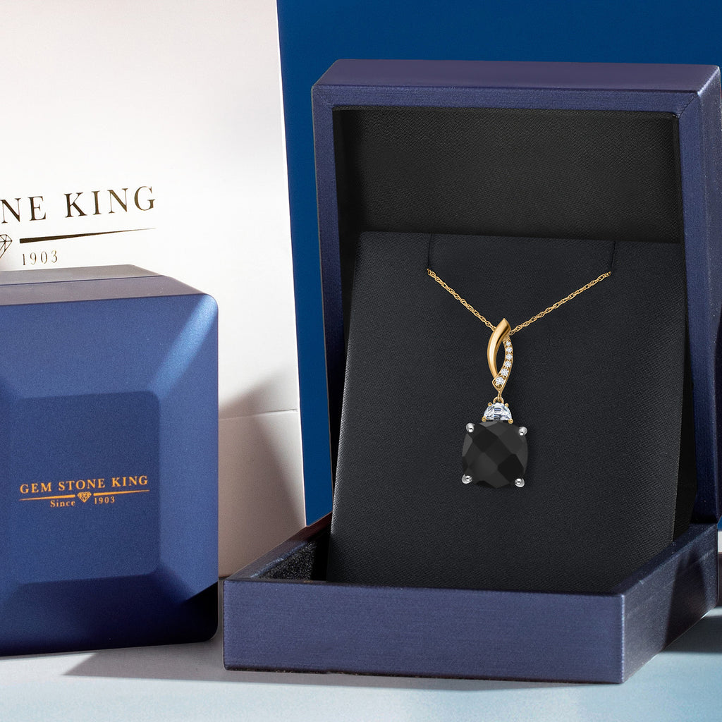 925 Silver and 10K Yellow Gold Black Onyx and White Moissanite and Lab Grown Diamond Pendant Necklace for Women | 5.79 Cttw | Gemstone December Birthstone | Cushion Checkerboard 12MM | With 18 Inch Chain
