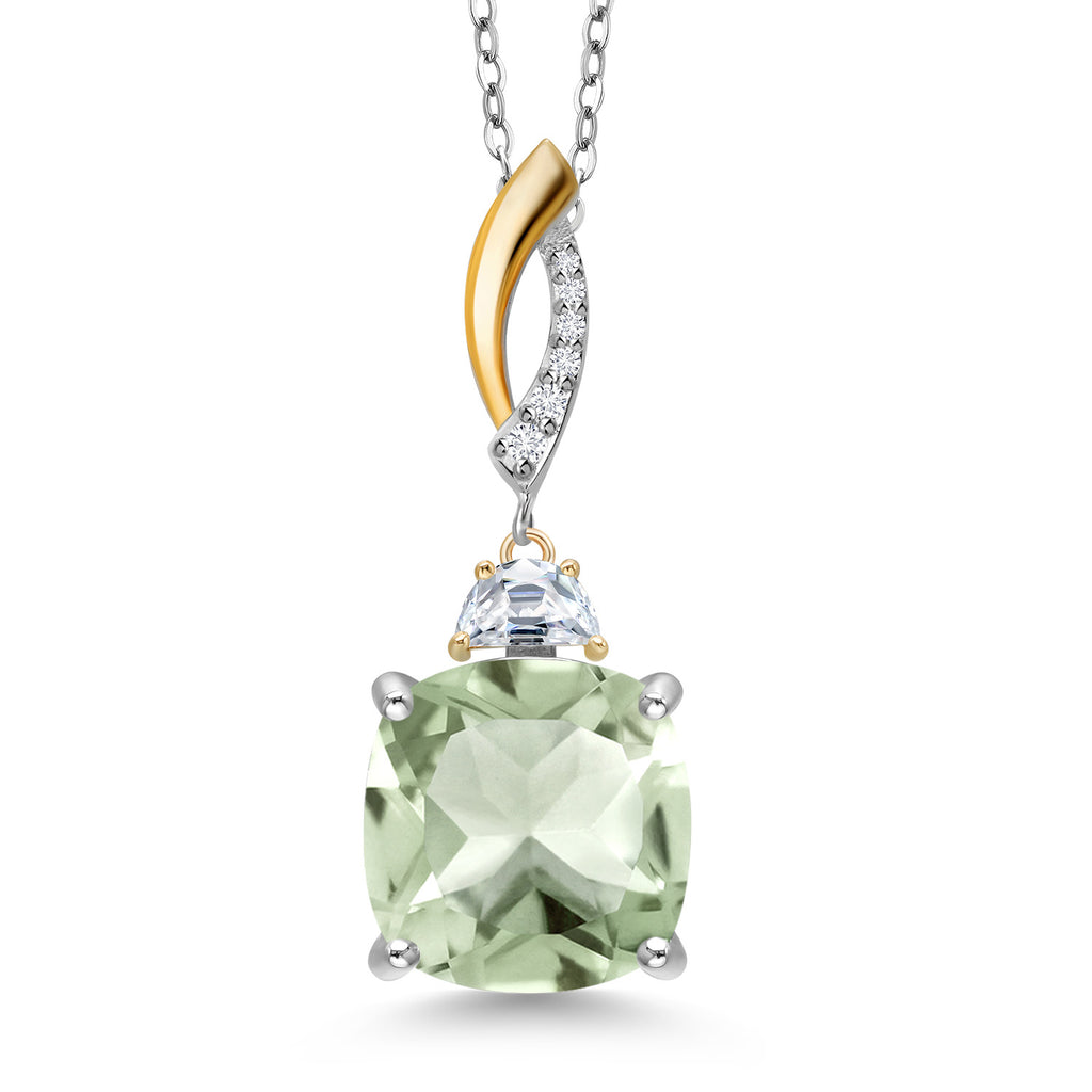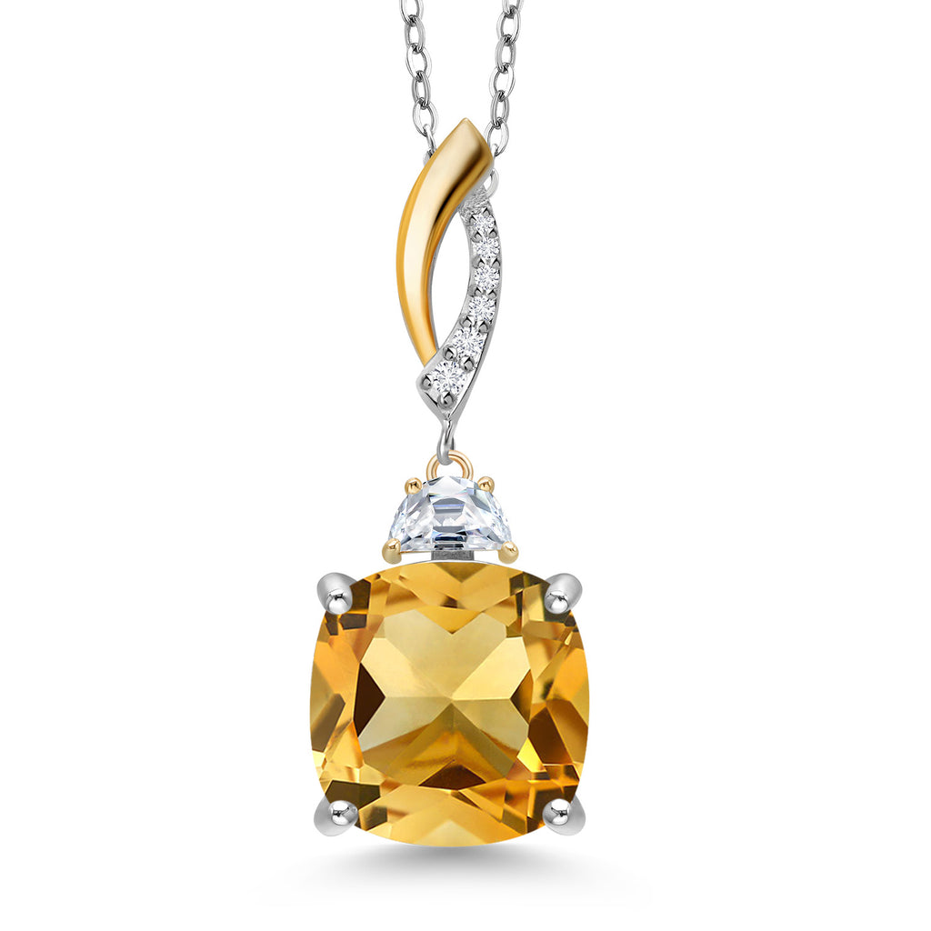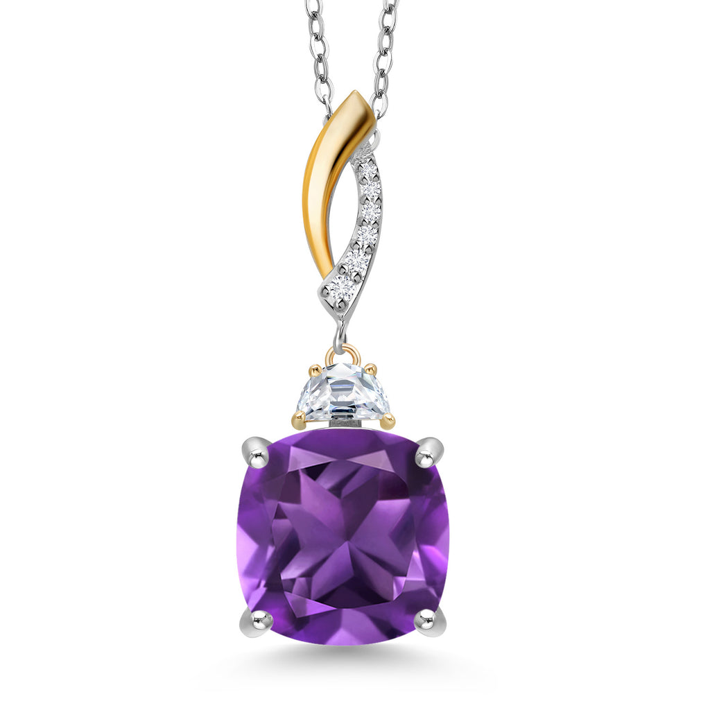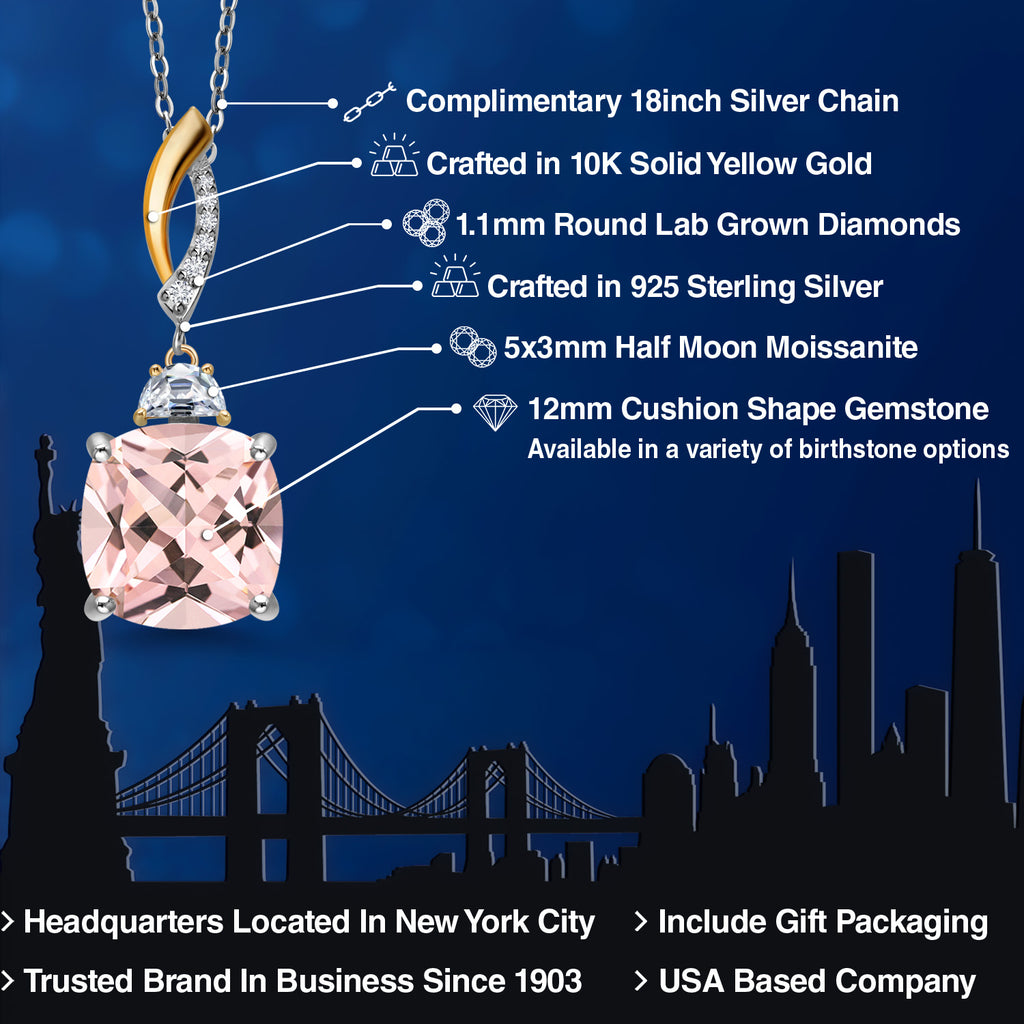 Gemstone Birthstone and Moissanite Pendant Necklace for Women | 925 Silver and 10K Yellow Gold | Cushion 12MM | Half Moon 5X3MM | With 18 Inch Silver Chain