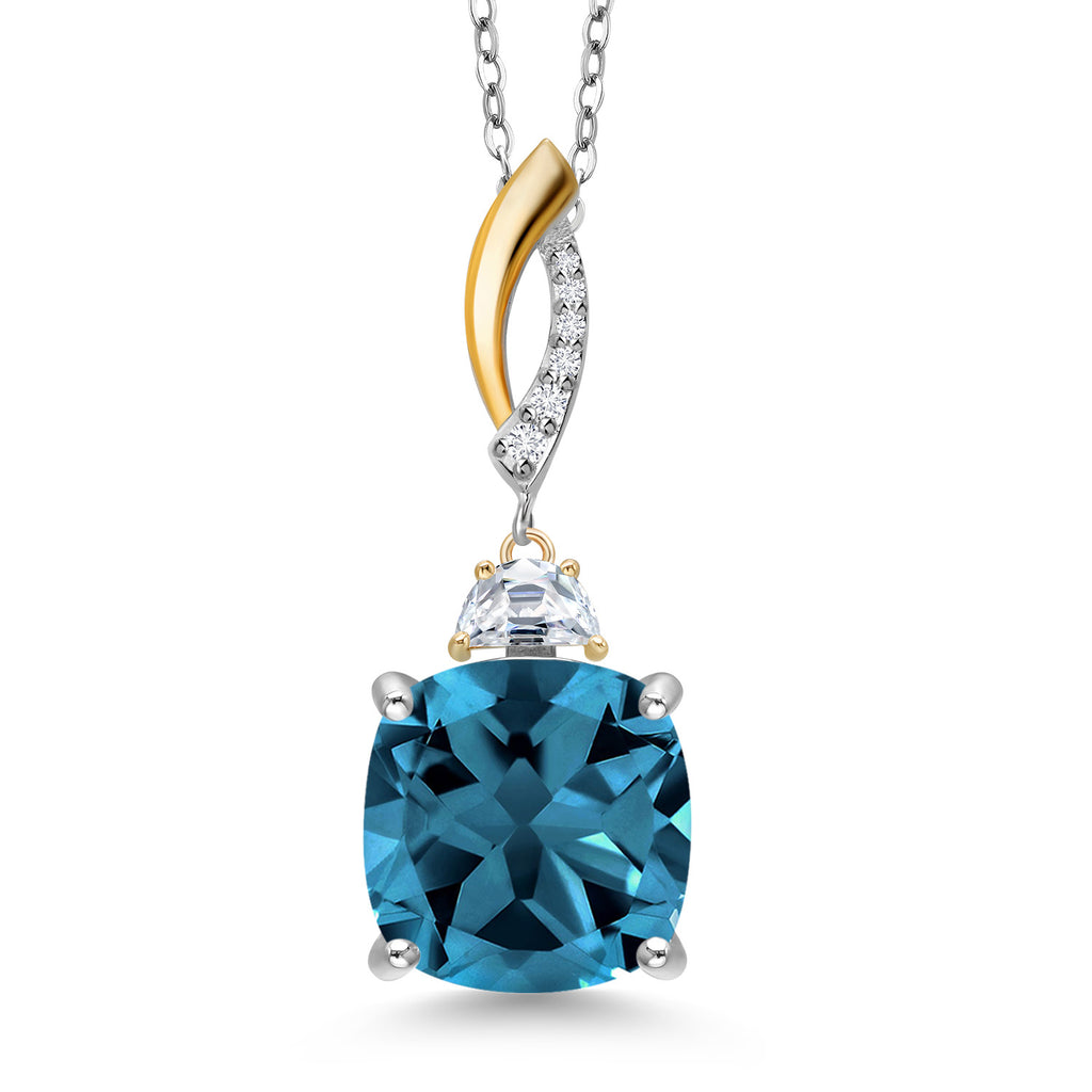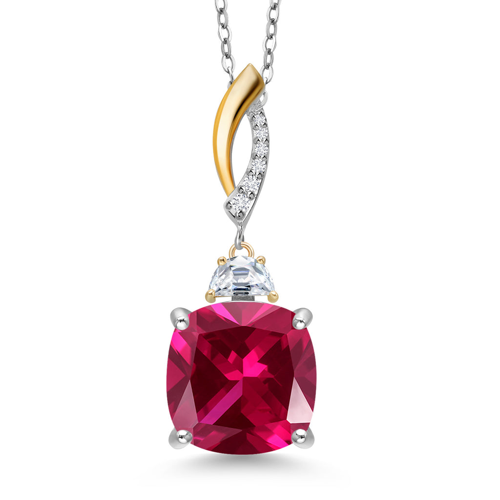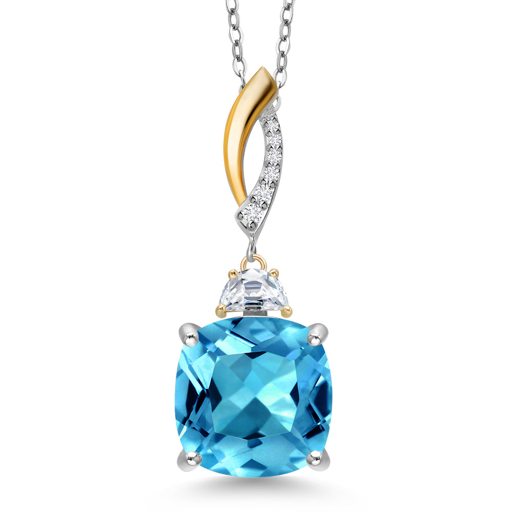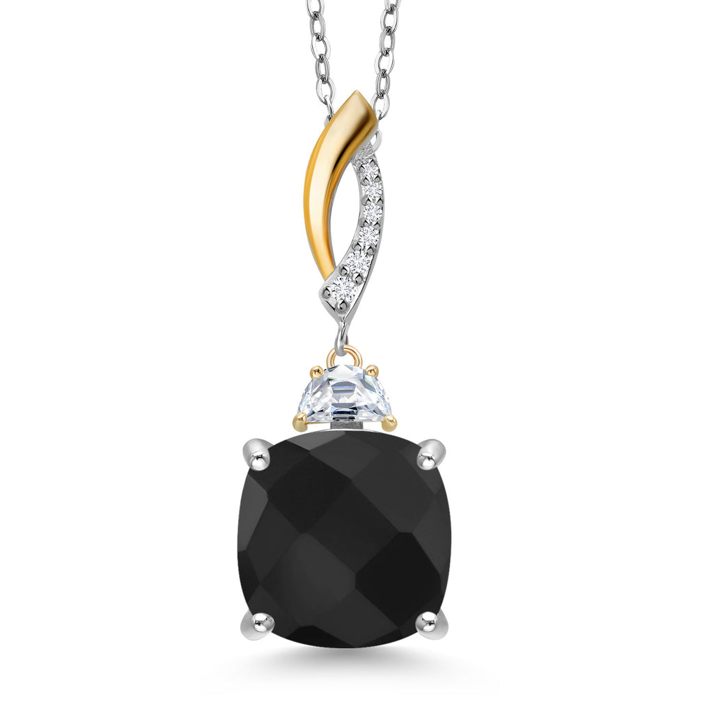 Gemstone Birthstone and Moissanite Pendant Necklace for Women | 925 Silver and 10K Yellow Gold | Cushion 12MM | Half Moon 5X3MM | With 18 Inch Silver Chain