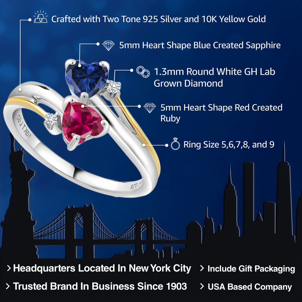 925 Silver and 10K Yellow Gold Blue Created Sapphire Red Created Ruby and Lab Grown Diamond 2 Heart Promise Couple Engagement Mother Ring For Women (1.12 Cttw)