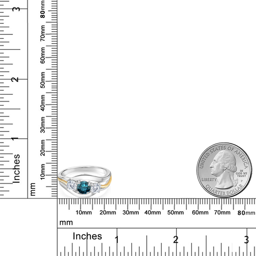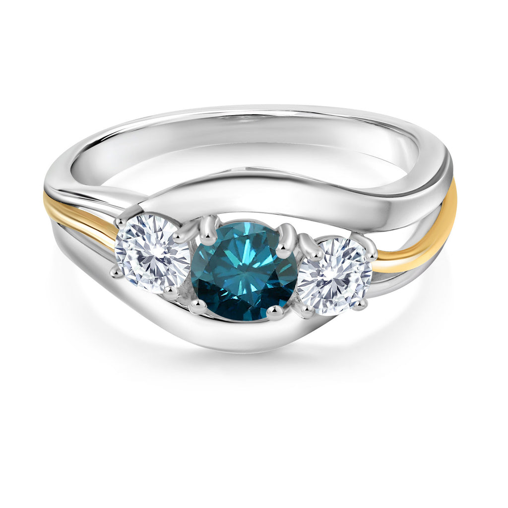925 Silver and 10K Yellow Gold Blue Diamond and White Moissanite 3-Stone Ring For Women | 1.01 Cttw | Round 5MM and 4MM | Two-Tone Split-Shank Wedding Anniversary Promise Ring