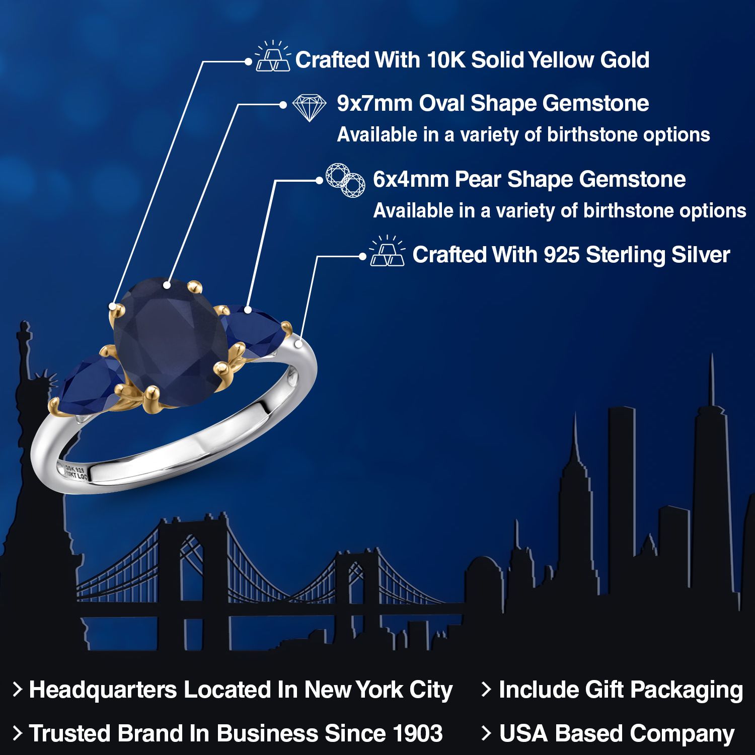 PREMIUM 925 STERLING SILVER WITH 10K YELLOW GOLD ACCENTS: Meticulously crafted in solid 925 sterling silver and adorned with genuine 10K yellow gold, this two-tone design offers both beauty and durability. The warm gold accentuates the sapphire’s cool depth, while the hypoallergenic and nickel-free materials ensure long-lasting, skin-friendly comfort.