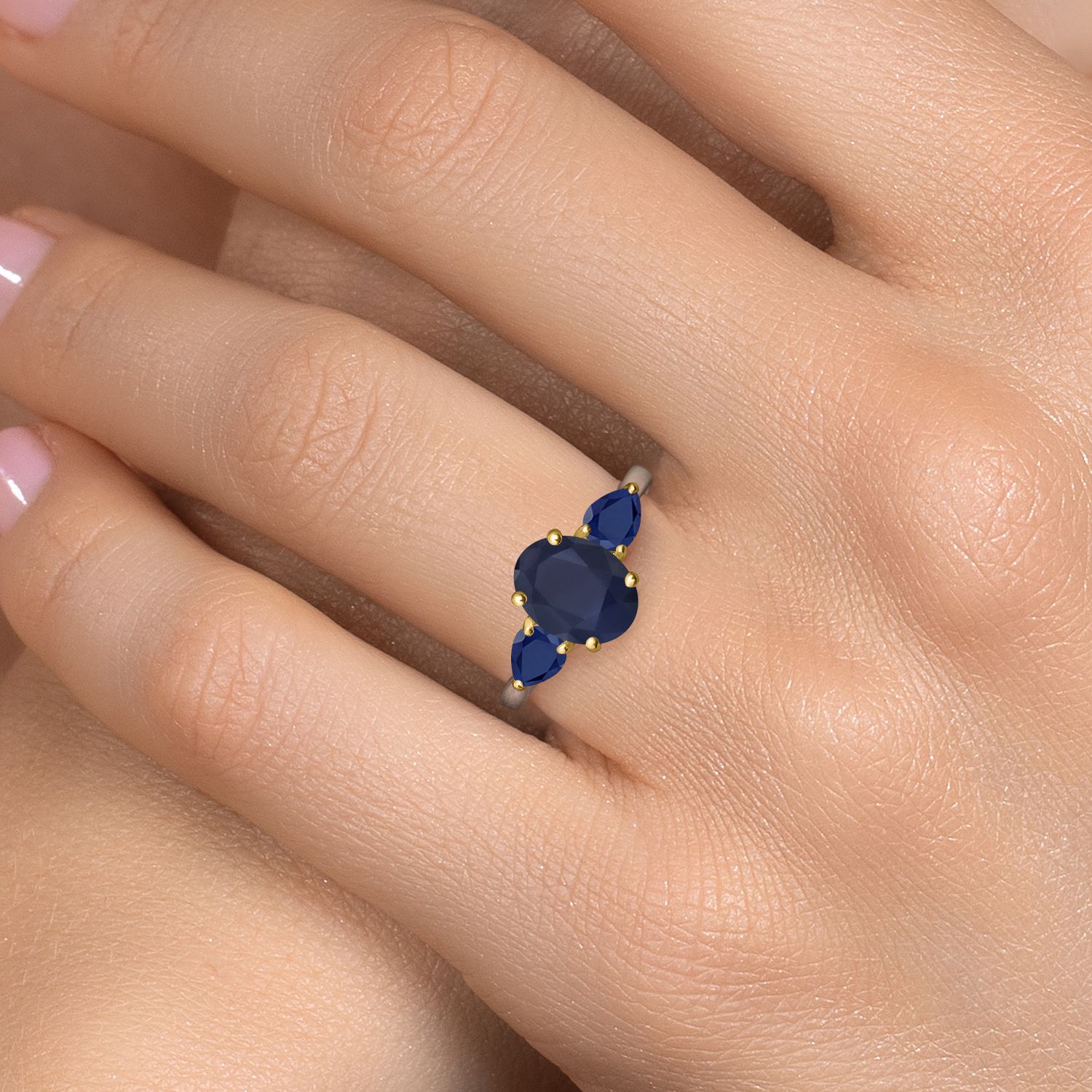 TIMELESS 3-STONE SETTING WITH SECURE CRAFTSMANSHIP: The sapphire and side stones are expertly prong-set to allow optimal light reflection and brilliance. The three-stone layout represents past, present, and future—an ideal choice for expressing lasting commitment in a design that blends modern elegance with classic sentiment.
