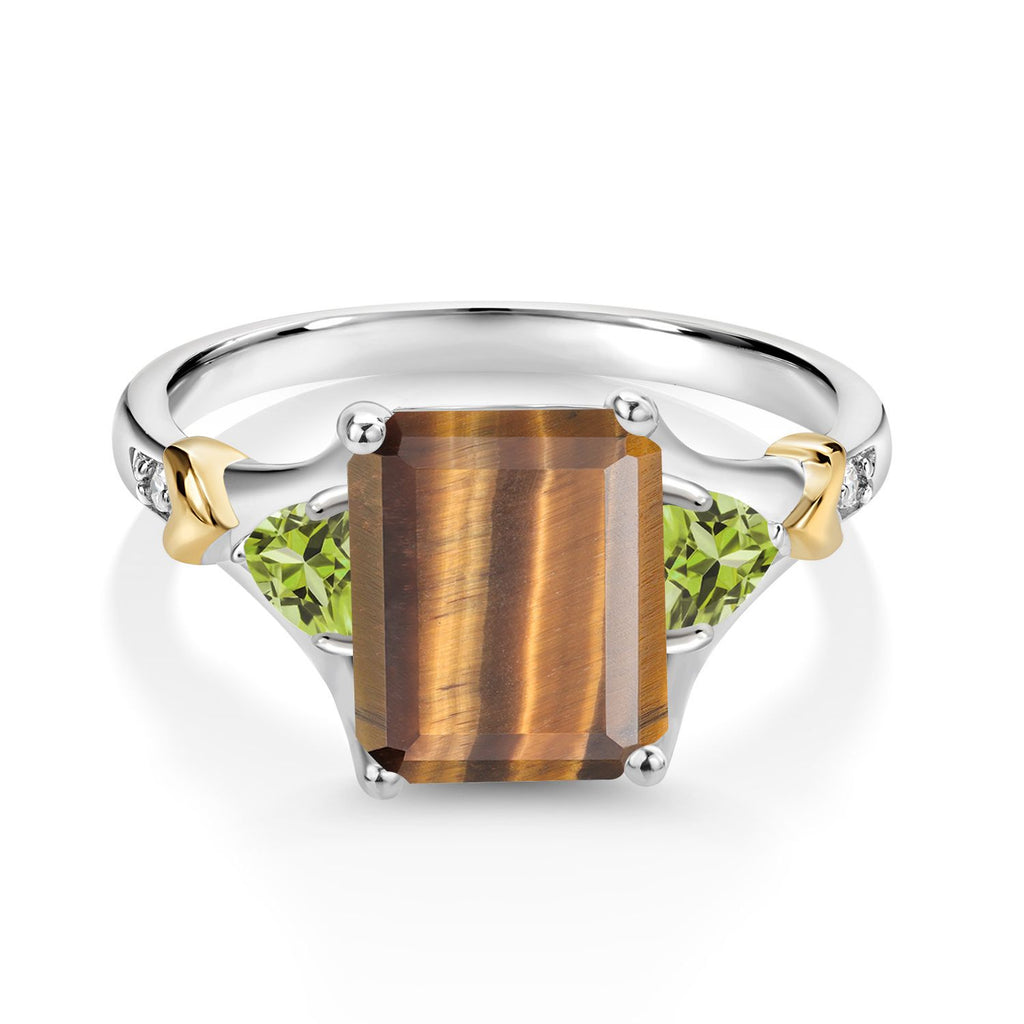 MEASUREMENTS: 10x8mm Emerald Cut Brown Tiger Eye, 3.5x3.5mm Trillion Green Peridot1.15, x, 1.15, mm Round White Diamond. Total Carat Weight is 3.38 cttw