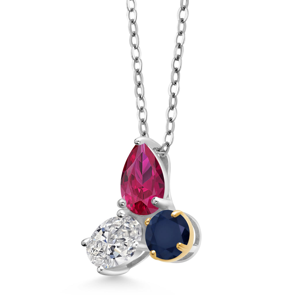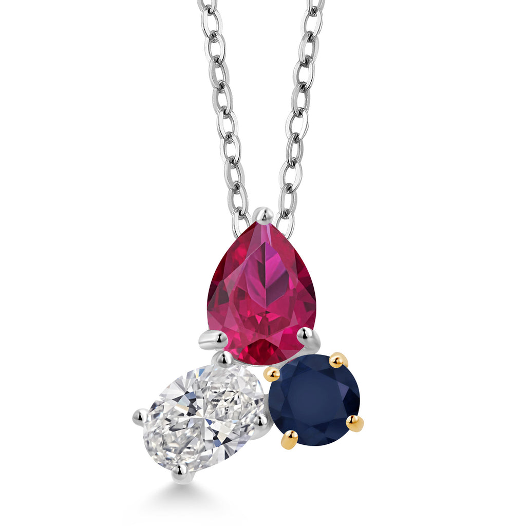 925 Silver and 10K Yellow Gold Created Ruby and Lab Grown Diamond and Blue Sapphire 3 Stone Pendant Necklace for Women | 2.55 Cttw | Pear Shape 8X6MM | Oval 7X5MM | Round 5MM | with 18 Inch Chain