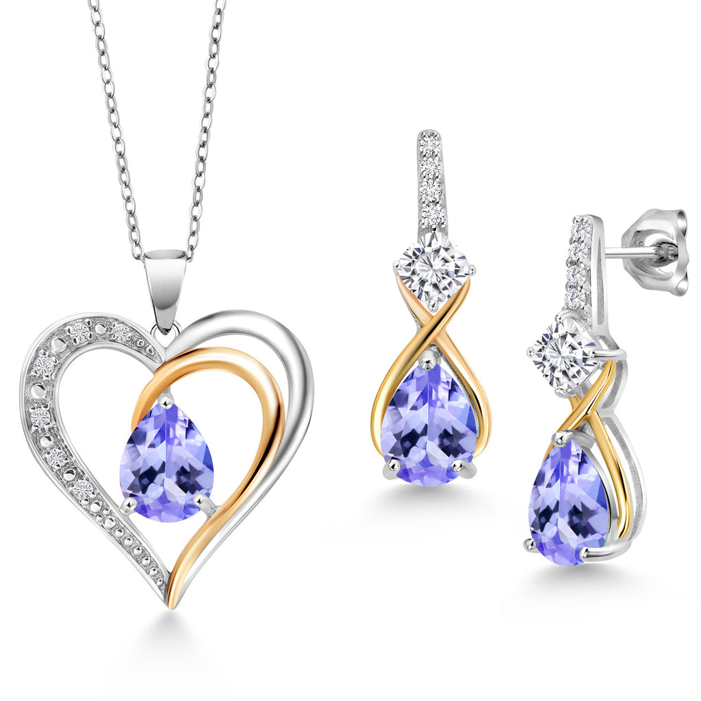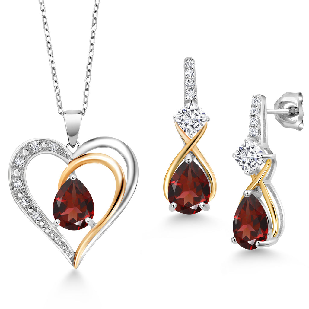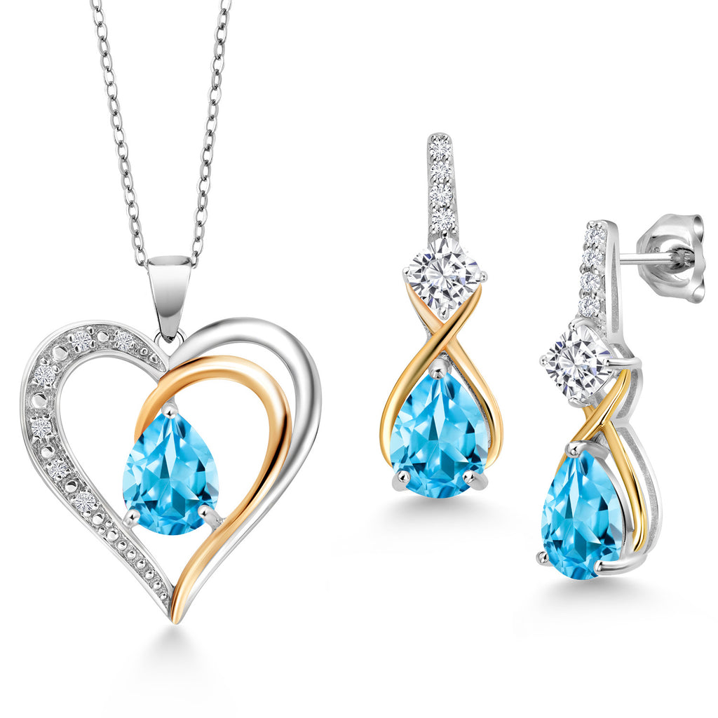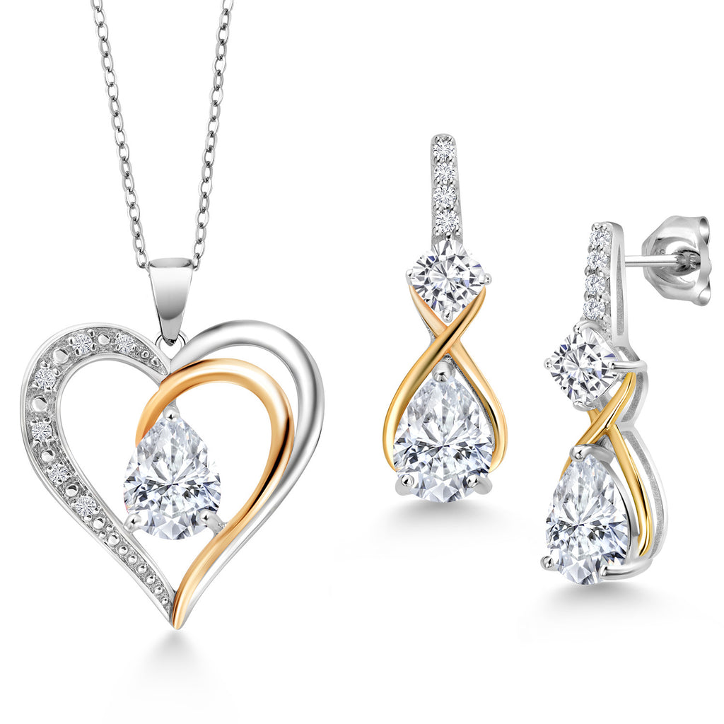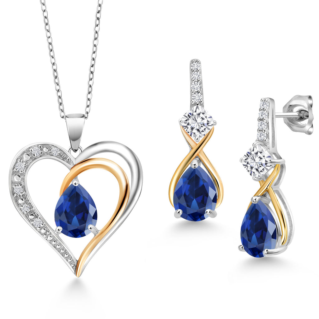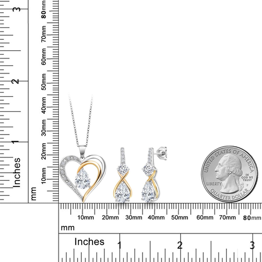 925 Silver and 10K Yellow Gold Gemstone Birthstone, Moissanite and Lab Grown Diamond Heart Pendant Necklace Earrings Set | Pear 8X6MM, Cushion 4MM | Two-Tone Jewelry for Her Mom Wife | 18 Inch Chain