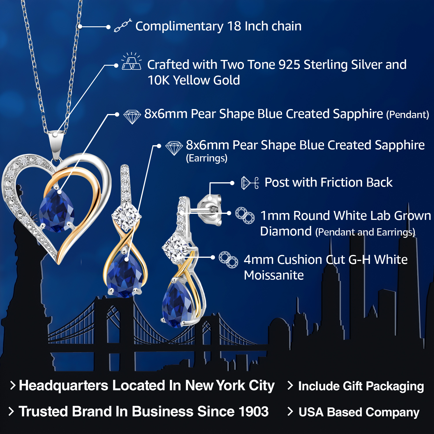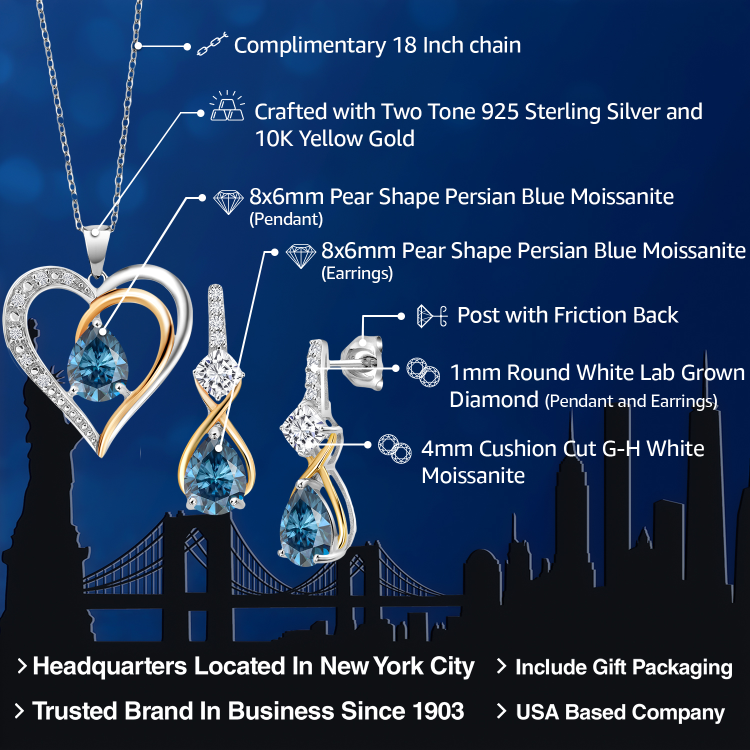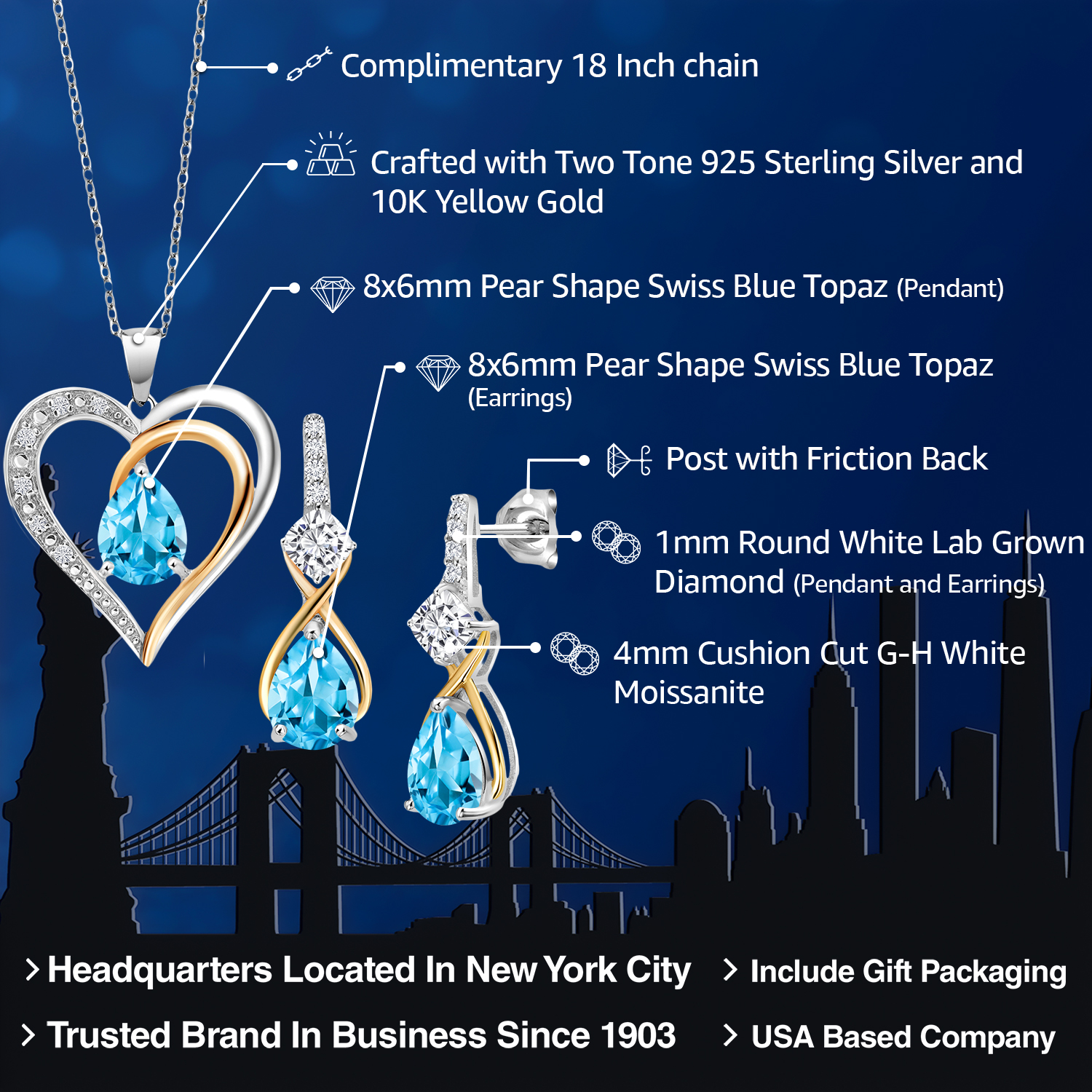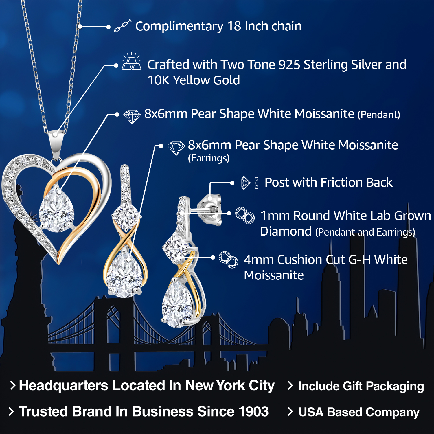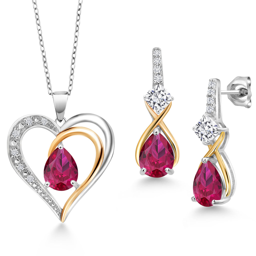 925 Silver and 10K Yellow Gold Gemstone Birthstone, Moissanite and Lab Grown Diamond Heart Pendant Necklace Earrings Set | Pear 8X6MM, Cushion 4MM | Two-Tone Jewelry for Her Mom Wife | 18 Inch Chain