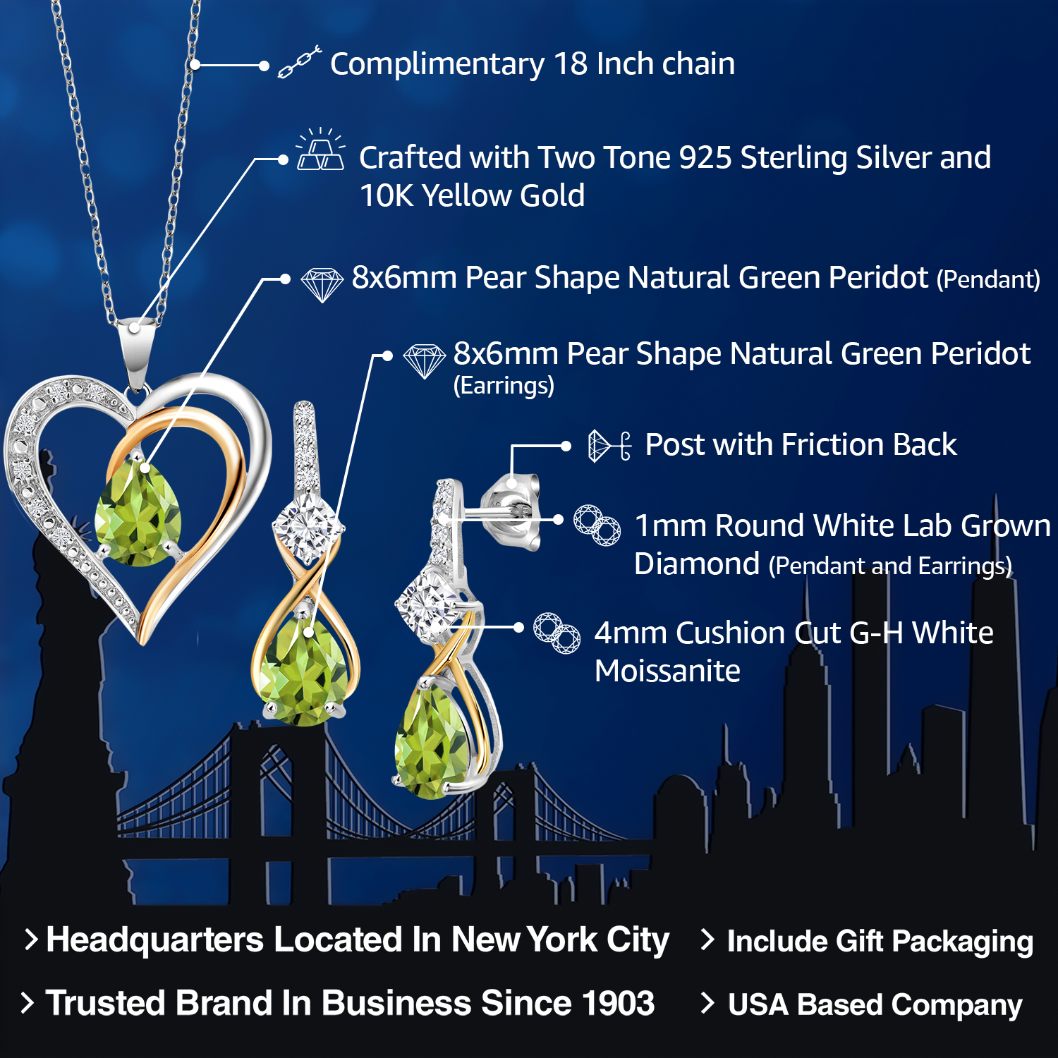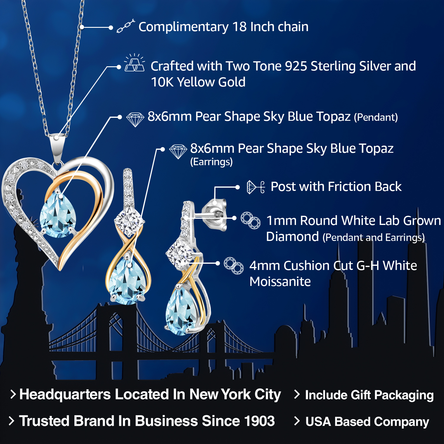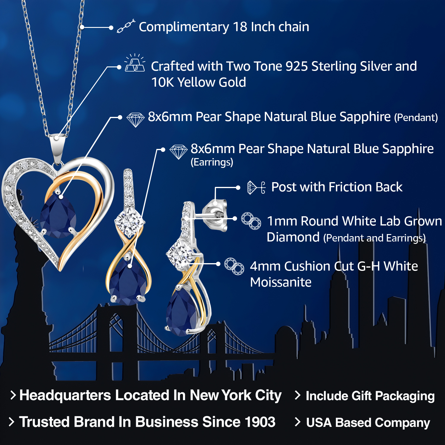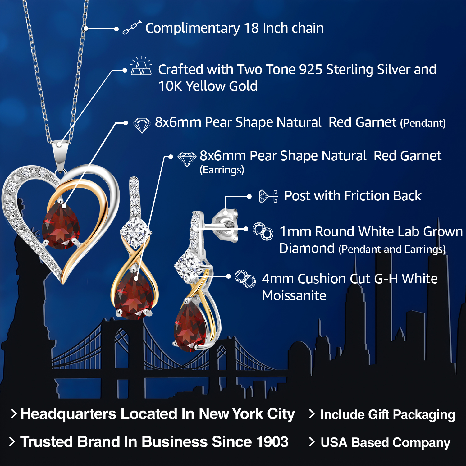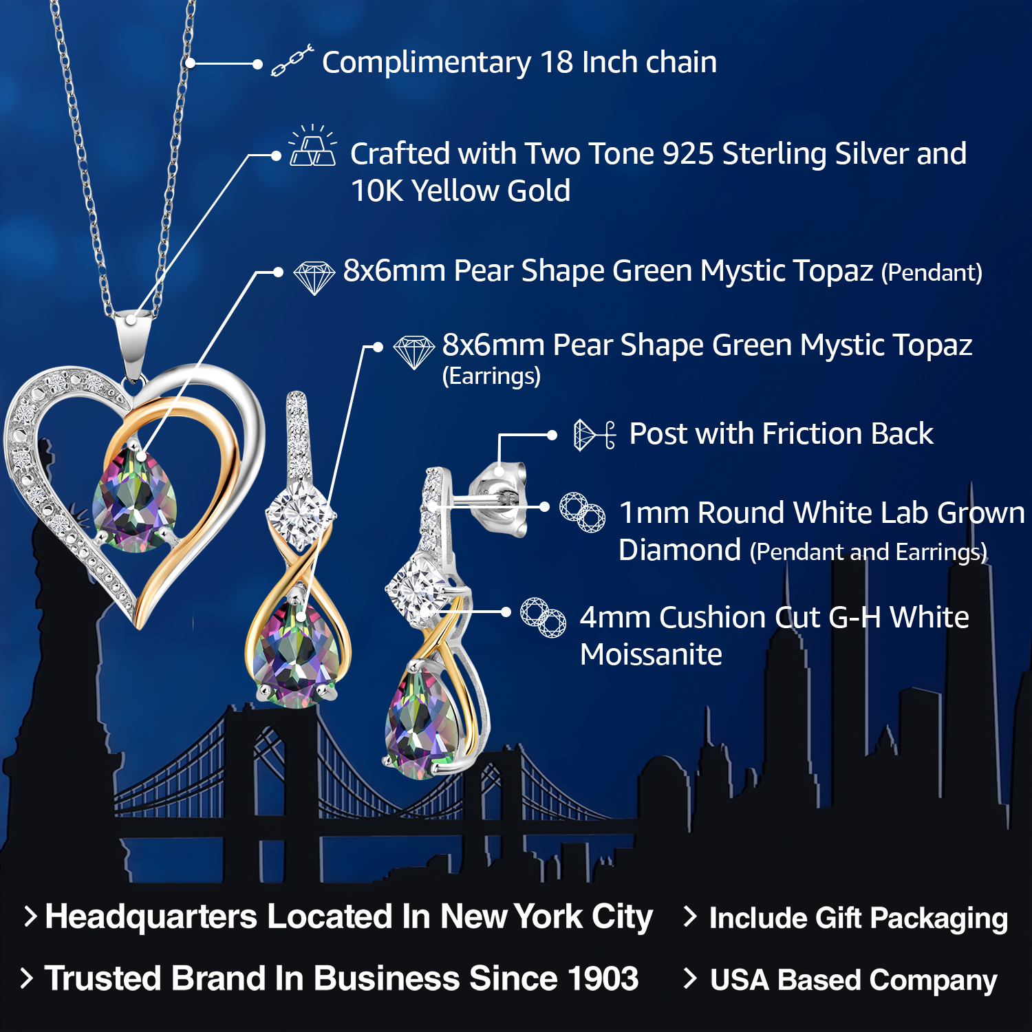 925 Silver and 10K Yellow Gold Gemstone Birthstone, Moissanite and Lab Grown Diamond Heart Pendant Necklace Earrings Set | Pear 8X6MM, Cushion 4MM | Two-Tone Jewelry for Her Mom Wife | 18 Inch Chain