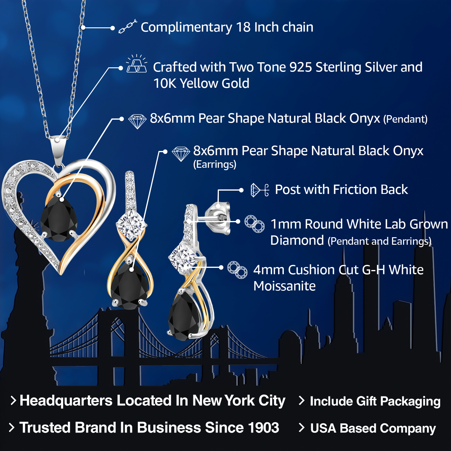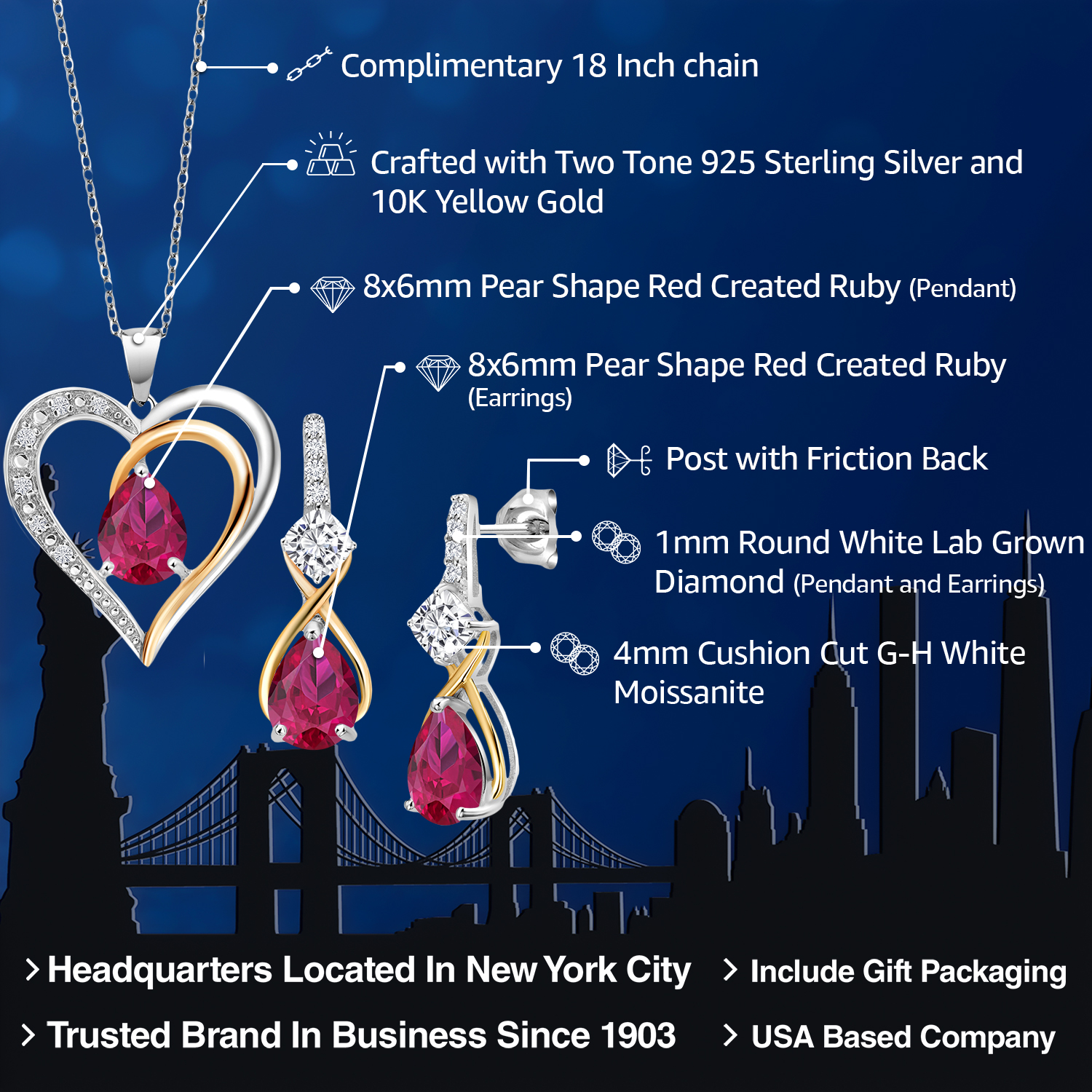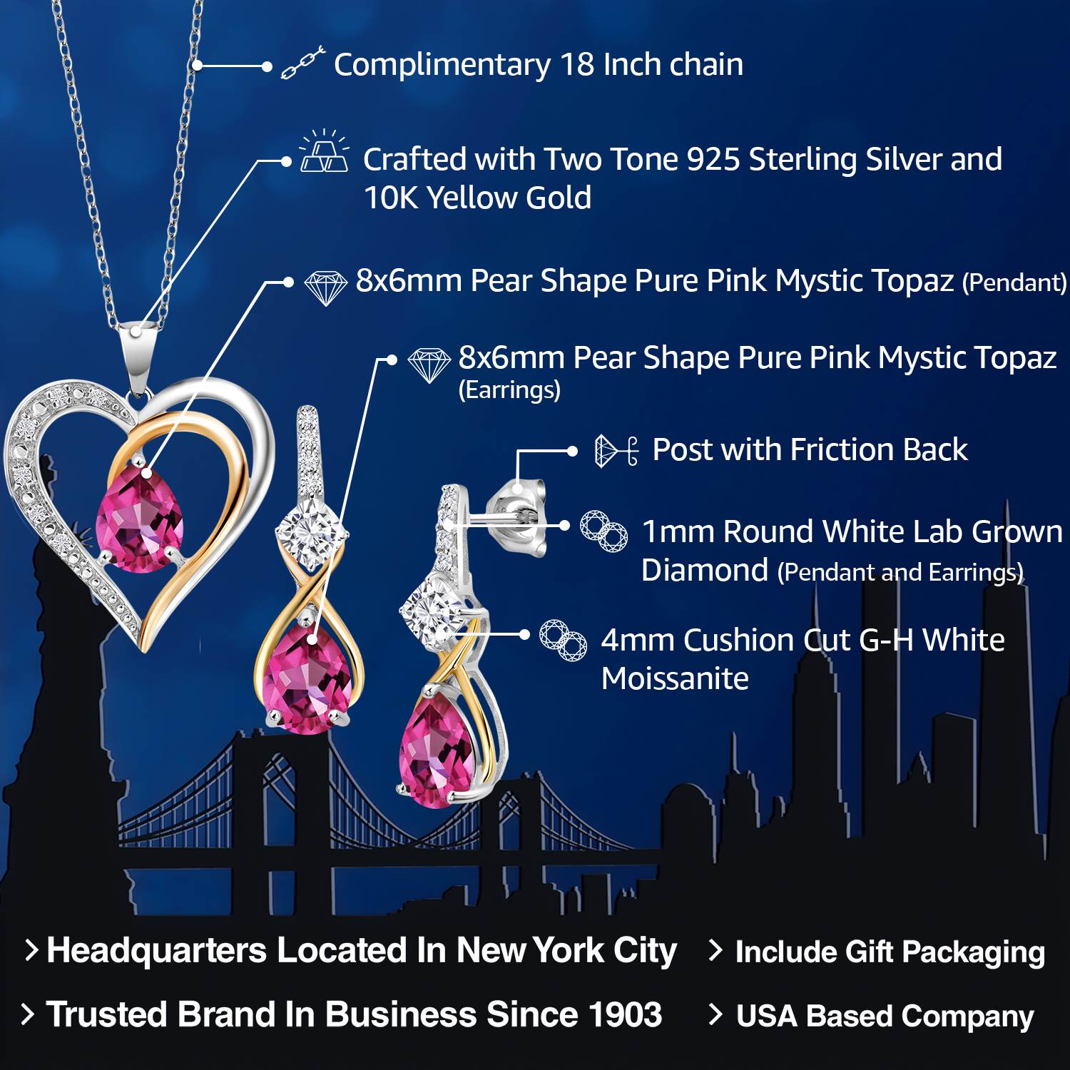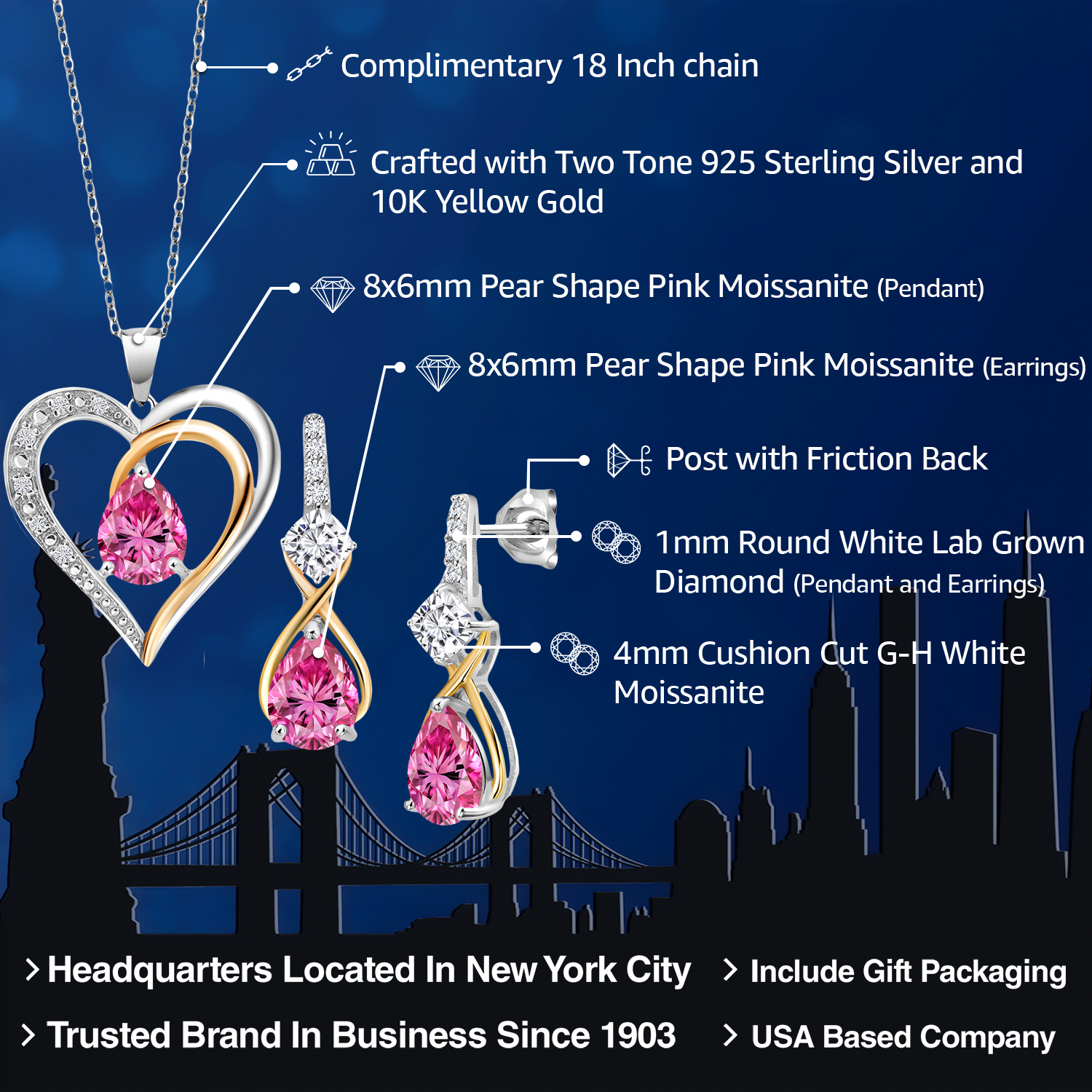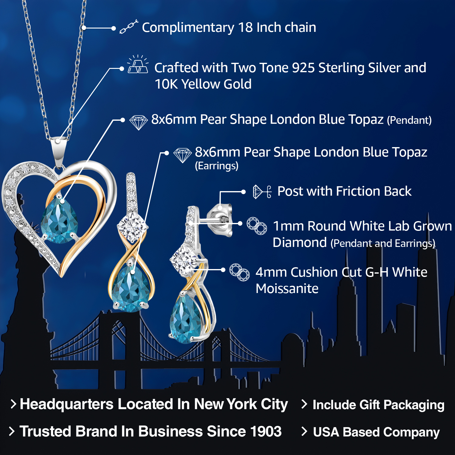 925 Silver and 10K Yellow Gold Gemstone Birthstone, Moissanite and Lab Grown Diamond Heart Pendant Necklace Earrings Set | Pear 8X6MM, Cushion 4MM | Two-Tone Jewelry for Her Mom Wife | 18 Inch Chain