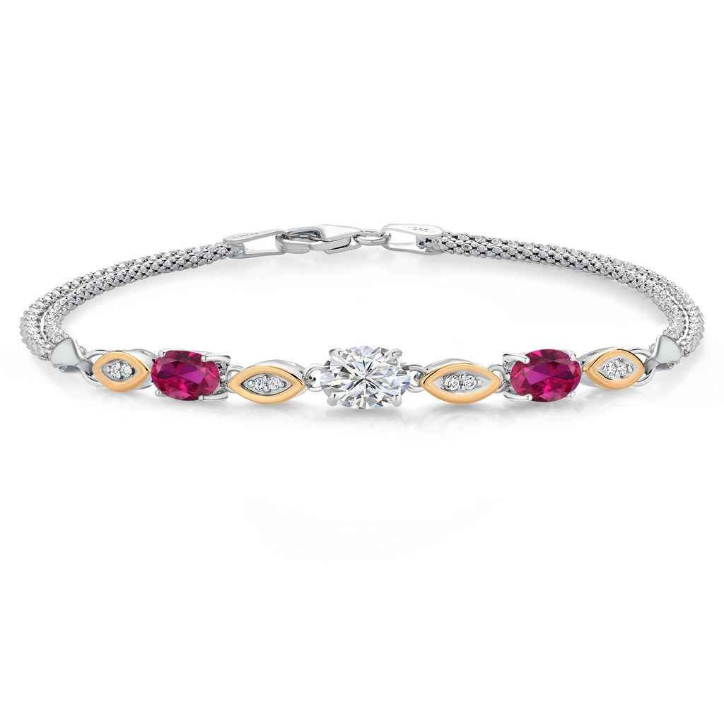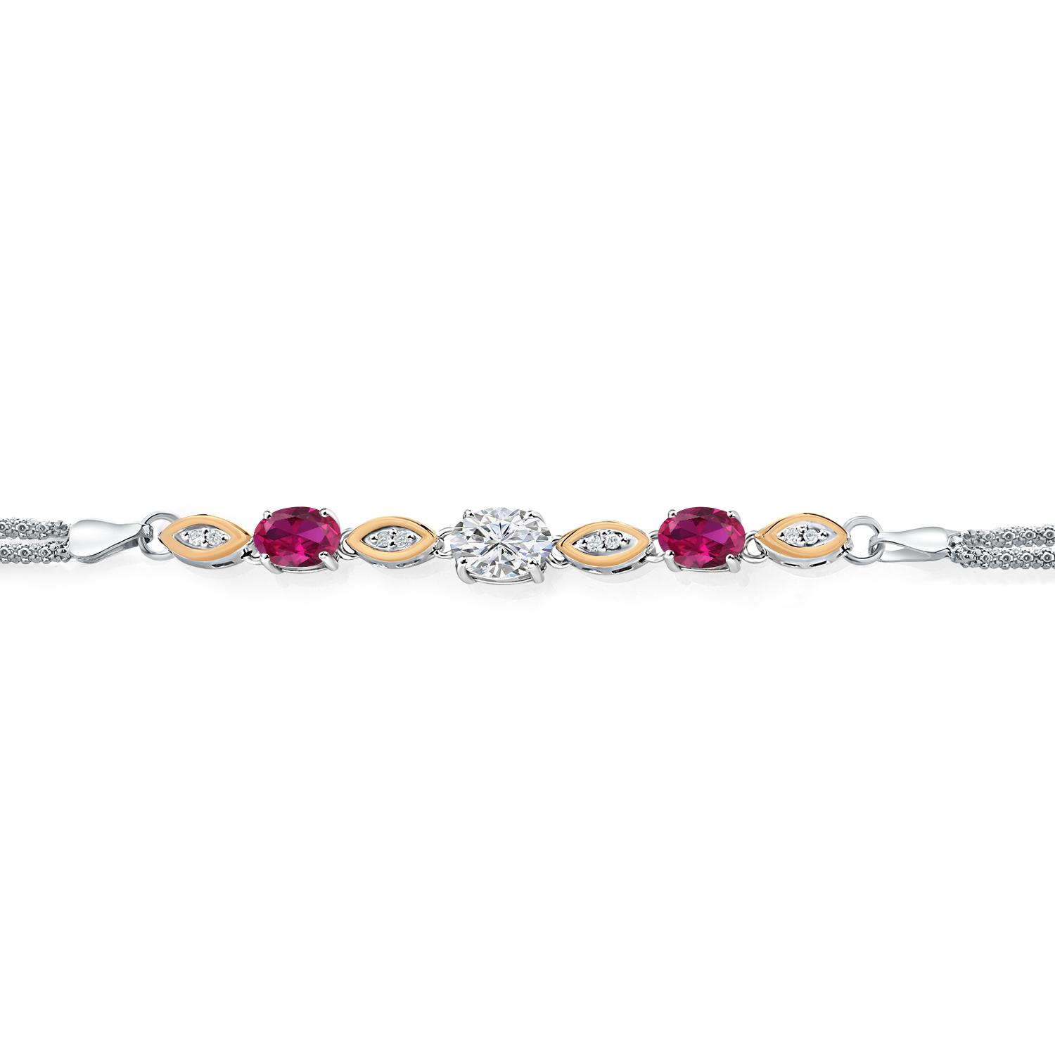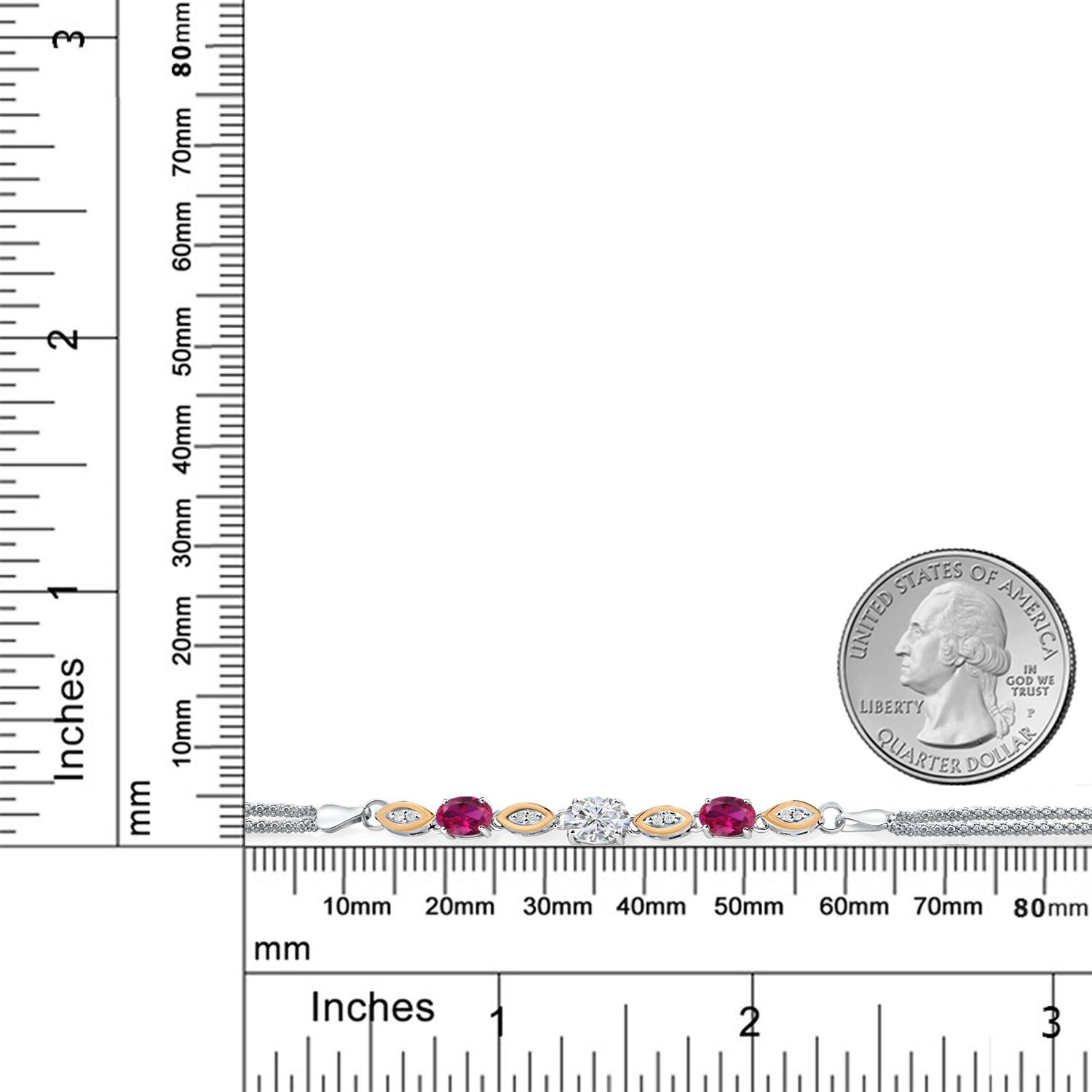 MEASUREMENTS: 8x6mm Oval E - F Lab Grown Diamond, 6x4mm Oval Heat-Treated Red Created Ruby1.1, x, 1.1, mm Round E - F Lab Grown Diamond. Total Carat Weight is 2.08 cttw