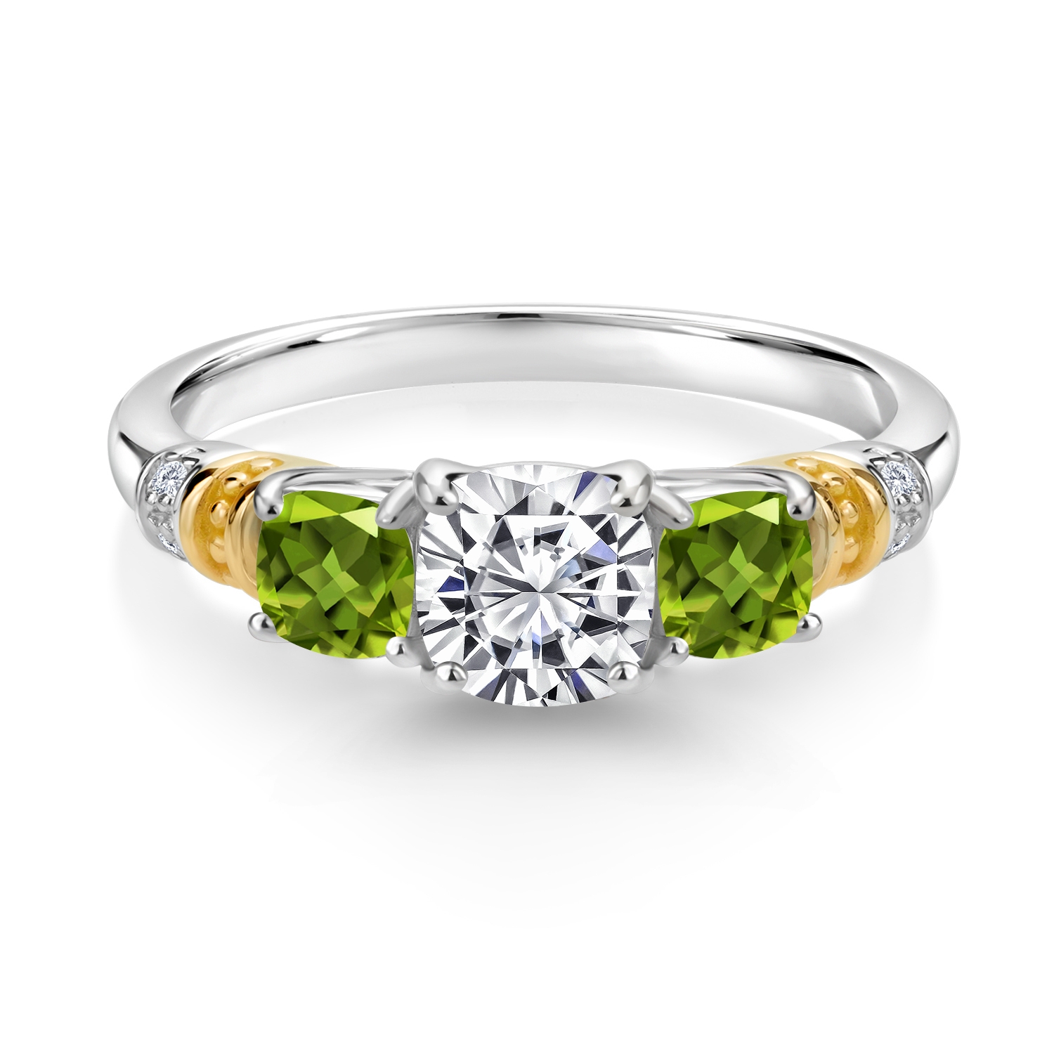 925 Silver and 10K Yellow Gold IGI Certified Lab Grown Diamond and Peridot 3 Stone Ring For Women | 1.70 Cttw | Center 1 Ct Cushion Diamond | E-F Color | VS1-VS2 Clarity