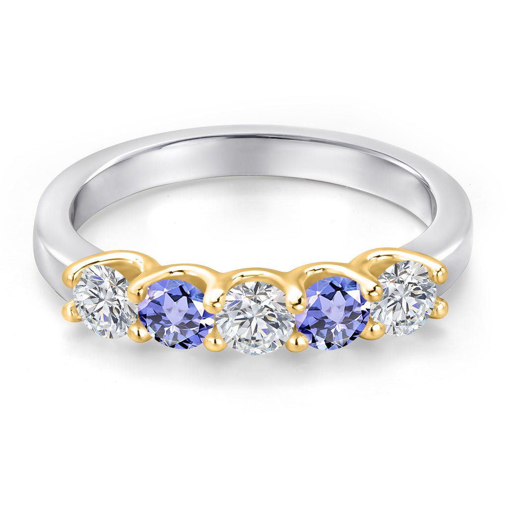MEASUREMENTS: 3.5x3.5mm Round E - F Lab Grown Diamond, 3.5x3.5mm Round Heat-Treated Blue Tanzanite. Total Carat Weight is 0.87 cttw