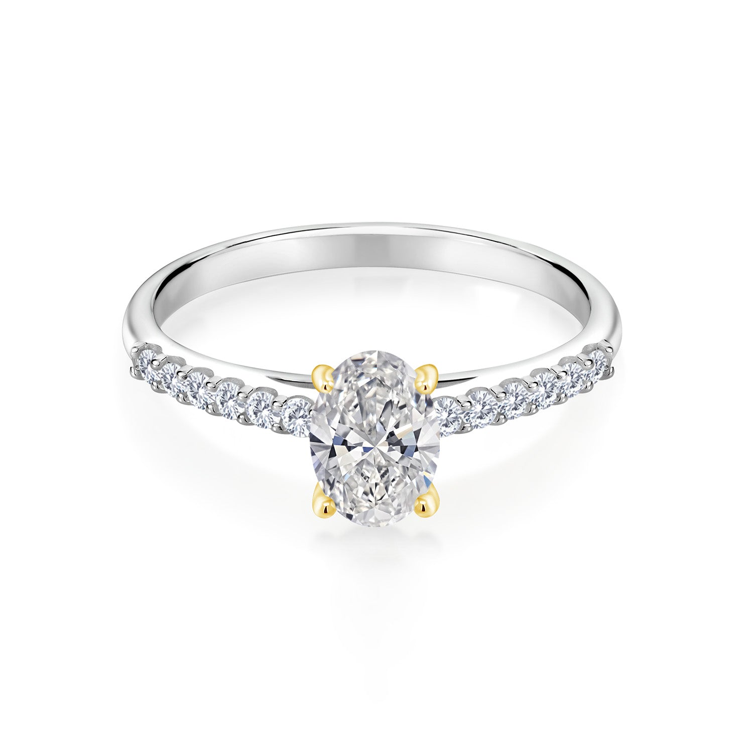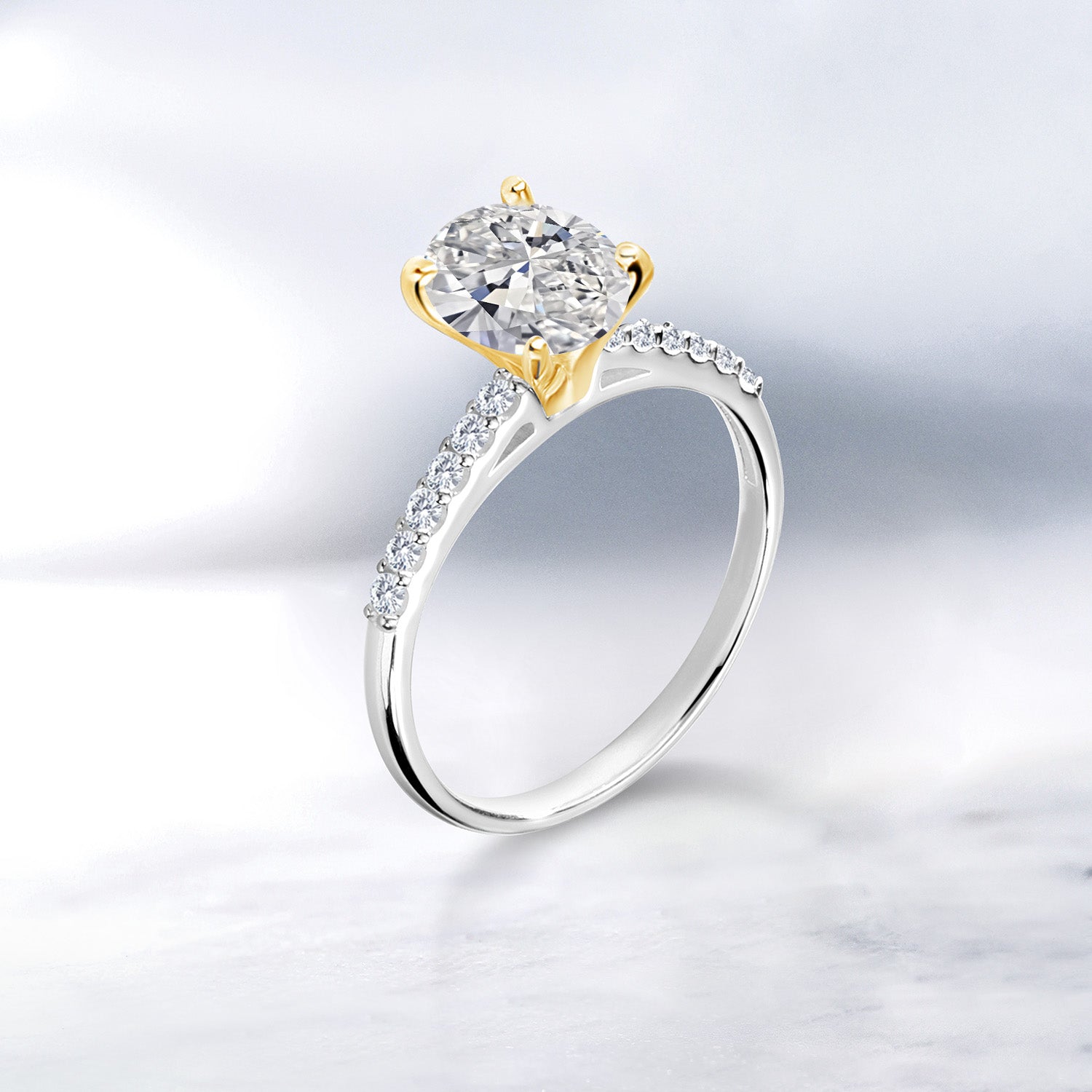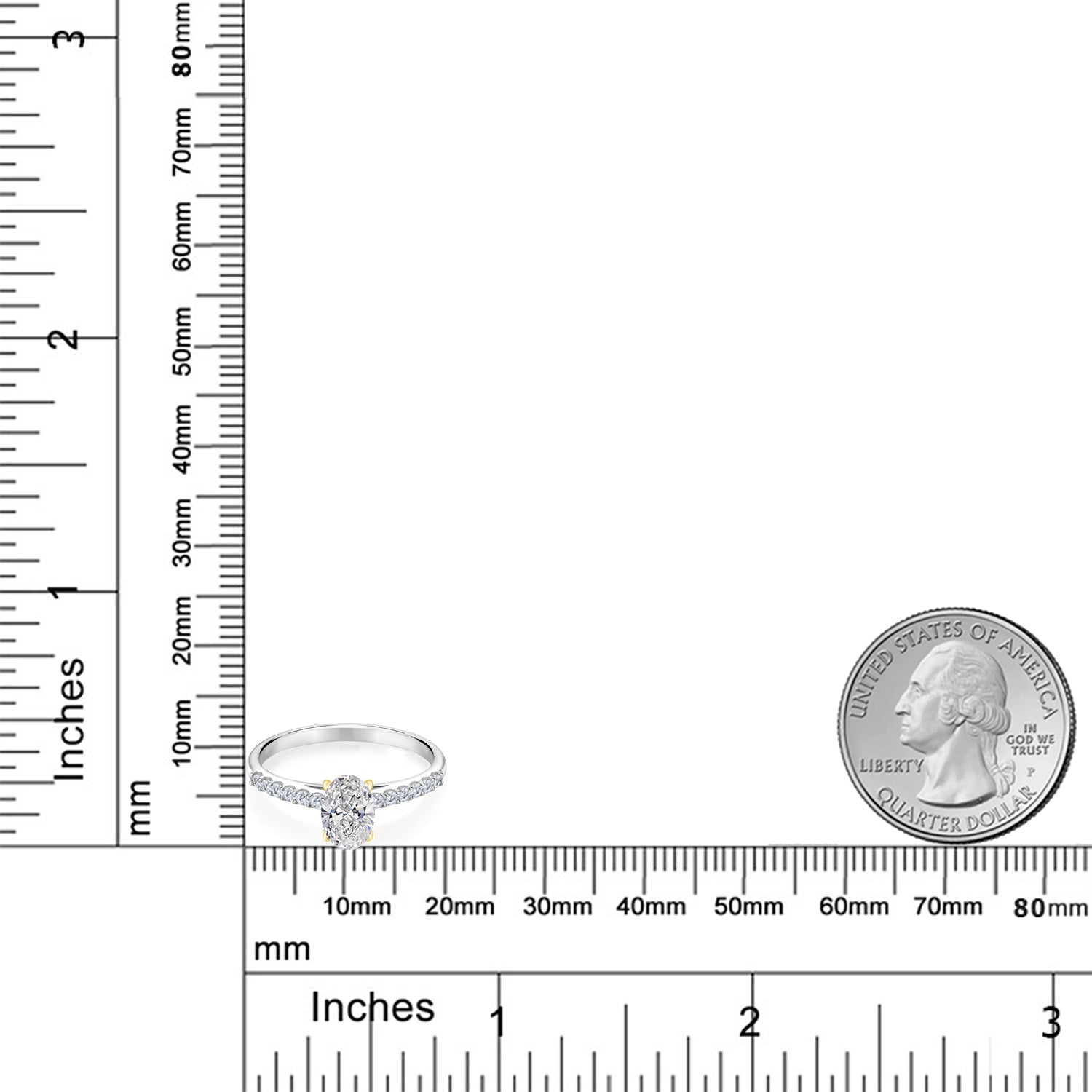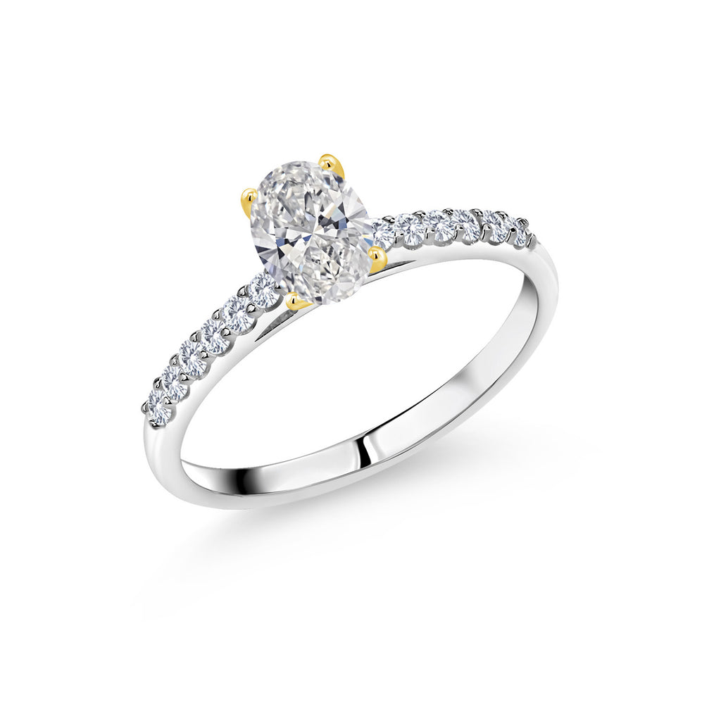 MEASUREMENTS: 7x5mm Oval DEF Lab Grown Diamond, 1.5x1.5mm Round E - F Lab Grown Diamond. Total Carat Weight is 0.88 cttw