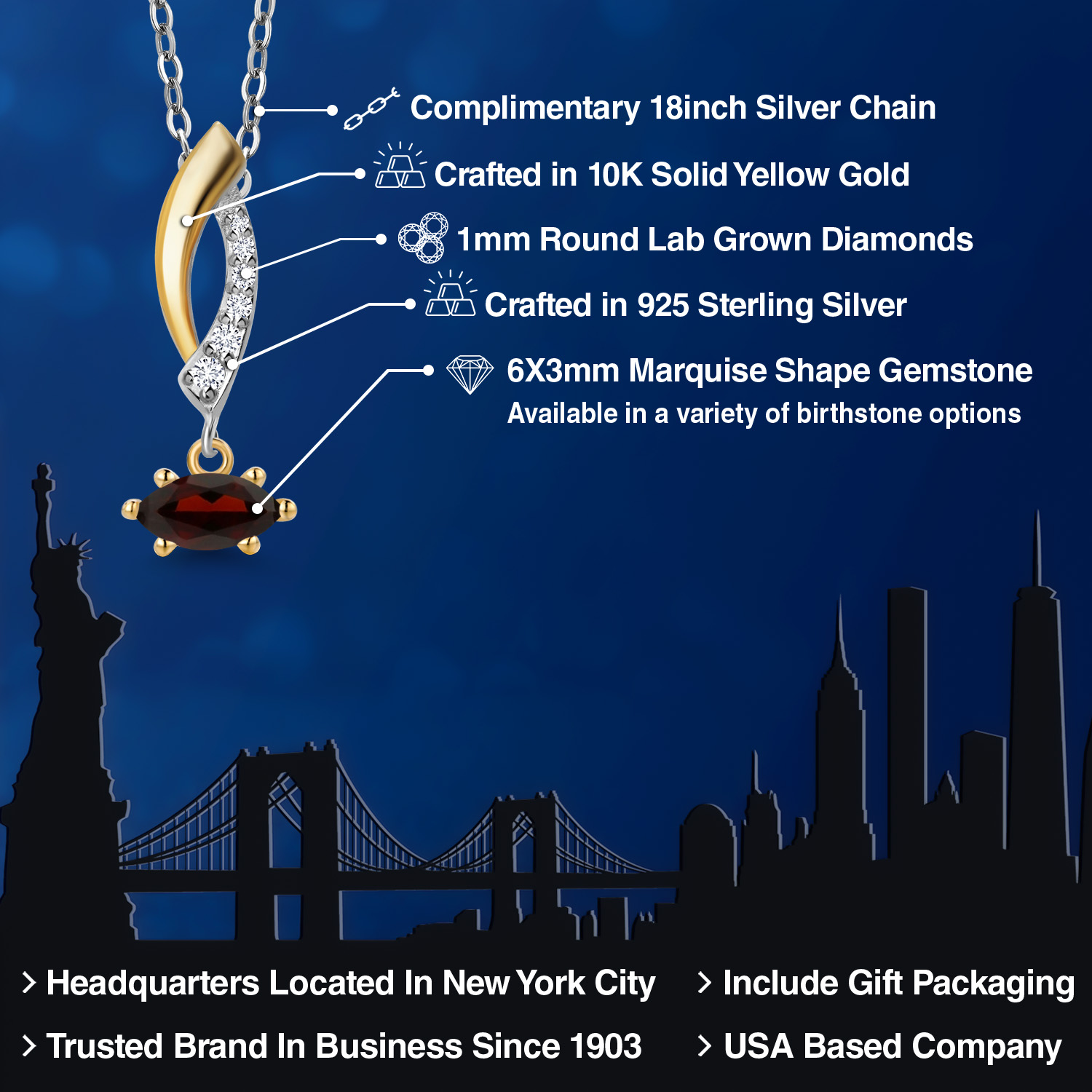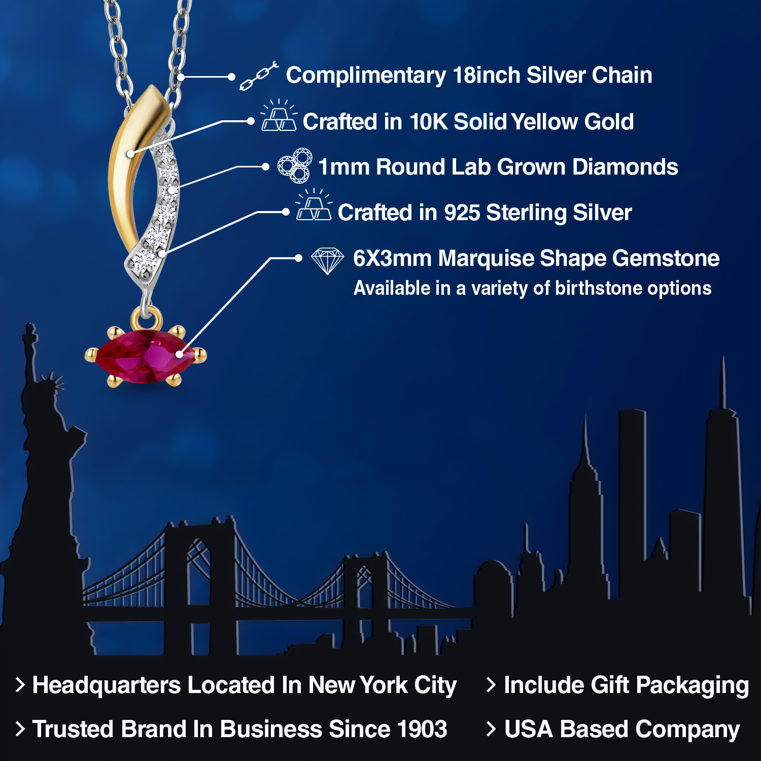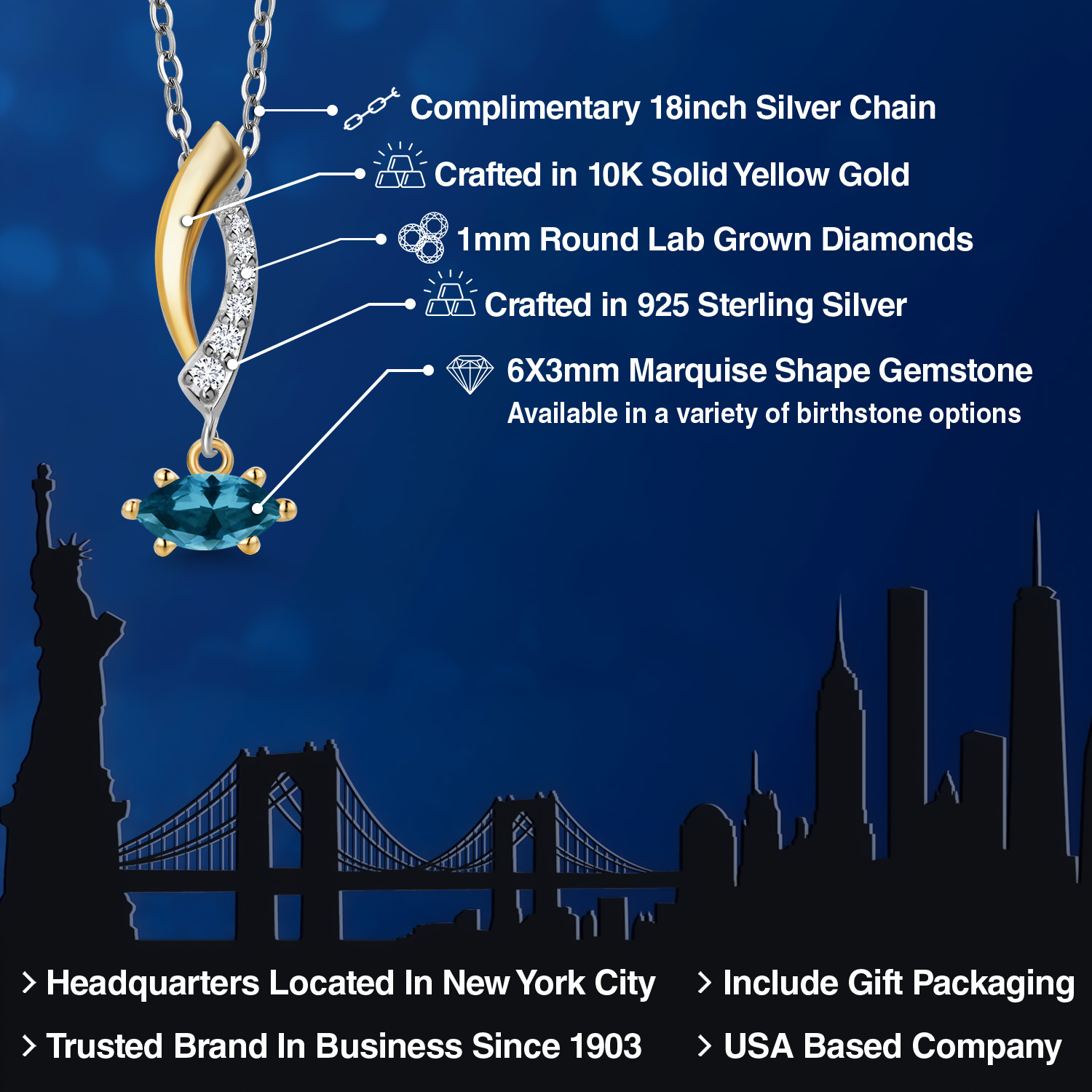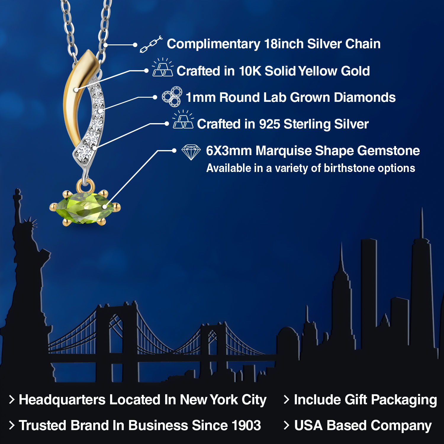 925 Silver and 10K Yellow Gold 6X3MM Marquise Gemstone Birthstone and White Lab Grown Diamond Pendant Necklace | Two-Tone Necklace For Women | 18 Inch Silver Chain