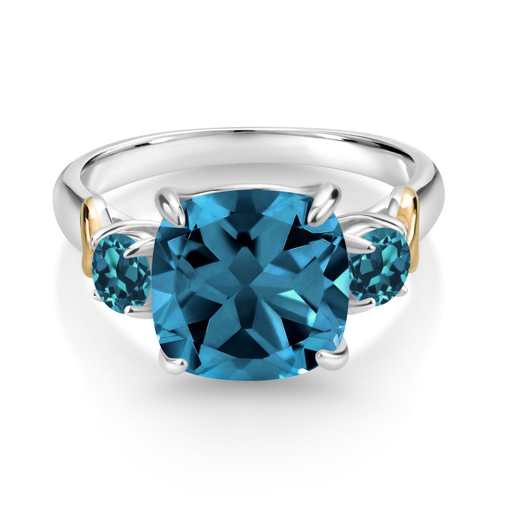 ELEGANT CRAFTSMANSHIP AND STRIKING DESIGN: This beautiful 3-stone ring features a total of 5.86 Cttw with a 10MM cushion-cut London blue topaz at its center, flanked by two 4MM round topaz stones. The combination of 925 Silver and 10K Yellow Gold adds a touch of luxury and contrast, creating a sophisticated and eye-catching piece.
