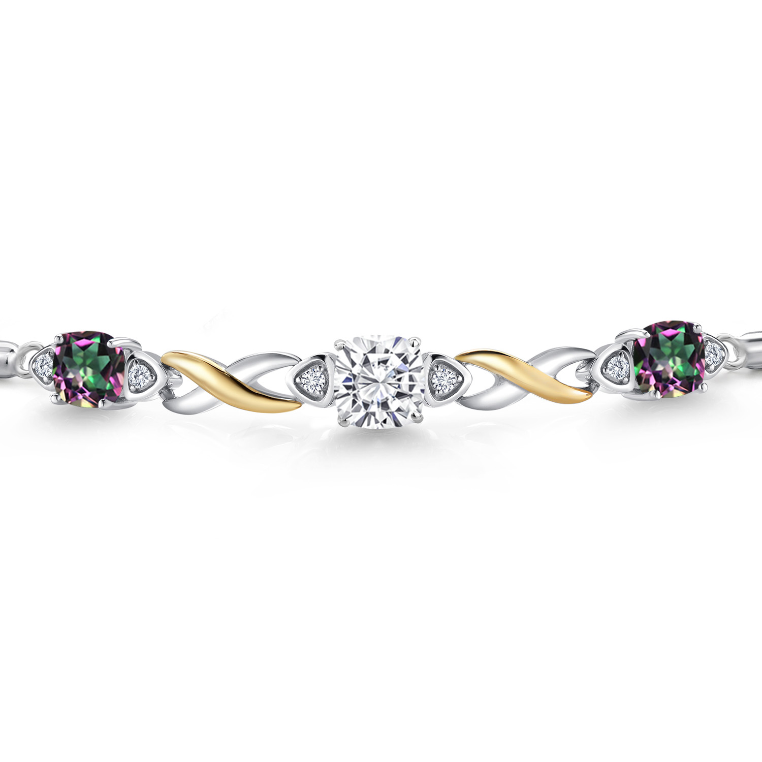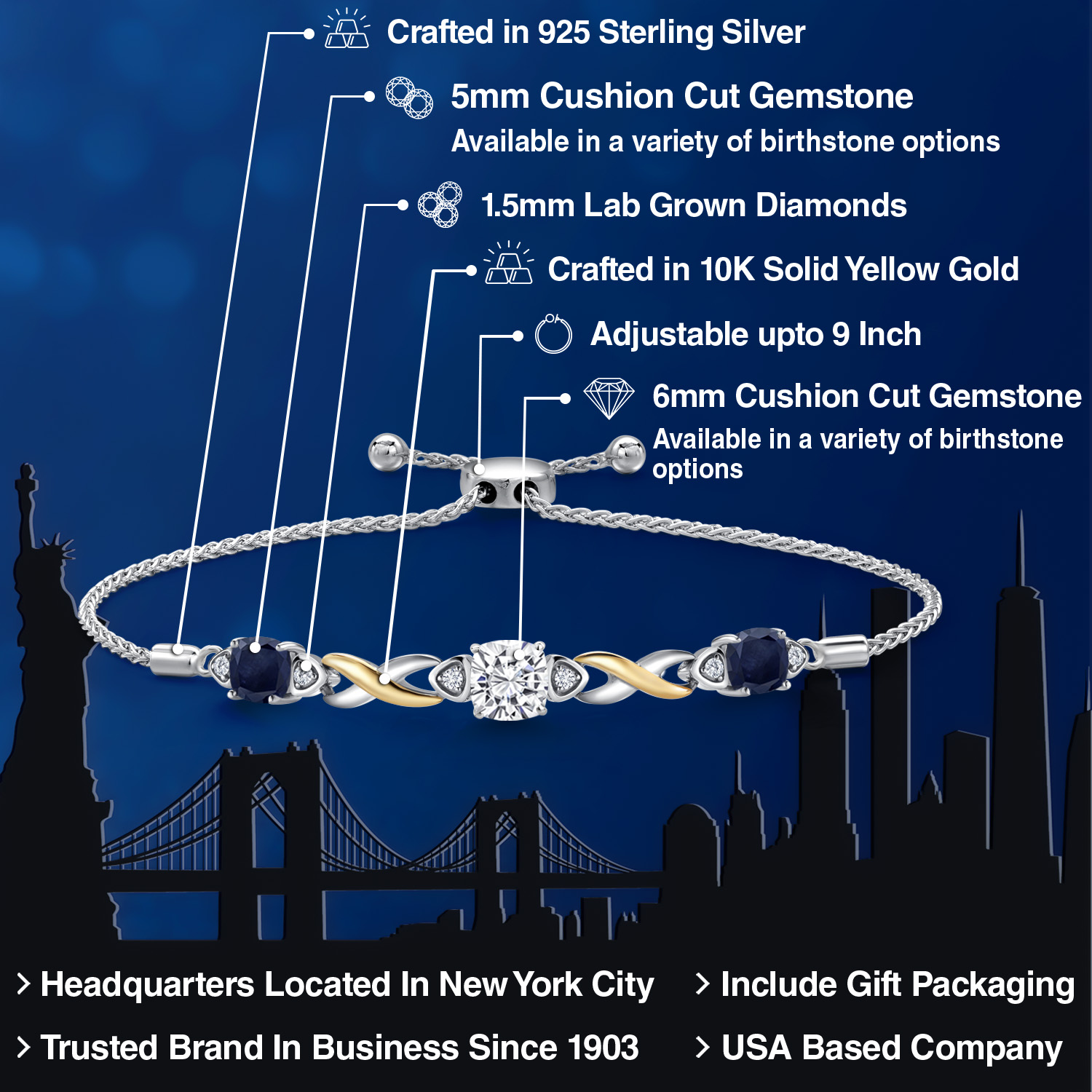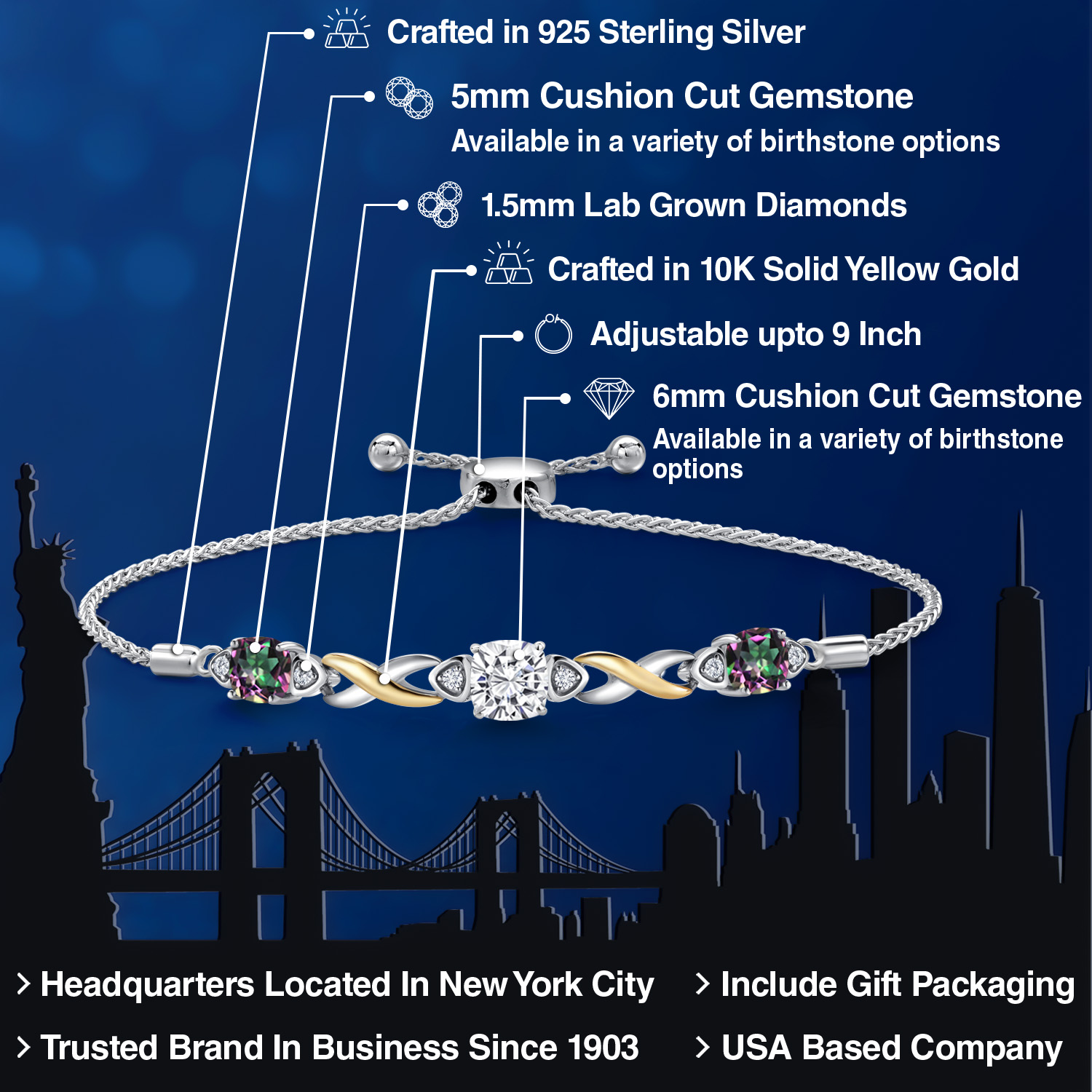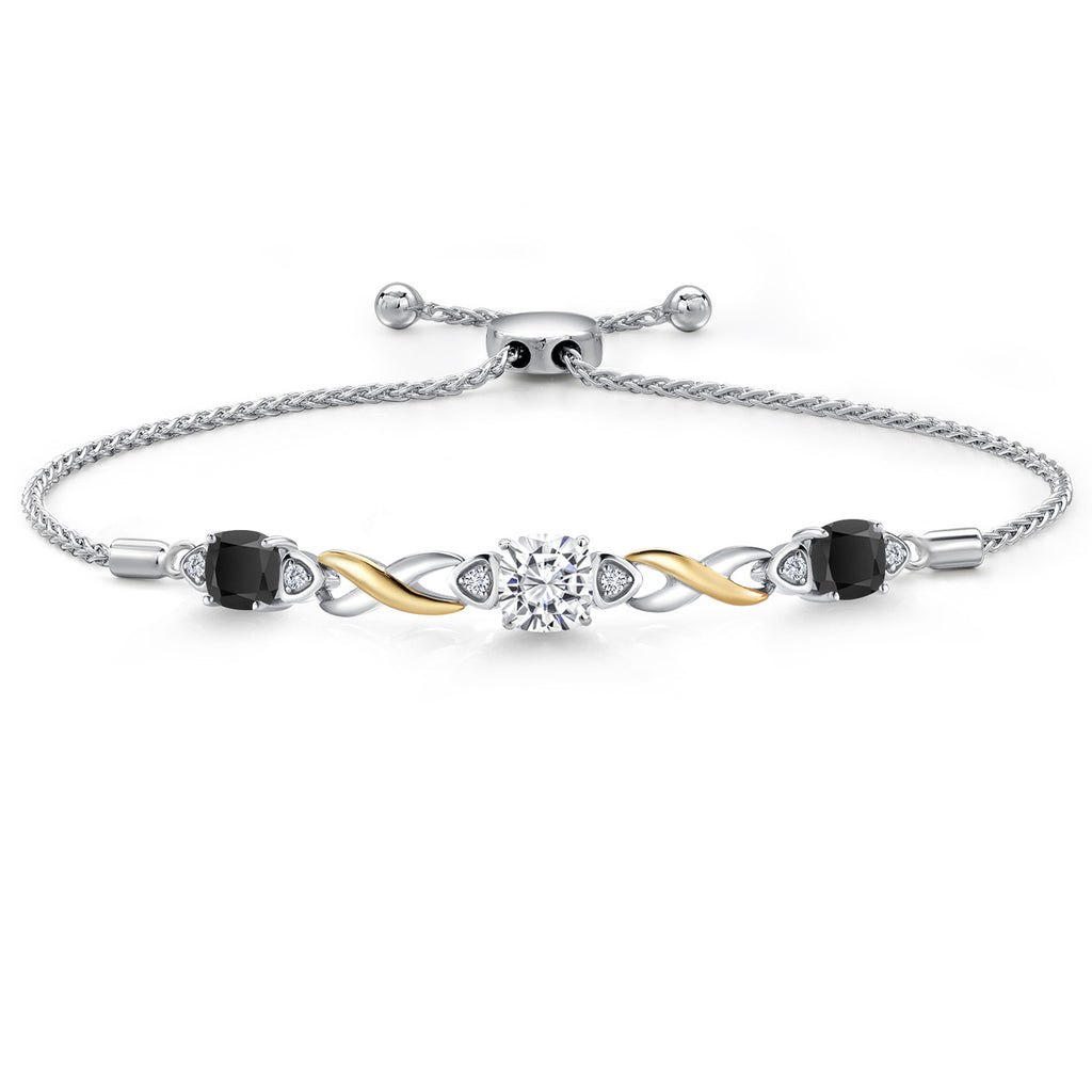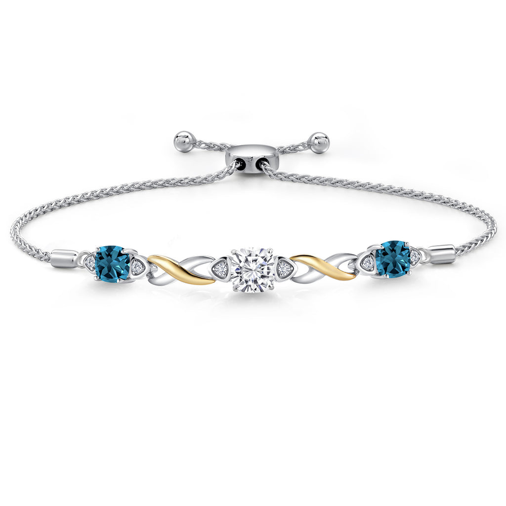 925 Silver and 10K Yellow Gold Moissanite and Gemstone Birthstone Infinity Bracelet for Women with Lab Grown Diamond Accents | Cushion 6MM and 5MM | Adjustable Bolo Bracelet | Easy-On Easy-Off