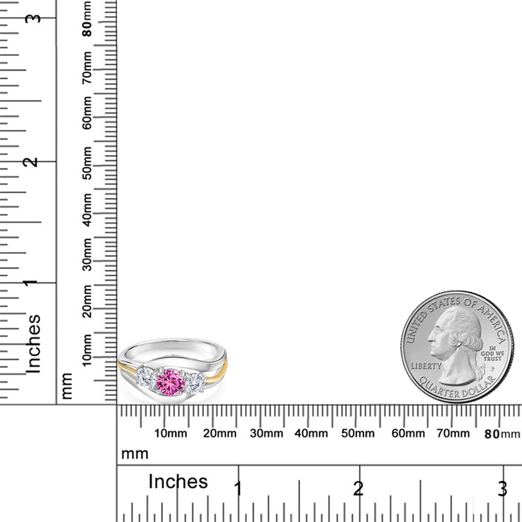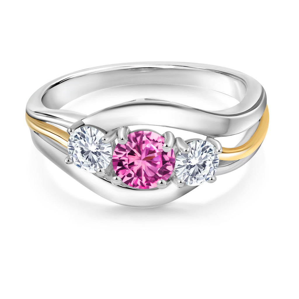 925 Silver and 10K Yellow Gold Pink Created Sapphire and Moissanite 3-Stone Ring for Women | 1.01 Cttw | Round 5MM & 4MM | 2-Tone Split-Shank Wedding Anniversary Promise Ring