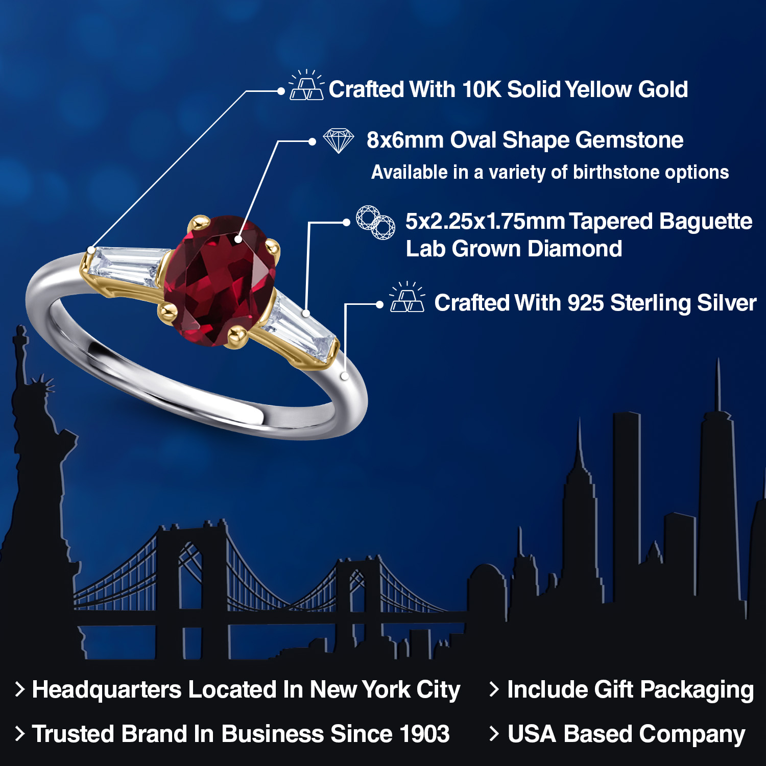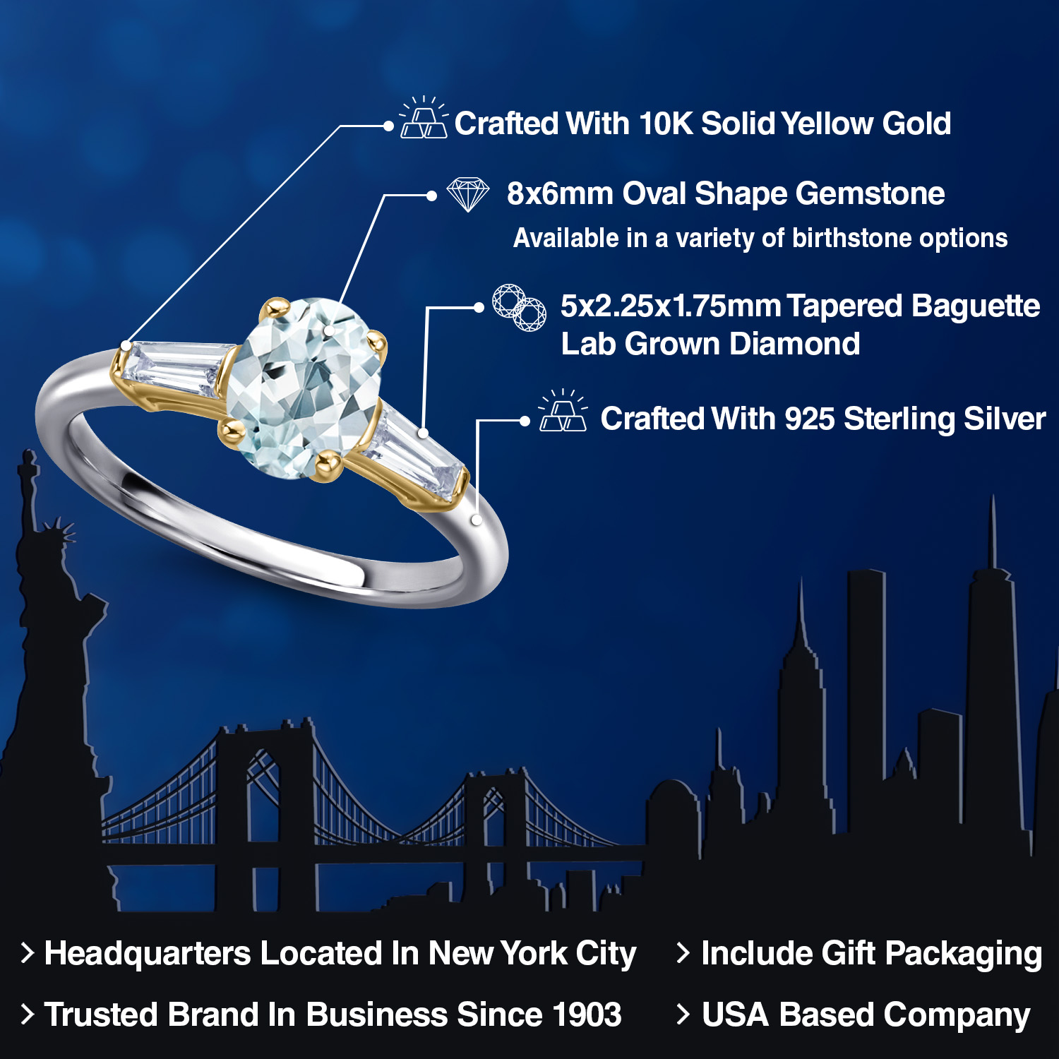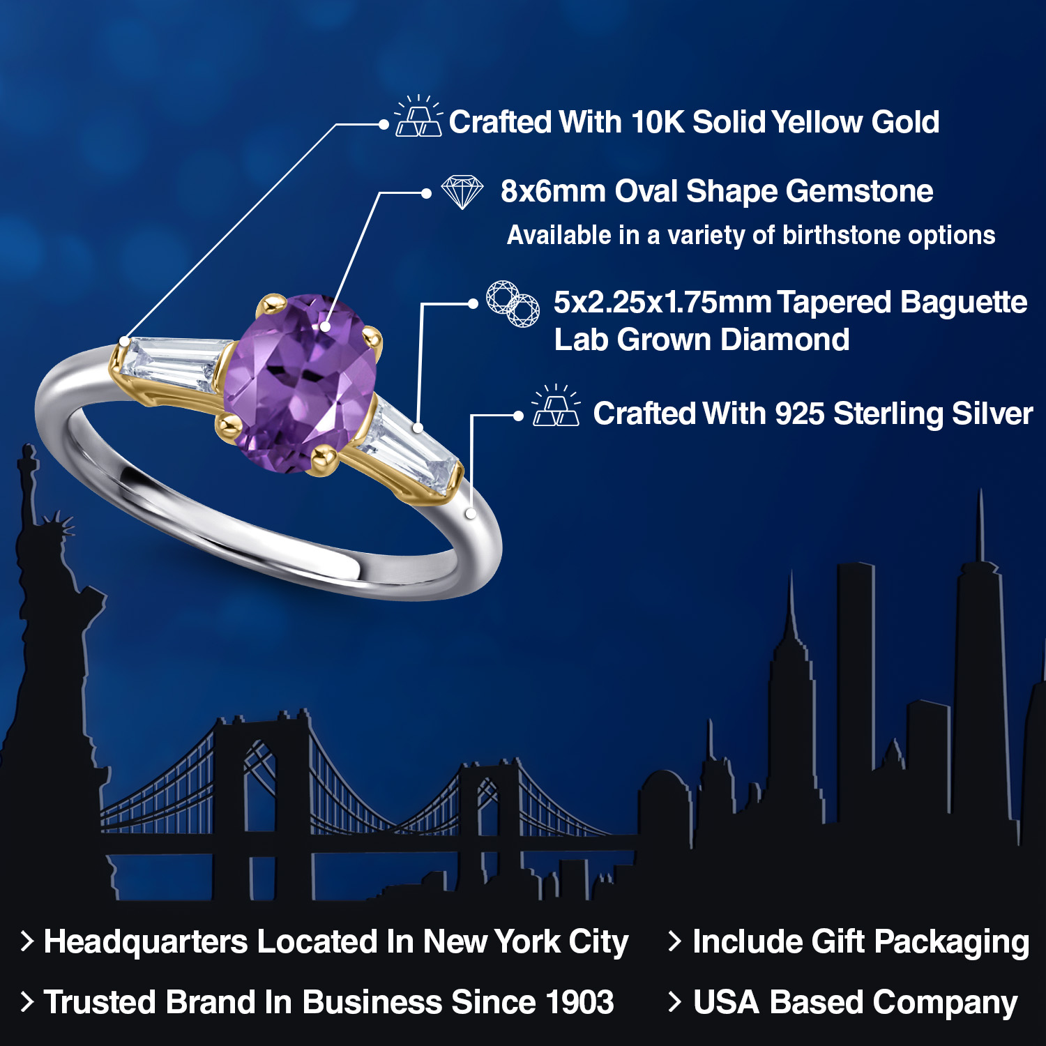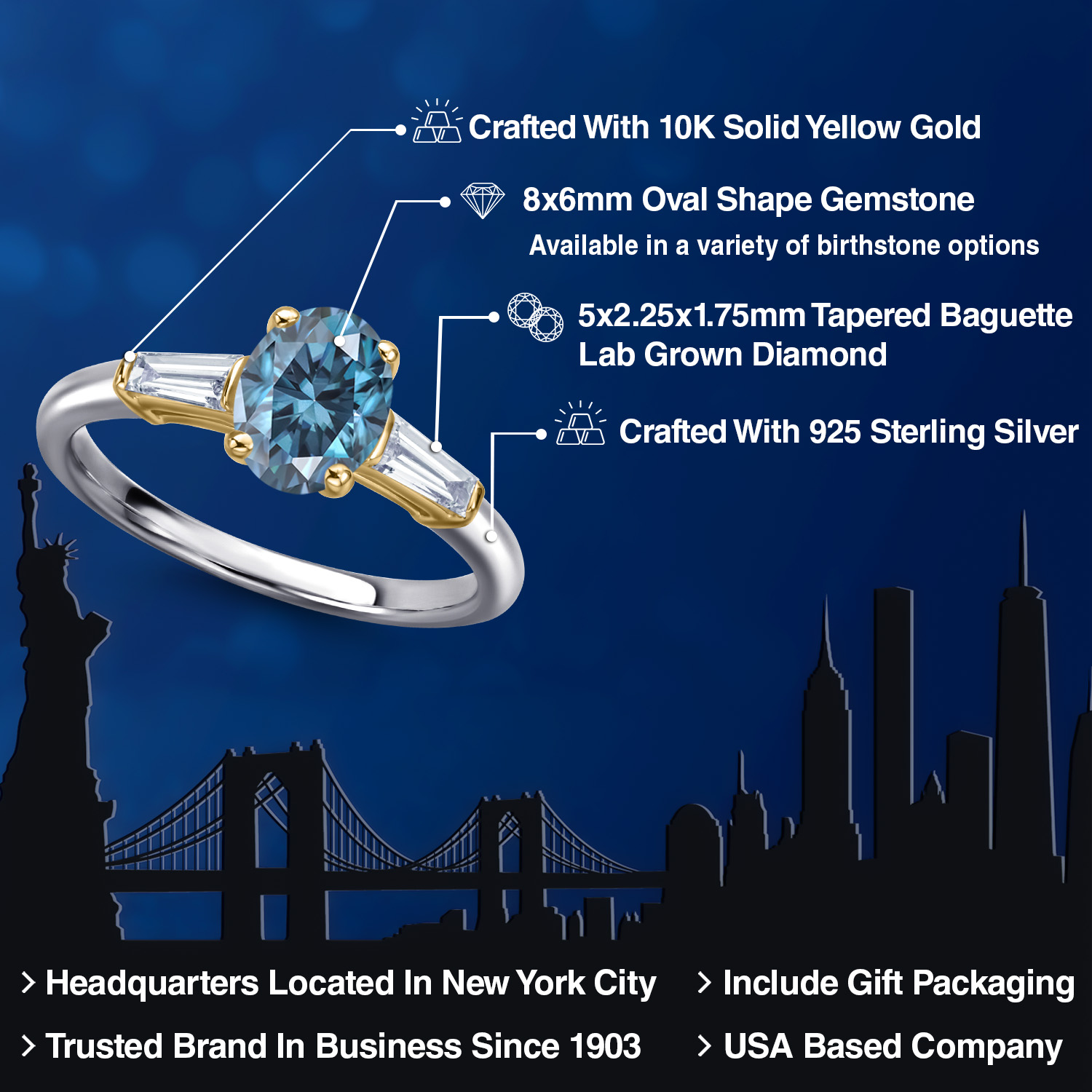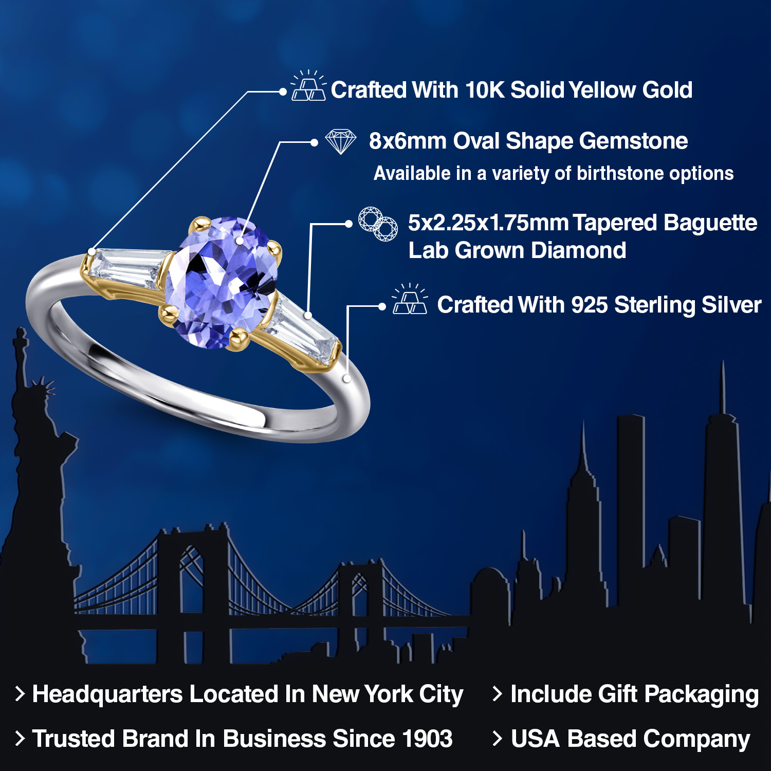 925 Silver and 10K Yellow Gold Gemstone Birthstone and Tapered Baguette Lab Grown Diamond Engagement Ring For Women | Oval 8X6MM | Available in Size 5,6,7,8,9