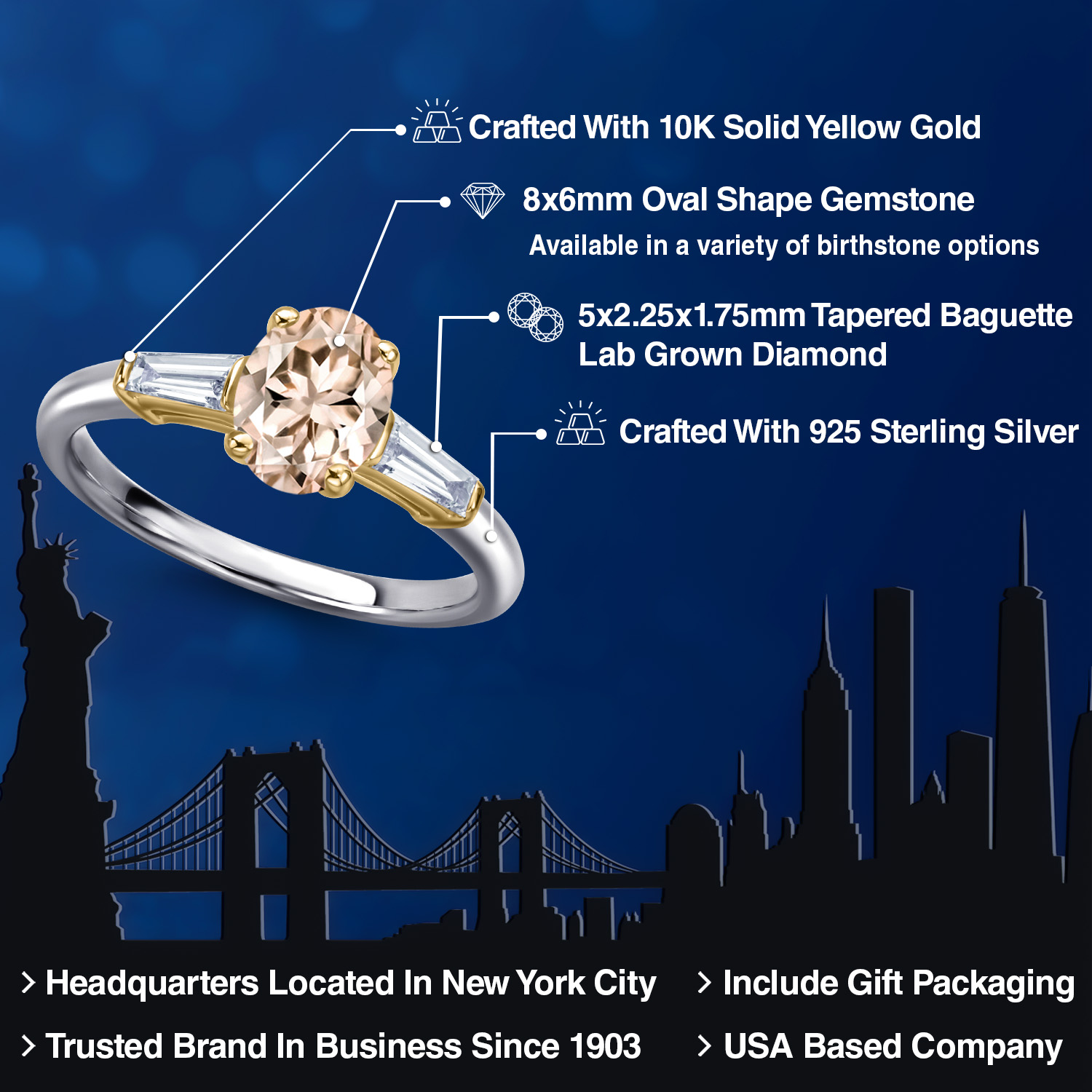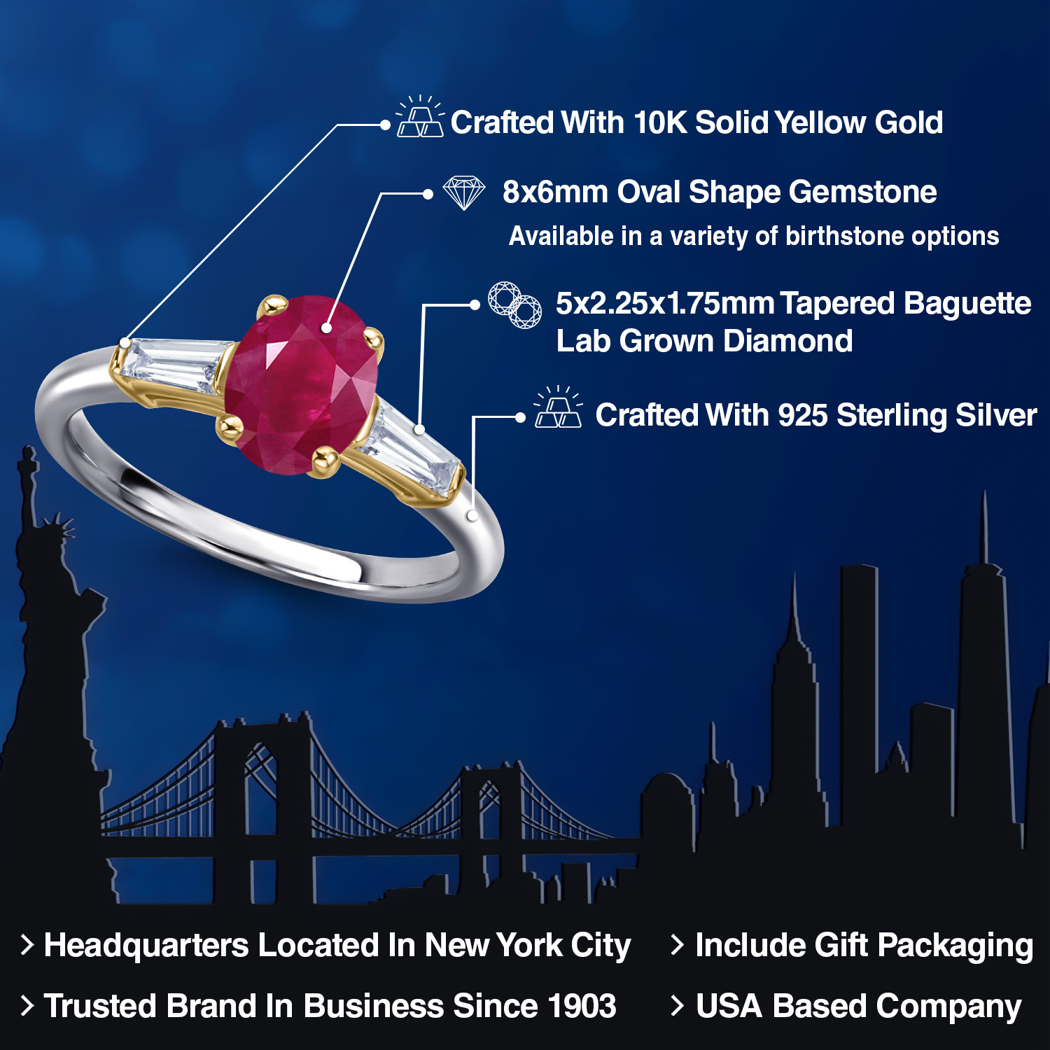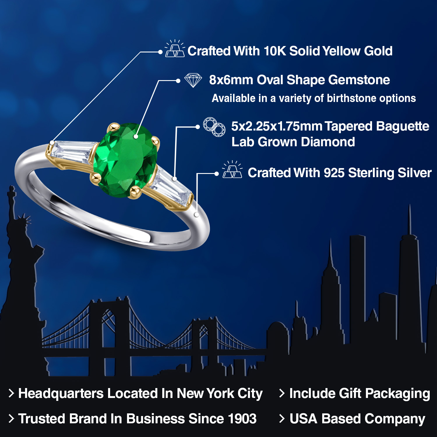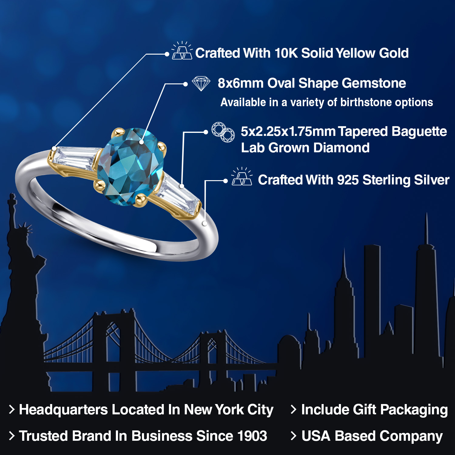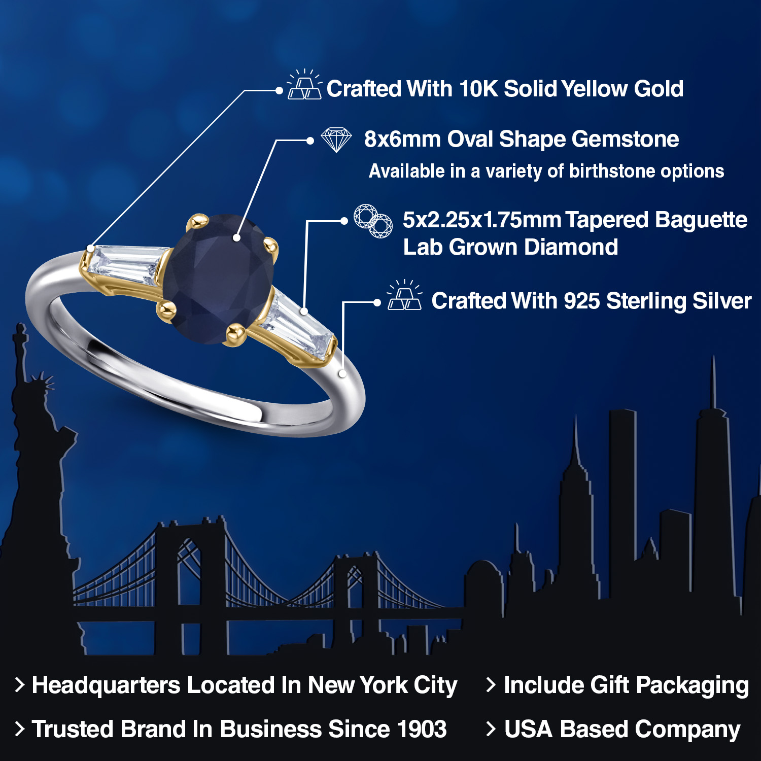 925 Silver and 10K Yellow Gold Gemstone Birthstone and Tapered Baguette Lab Grown Diamond Engagement Ring For Women | Oval 8X6MM | Available in Size 5,6,7,8,9