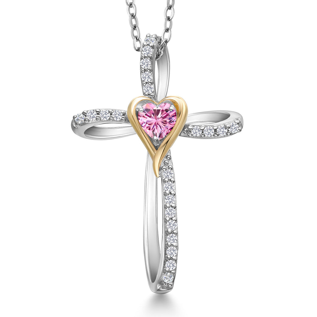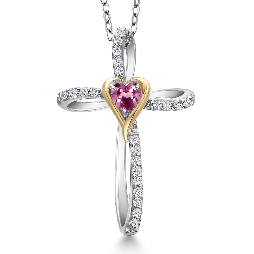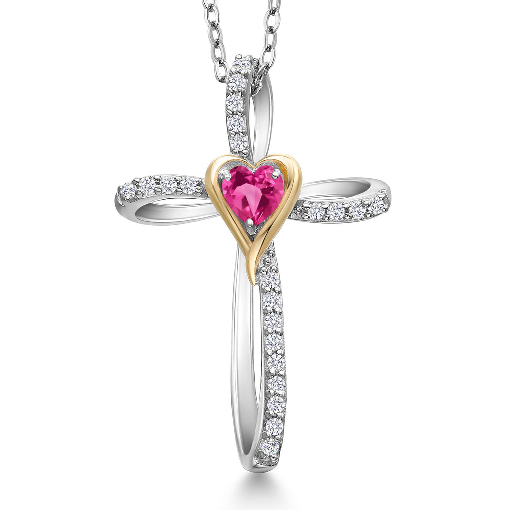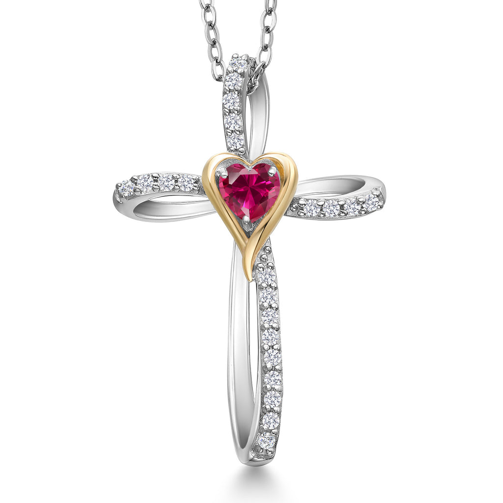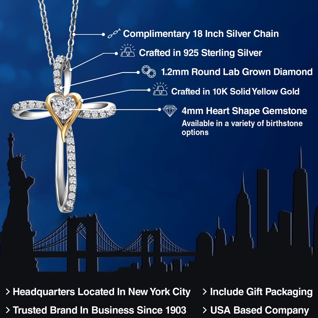 Cross Necklace For Women | 925 Silver and 10K Yellow Gold | 4MM Heart Shape Gemstone Birthstone and White Lab Grown Diamond Cross Pendant Necklace For Women | 18 Inch Chain
