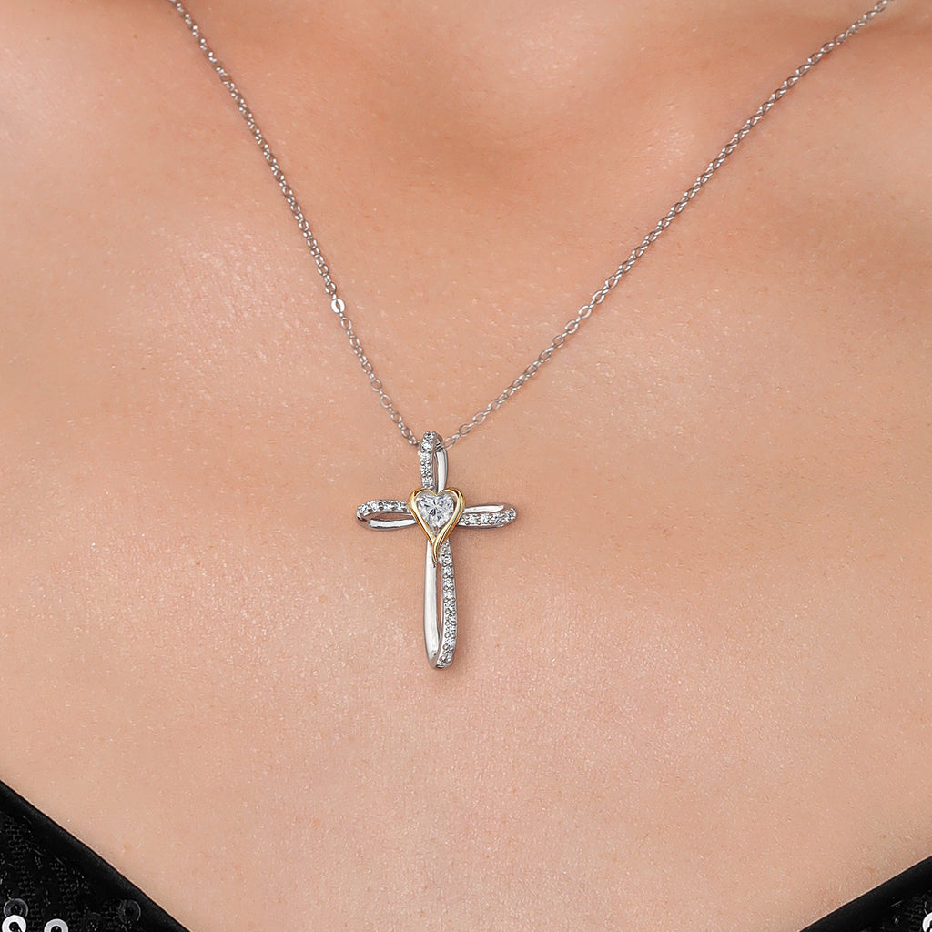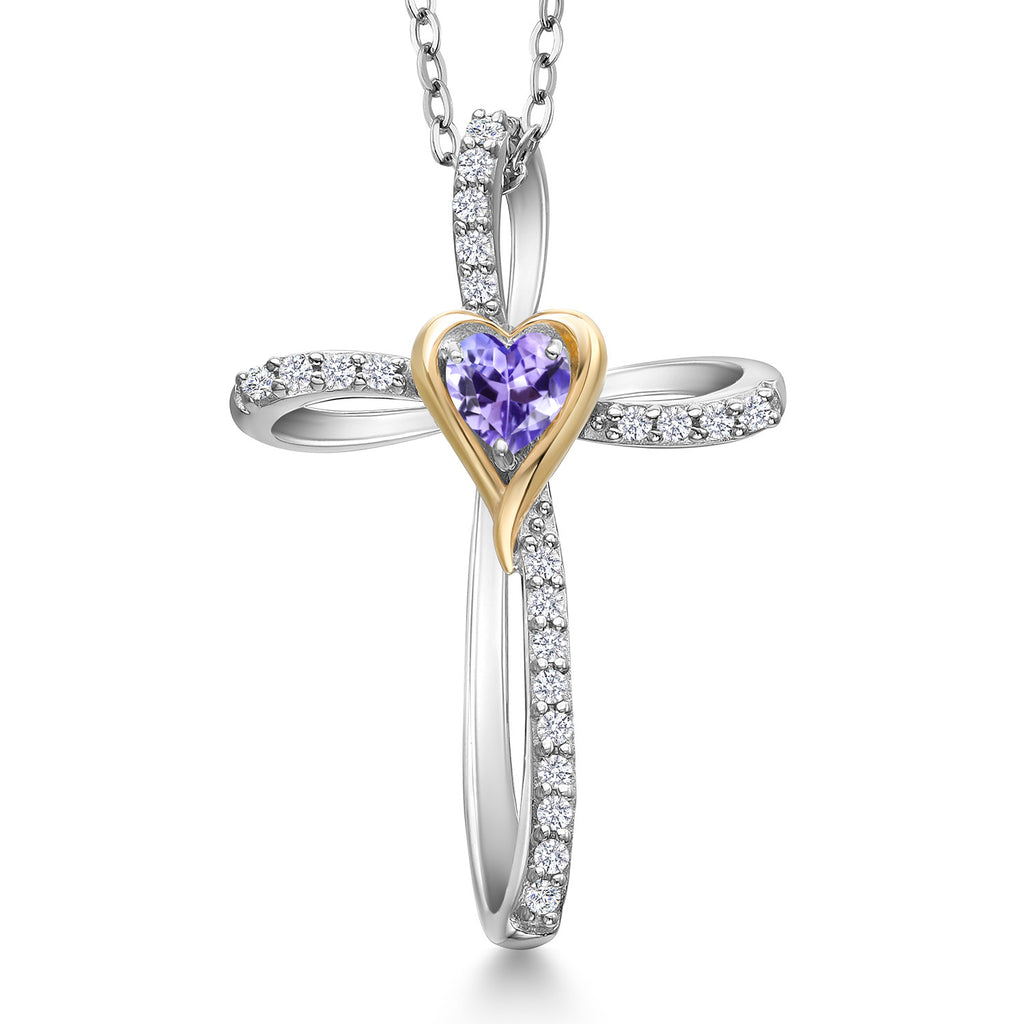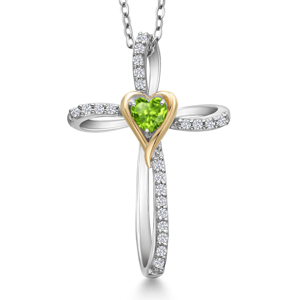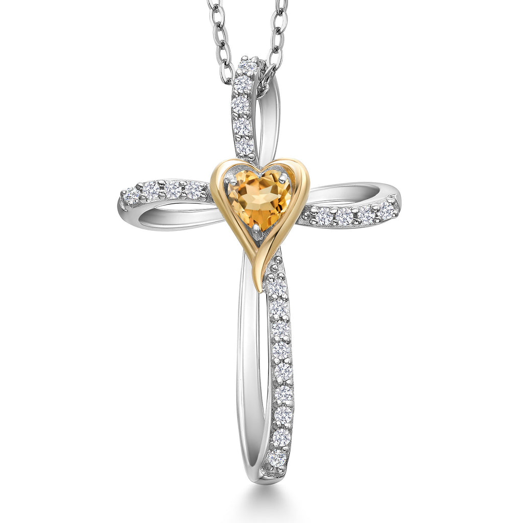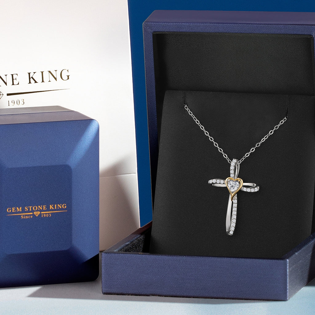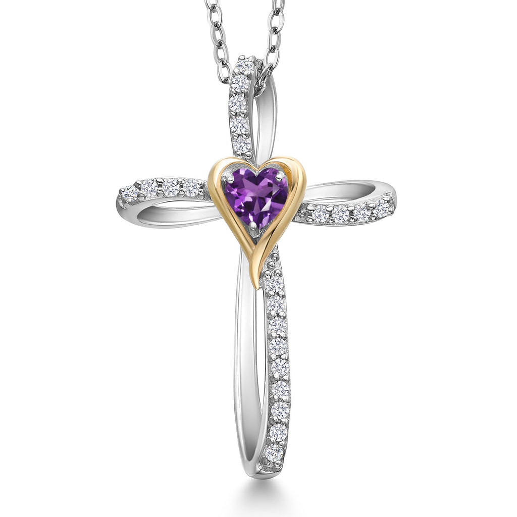 Cross Necklace For Women | 925 Silver and 10K Yellow Gold | 4MM Heart Shape Gemstone Birthstone and White Lab Grown Diamond Cross Pendant Necklace For Women | 18 Inch Chain