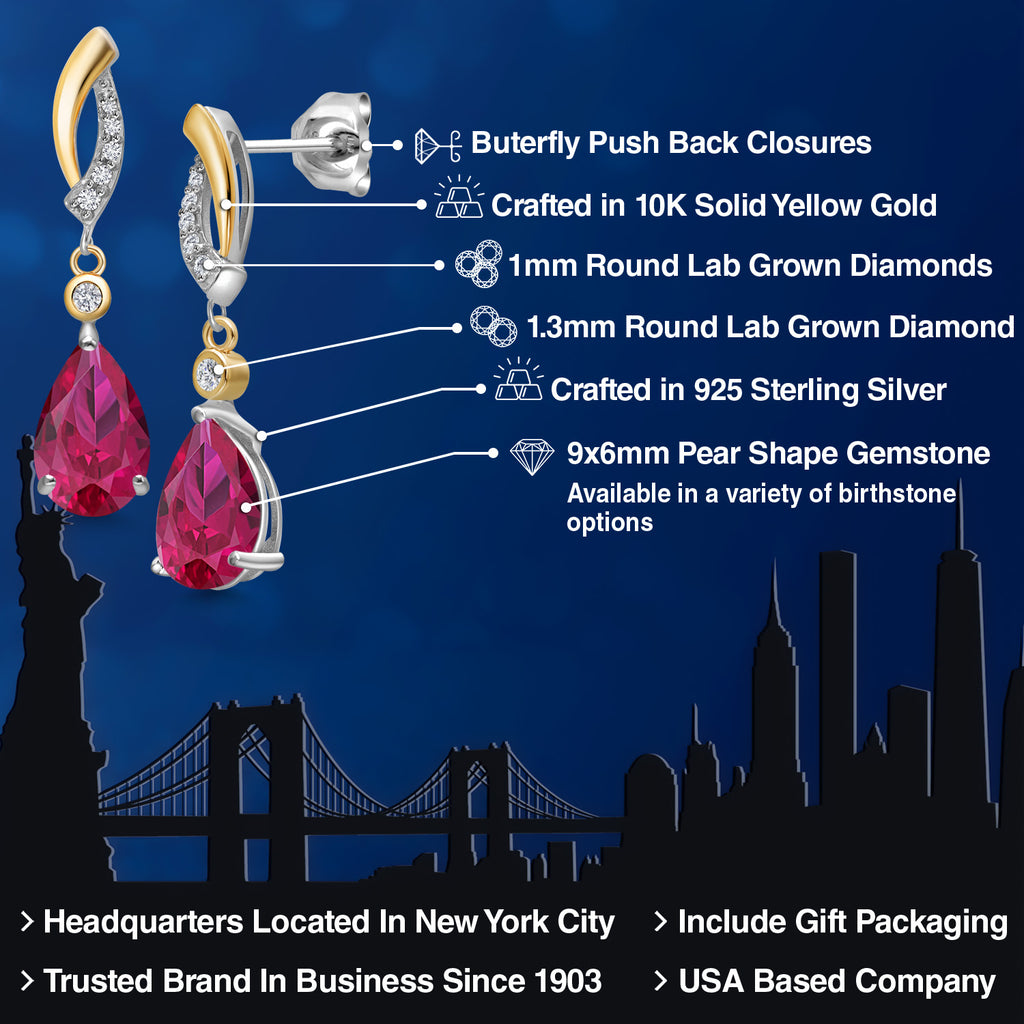 925 Silver and 10K Yellow Gold Red Created Ruby and White Lab Grown Diamond Earrings For Women | 2.97 Cttw | Gemstone July Birthstone | Pear Shape 9X6MM