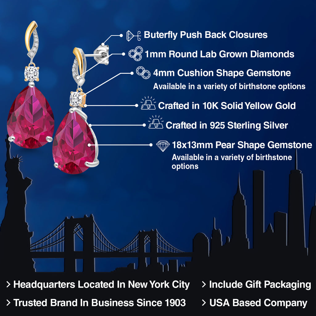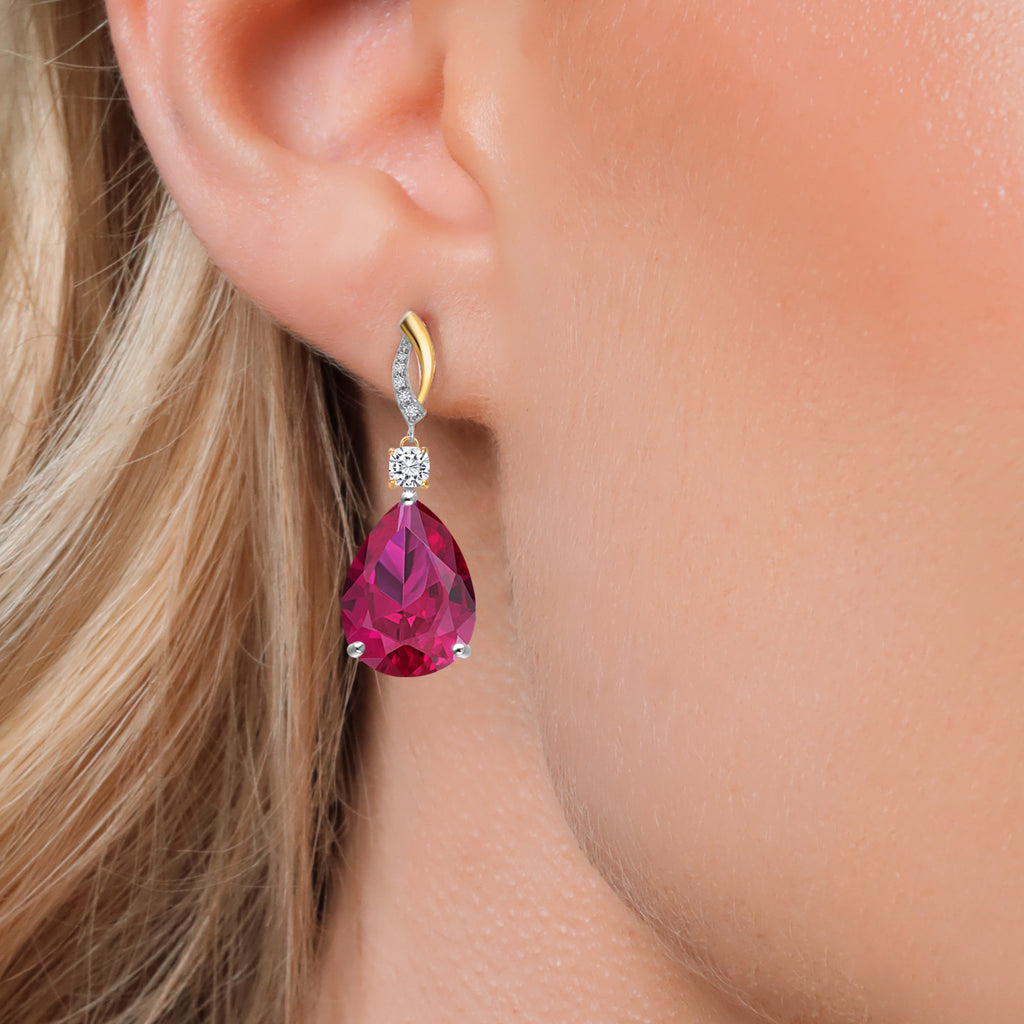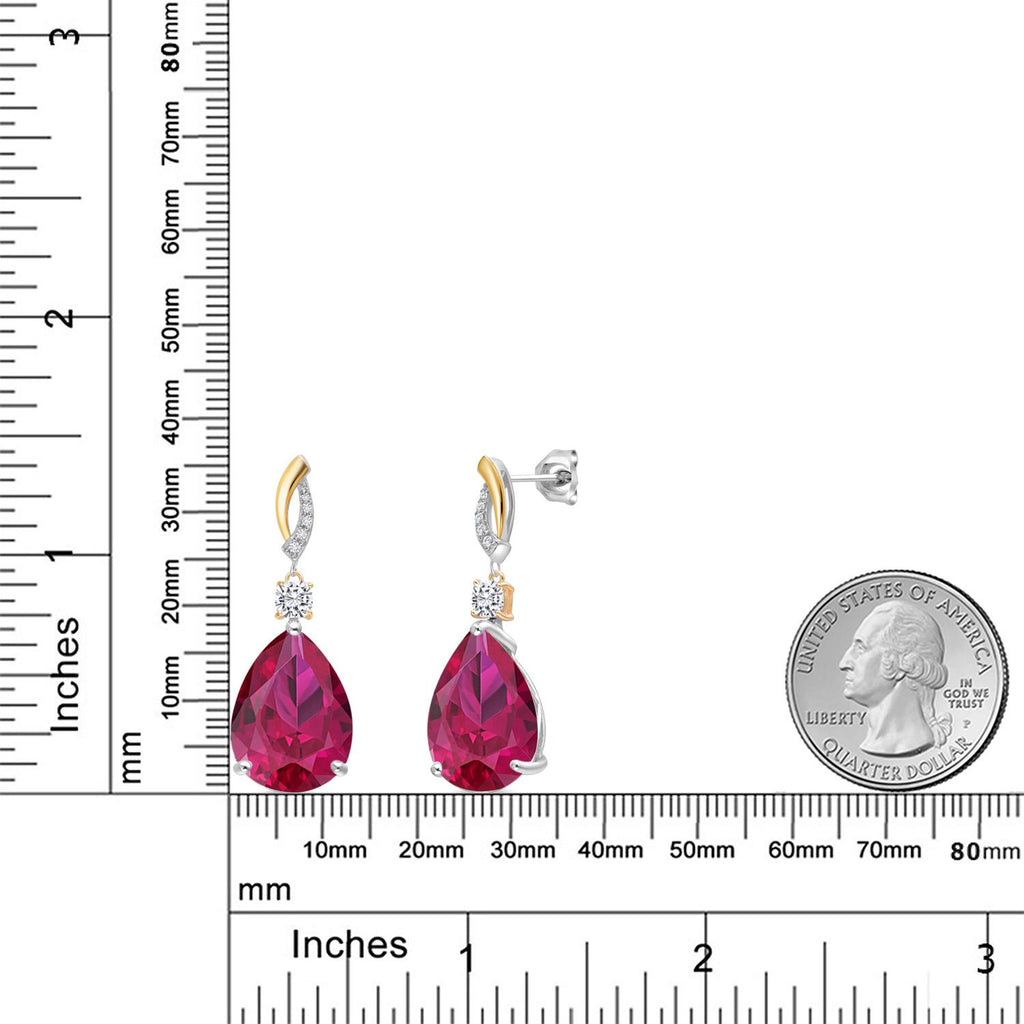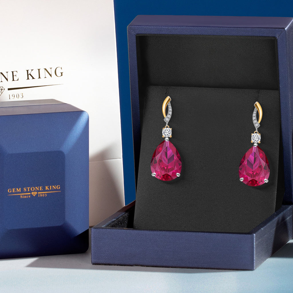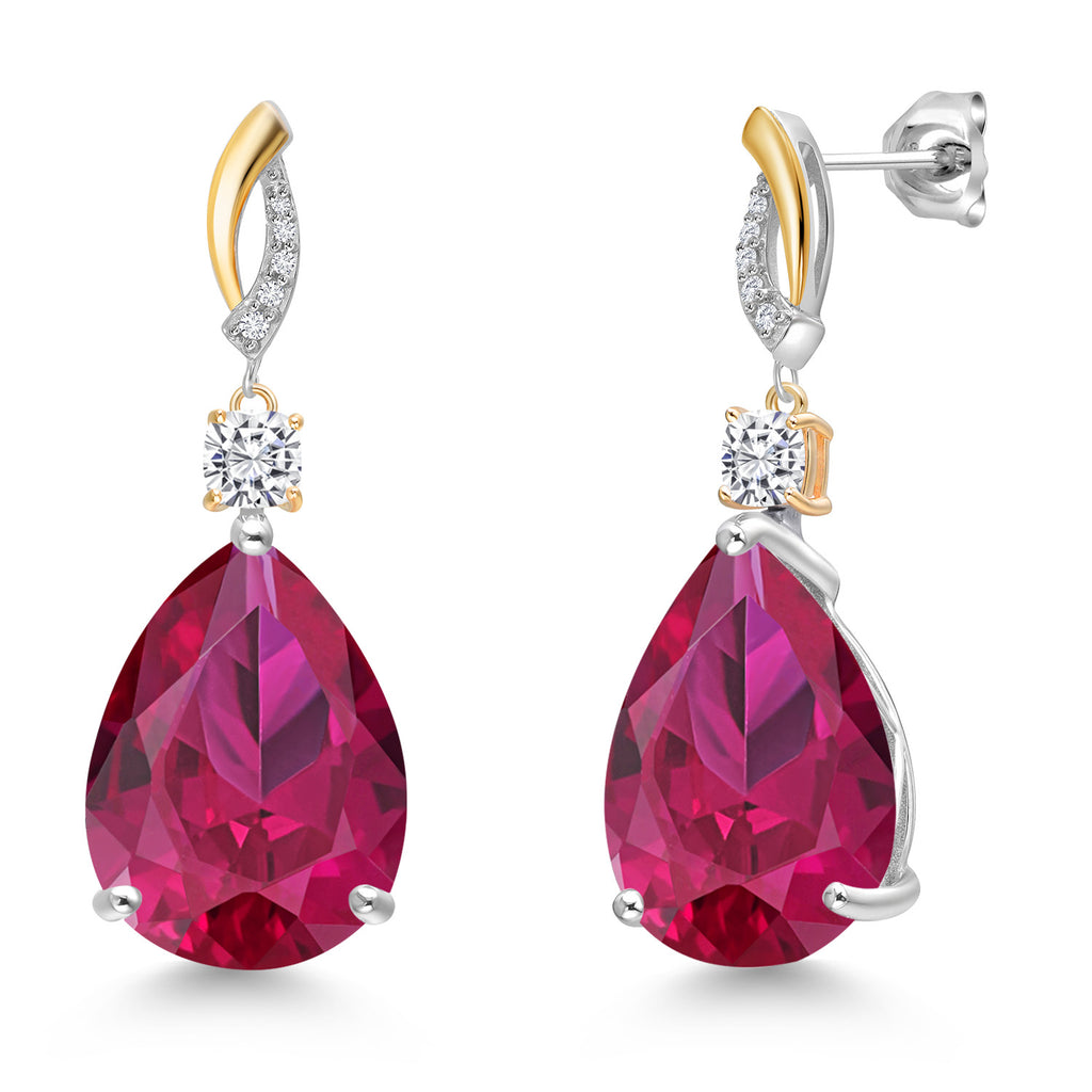 925 Silver and 10K Yellow Gold Red Created Ruby and White Moissanite and White Lab Grown Diamond Earrings For Women | 26.69 Cttw | GemstoneJuly Birthstone | Pear Shape 18X13MM