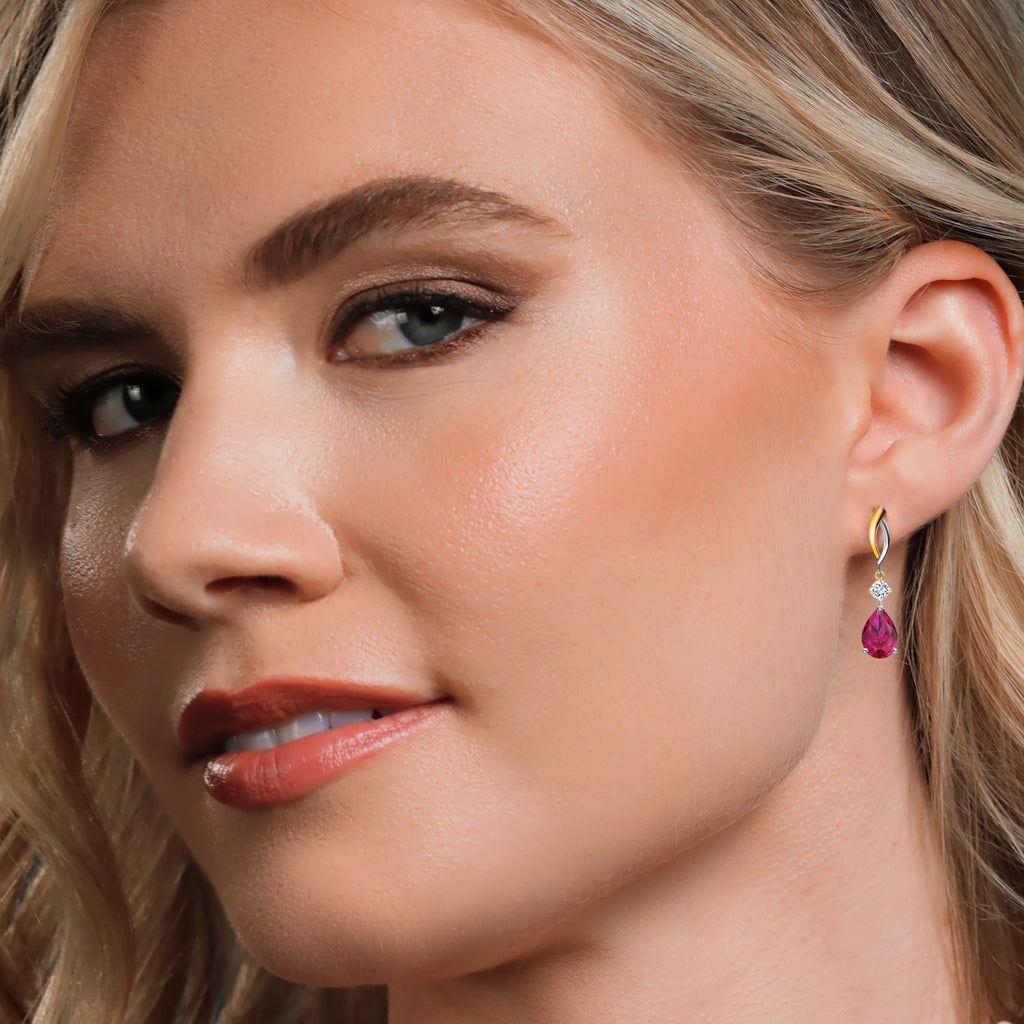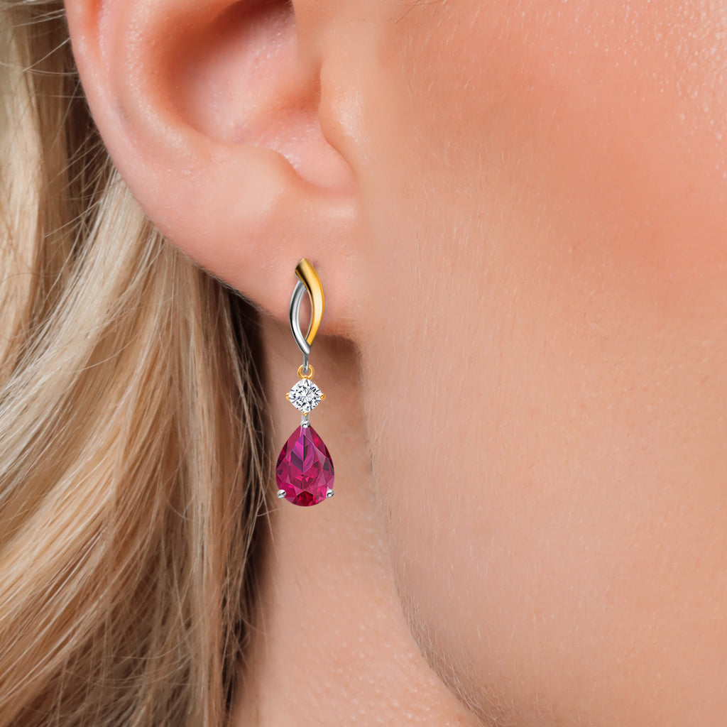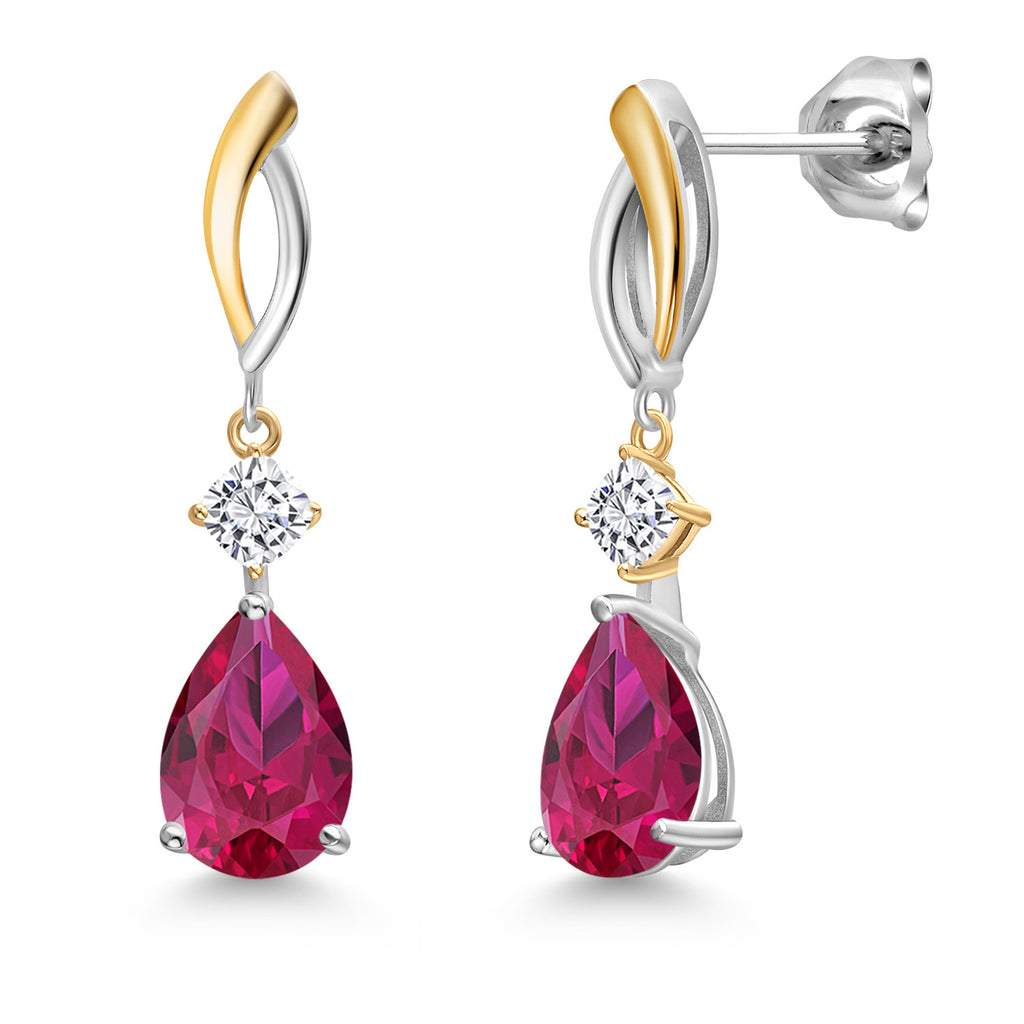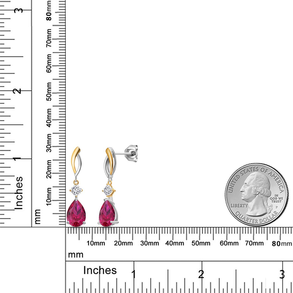 MEASUREMENTS: 10x7mm Pear Shape Heat-Treated Red Created Ruby, 3.5x3.5mm Cushion Near Colorless (GH) Moissanite. Total Carat Weight is 4.84 cttw