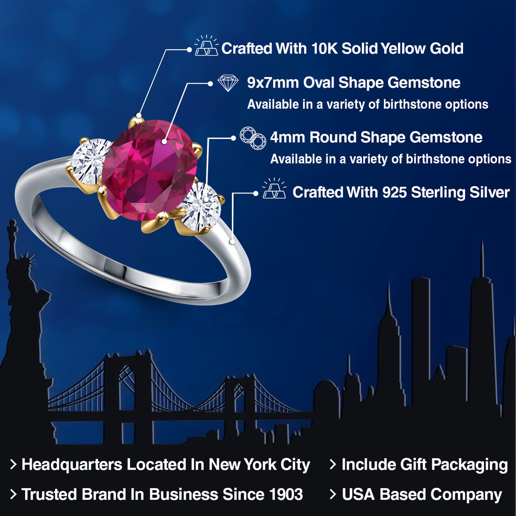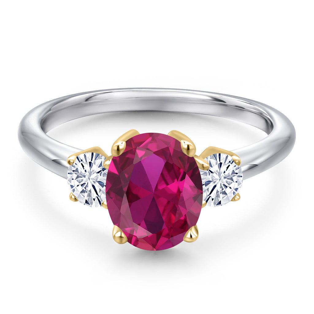 MEASUREMENTS: 9x7mm Oval Heat-Treated Red Created Ruby, 4x4mm Round Near Colorless (GH) Moissanite. Total Carat Weight is 2.46 cttw