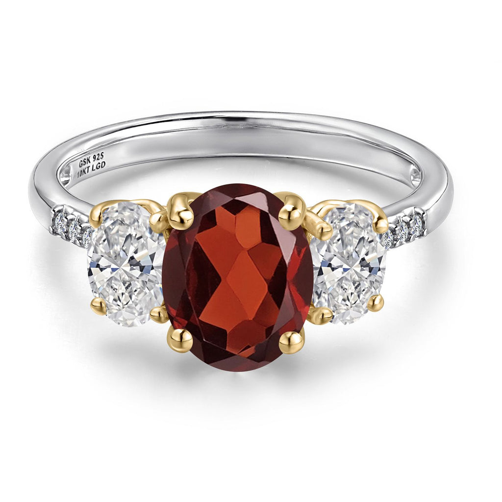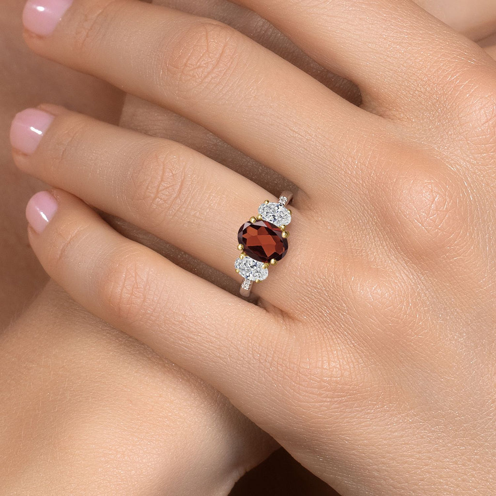 MEASUREMENTS: 9x7mm Oval Red Garnet, 6x4mm Oval DEF Lab Grown Diamond1, x, 1, mm Round E - F Lab Grown Diamond. Total Carat Weight is 3.19 cttw