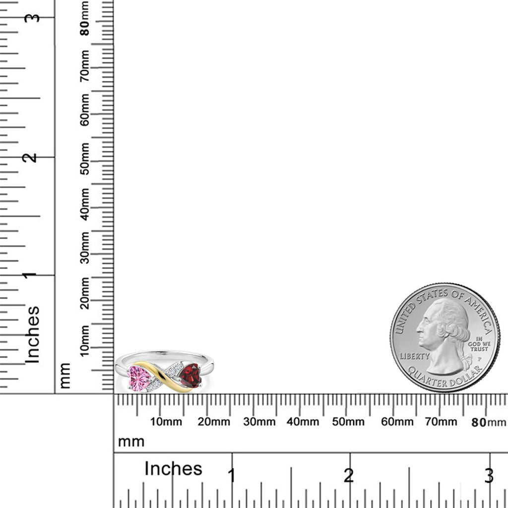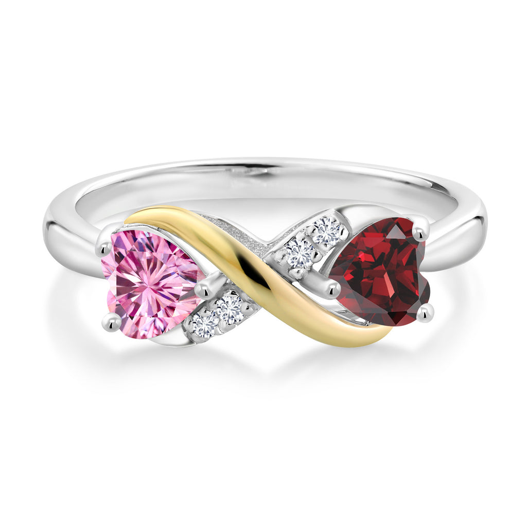 MEASUREMENTS: 5x5mm Heart Shape Coated Pink Moissanite, 5x5mm Heart Shape Red Garnet1.3, x, 1.3, mm Round E - F Lab Grown Diamond. Total Carat Weight is 1.14 cttw