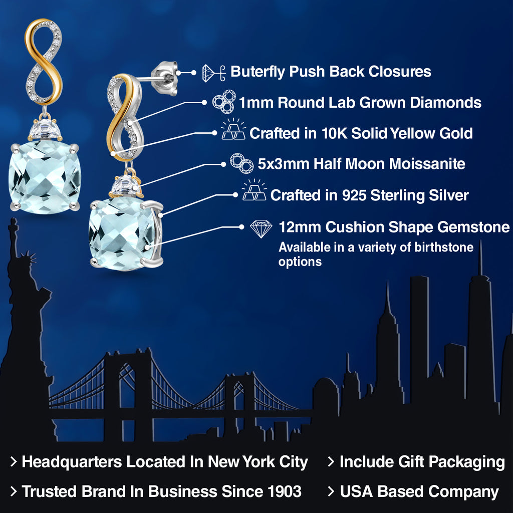 925 Silver and 10K Yellow Gold Sky Blue Simulated Aquamarine and Moissanite and White Lab Grown Diamond Dangle Earrings for Women | 12.52 Cttw | Gemstone March Birthstone | Cushion 12MM