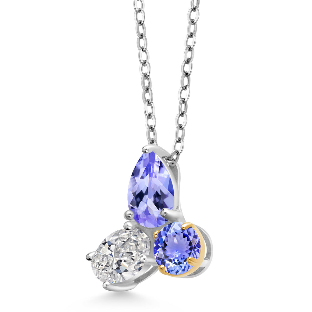 925 Silver and 10K Yellow Gold Tanzanite and Lab Grown Diamond 3 Stone Pendant Necklace for Women | 1.92 Cttw | December Birthstone | Pear Shape 8X6MM | Oval 7X5MM | Round 5MM | with 18 Inch Chain
