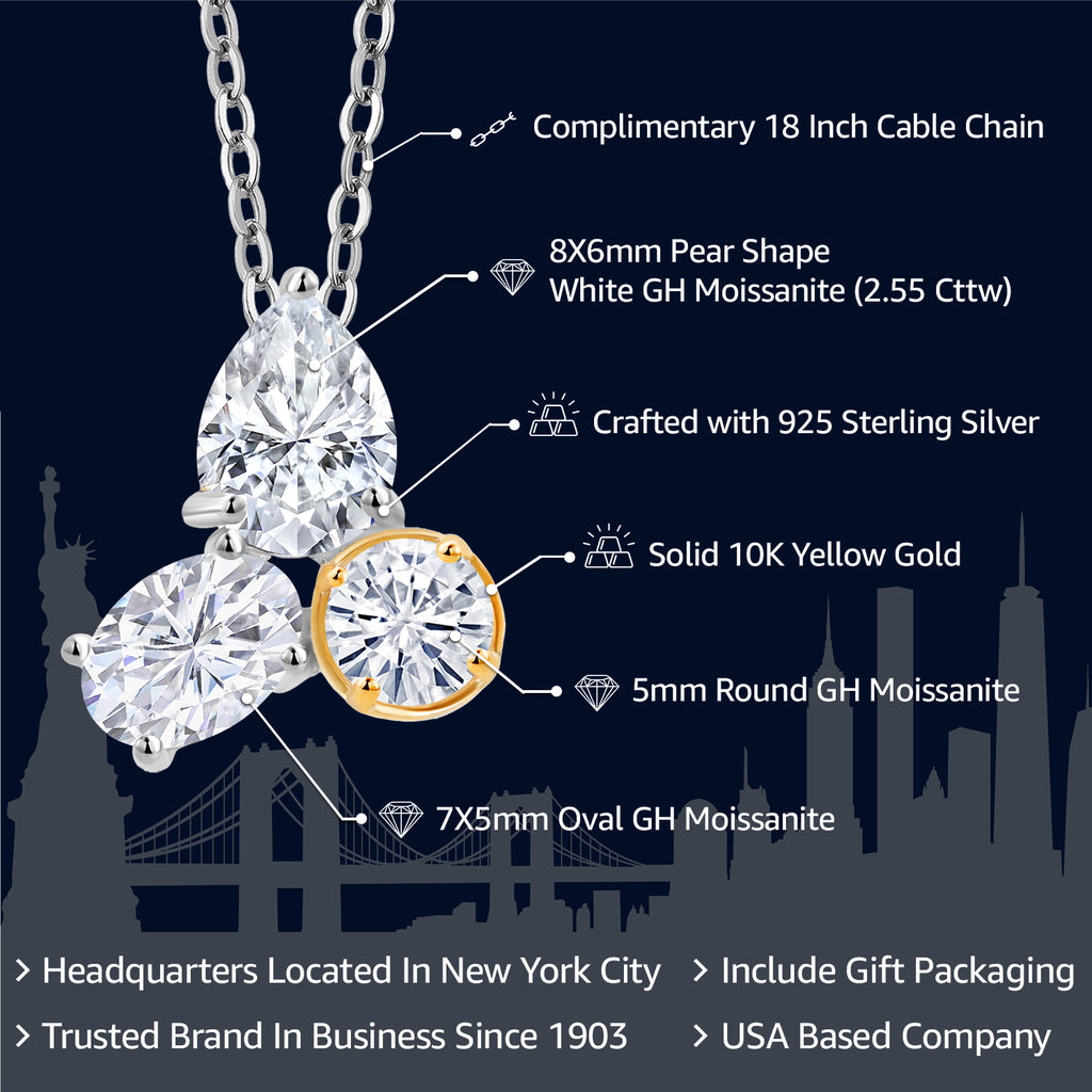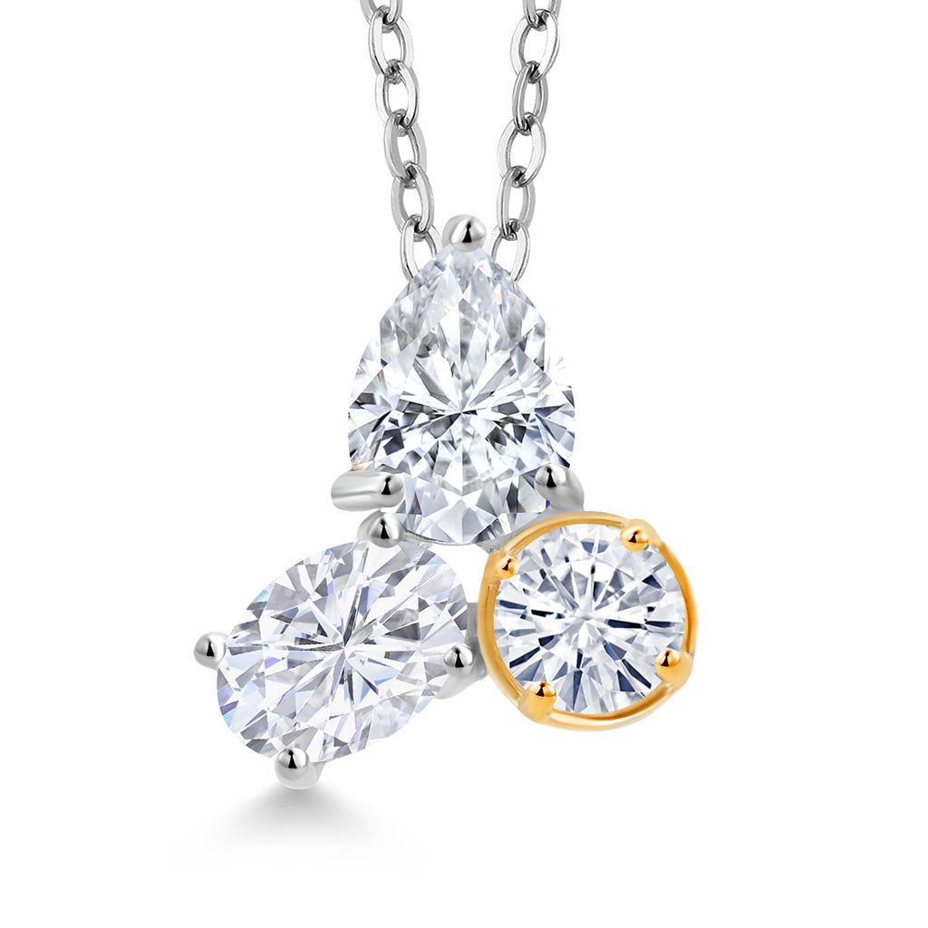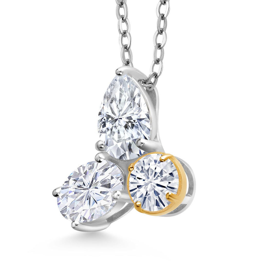 925 Silver and 10K Yellow Gold White Moissanite 3 Stone Pendant Necklace for Women | 2.55 Cttw | Gemstone Birthstone | Pear Shape 8X6MM | Oval 7X5MM | Round 5MM | with 18 Inch Chain