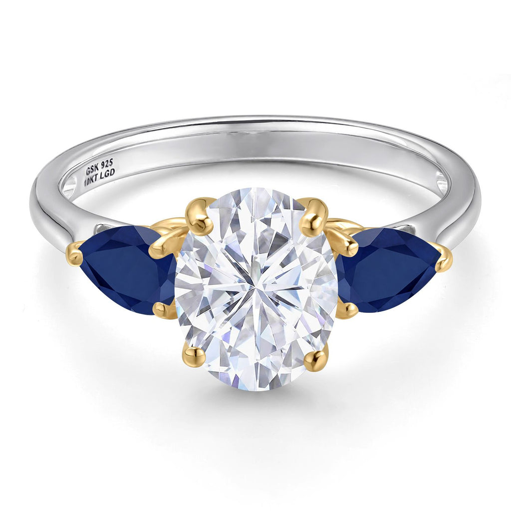 MEASUREMENTS: 9x7mm Oval Near Colorless (GH) Moissanite, 6x4mm Pear Shape Diffused Blue Sapphire. Total Carat Weight is 3.1 cttw